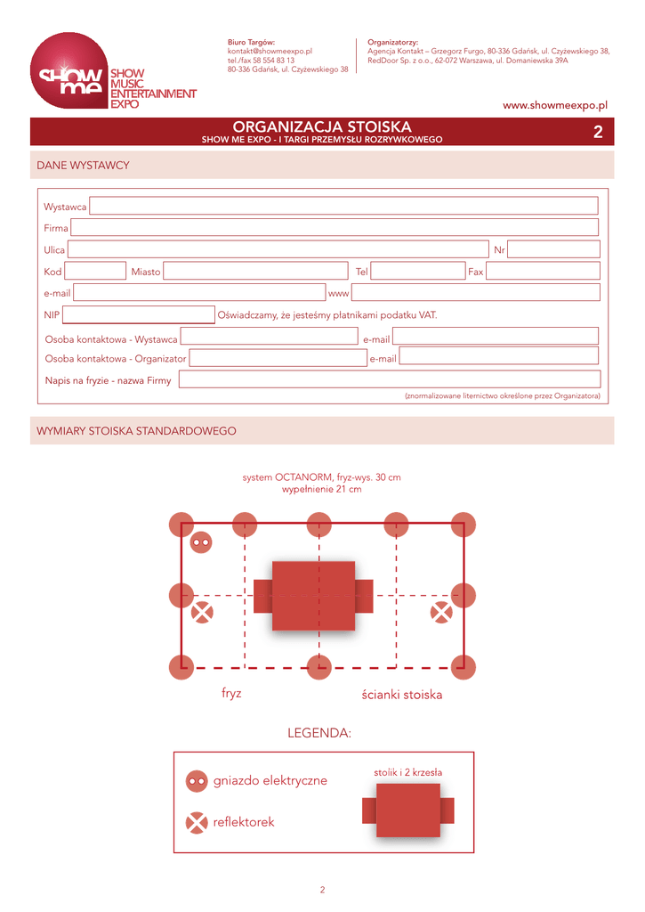 SHOW MUSIC ENTERTAINMENT EXPO Biuro Targów: [email protected] tel./fax 58 554 83 13 80-336 Gdańsk, ul. Czyżewskiego 38 Organizatorzy: Agencja Kontakt – Grzegorz Furgo, 80-336 Gdańsk, ul. Czyżewskiego 38, RedDoor Sp. z o.o., 62-072 Warszawa, ul. Domaniewska 39A www.showmeexpo.pl ORGANIZACJA STOISKA 2 SHOW ME EXPO - I TARGI PRZEMYSŁU ROZRYWKOWEGO DANE WYSTAWCY Wystawca Firma Ulica Kod Nr Miasto Tel e-mail NIP Fax www Oświadczamy, że jesteśmy płatnikami podatku VAT. Osoba kontaktowa - Wystawca e-mail Osoba kontaktowa - Organizator e-mail Napis na fryzie - nazwa Firmy (znormalizowane liternictwo określone przez Organizatora) WYMIARY STOISKA STANDARDOWEGO system OCTANORM, fryz-wys. 30 cm fryz LEGENDA: gniazdo elektryczne reflektorek 2 SHOW MUSIC ENTERTAINMENT EXPO Biuro Targów: [email protected] tel./fax 58 554 83 13 80-336 Gdańsk, ul. Czyżewskiego 38 Organizatorzy: Agencja Kontakt – Grzegorz Furgo, 80-336 Gdańsk, ul. Czyżewskiego 38, RedDoor Sp. z o.o., 62-072 Warszawa, ul. Domaniewska 39A WYMIARY STOISKA NIESTANDARDOWEGO m X m= m2 * - 2,3 lub 4 metry; W miarę możliwości technicznych Organizator realizuje zamówienia budowy następujących typów stoisk: A. B. 1m 1m Uwaga: własny projekt stoiska należy przesłać 20 dni przed terminem rozpoczęcia Targów. W przypadku braku projektu stoiska z wyrysowanym wyposażeniem dodatkowym, Organizator uznaje takie stoisko za standardowe. Jeżeli stoisko zostało zlecone do wykonania innej firmie lub zbudowane jest przez innego wykonawcę, należy bezwzględnie przesłać na adres Organizatora projekt graficzny i elektryczny stoiska w nieprzekraczalnym terminie do 20 dni przed otwarciem. Wyrażam zgodę na wprowadzenie do bazy danych i wielokrotne przetwarzanie moich danych osobowych obecnie i w przyszłości przez Organizatorów lub upoważnione przez nich instytucje (zgodnie z przepisami ustawy z dnia 29 sierpnia 1997r. o ochronie danych osobowych - Dz. U. Nr 101 z 2002r. poz. 926 z późniejszymi zmianami). Podpis osoby upoważnionej do reprezentowania firmy Data, miejscowość, pieczątka 2A