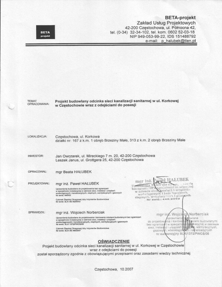 BETA-projekt ZakładUsługProjektowych 42.200częstochowa,u|.Północna42, tel.kom.060252-03-18 tel.(0-34)32-34-102, rDS 151488792 NIP 949-053-99-22, e-mail: [email protected] Ttt/A' sanitarnejw ul. Korkowej Proiektbudowlanyodcinkasieci kanalizacji oPMcoWANlĄ w Cięstochowie ńraz z odejściamido posesji LOKALIZACJA u]'Korkowa częstochowa' 313z k'm'2 obrębBrzezinyMałe nr:167z k'm'1 obrębBŻezinyMałe, działki INWESTORI Jan Owczarek,ul. Mifeckiego7 m' 20'42.200częstochowa Leszek Janus,ul.Grottgera25,42-200częstochowa mgr Beata HAŁt]BEK PRoJErroWAL: mgr inf' PaWełHALUBEK Up6fFń. vde {ryd buddłe do Prc]dj@n3fuNEnąeń bnaraqjiFh, cEprry mgrinż'WojciechNorberciak wodooiąąo9lch i hidżloyinych' cnorek Ś $tEi okĘgMjLby cbPrnych wentyhoyjnrh nłnee rir!!l ( !..i.]łi I galoqoi BdĄn@a raias/ag oŚWADczENIE Projektbudowlanyodcinkasieci kanalizacjisaniiarnejwul. Korkowejw CzęstochoWie do posesji Wrazz odejściarni przep]sami oraz zasadamjwiedzytechn]czneJ zgodnie z obowiązującyrni zostałsporządzony 102007 częstochowa. I OPIS OPRACOWANIA '1. Podstawaopracowania. j zakresopracowania - omówienieogó|ne. 2. Przedmiot 3. Rozwiązanie szczegołowe ' 4. lnformacja dotyczącaptanuBloZ 5. WpłtĄ^' inwestycji na środowisko lt czĘŚc RYSUNK9WA Rys.nr 1. Rys.nr 2. Rys' n.3' Rys.nr4. Rys.nr5. Rys.nr6. Rys.nr 7. Orientacja Projektplanuzagospodarcwania terenu. trasa siecikanalizacji sanitarnej ProJiIpodłużny odcinkasiecikana|ifacji sanitarnej ProfllepodłuŹne sięgaczysiecikana|izacji sanitarnej RysunekprzepuslDN 1,20m Studniarewizyjna Konstrukcja odtwoeenianawierzchni - skala 1:10000, - skala 1: I 000, . ska|a - ska|a ' skala - skala - skala ,1:100/500 ,1:100/100 1:200 1:25 -t III,PISM A PODSTAWOWE. UZGODNI ENIA 1. Decyzjao warunkach zabudowyi zagospodarowania terenudla realizacjiodcinkasiecikanalizacji sanitamejNr PP 1.7331-12-84107 z 28.08.24071 2. Warunkitechniczne,'WodociągóW częstochowskich'' s'A' nr 2021fir|aau2o07z dnia 23.04.20071 3. Uzgodnienie z Zespołem UzgodnieńDokumentacji Projektowejw częstochowie. z dnia28.09.2007r 3.1 Opinianr 855/07 4. Uzgodnienie z'Wodociągamiczęstochowskimi s.A'' potwierdzenie przyna|eżności 5. odpis upEwnieńprojektanta, do so||B w Kaiowicach' przyna|eżności 6. odpis uprawn'eń weMkatora.potlv|erdzenie do SoIlB W Katowicach. 7. PjsmoN,4iejskiego ZarząduDrógW częstochowie 1. Podstawaopracowania ą ą ą <, Ziecen]e' Aktua|namapasytuacyjno.Wysokościowa do celÓWprojektowych Uzgodnienia. Wizjelokalnew terenie ustaleniaustne - omówienieogó|ne. 2. Przedmioti zakresopracowania PŹedmioiem opTacowaniajest p|ojektbudow|anyodcinka siec] kanalizacjisanitarnejw u|icy (Wgranicachpasa drogowego)do poszczegó|nych posesji' KorkowejwcfęstochowieWrazz odejściami Trasa sieci zostałaWytyczonaw pobocfu u|' KorkowejW od|egłości 1'0rn od granicynawieŻchniu]icy. odcinekod Włączenia do studnis do ok.2-3mza studnląs1 przebiegaw nawierzchniasfa|towej' Zgodnie z Warunkamitechnicznymid|a przedmiotowejinwestycji projektowanąsieć kana|izacyjną z włączeniem do przewoduć0'20mw u]' KorkowejpoprzezWłączenie zap|ojektowano do istn]ejącej studni (s). 3' Rozwiązanieszczegółowe. 3.1Rury itychrodzajP typ ciężkis. łączonychza P-zewooyseci uliczne'wykolacz rL PVC {0'20rn(200/5,9mm) pomocąuszczeek gumowych'sięgaczedo posesjj wykonacf r!r tejsarnejk|asylecf o średnicach d0'15m (160/4,7mrn). 3.2studnierewizyjne'połączeniowe stlldnie rewizyjne(s1' s2' s3) Wykonaćz kręgów żelbetowychp1'20m Wg' rysunkuszczegółowego' że|iwneo0'60mk|asyD4o0 z Wypełnieniem betonowym'opańe Na studniachzamontowaćWłazykanałowe płycieżeIbetowej' studnjeWyposaŹyć w stopniezłazowe'Założono wykonaniestudni na prefabrykowanej że|betowych Wykonanychz betonu B45 łączonychna uszcze]kigumowe np produkcjifrmy Prefabet .K|ucfbork'studnie posadowićna fundamencieże]betowym g|ubości 30cm o średnicy o 50cmWiększejniż średnica zewnętrznastudni' wysokość 1,90mpomiędzystropempłytyi spocznikiemkinety'Dostosowanie W Śtudnifachowaćminima|ną 6' 8, 1ocmnp' Prefabet-Kluczbo|k. do rządnychterenuza pomocąkręgówWyrÓwnawczych pŻejść Połączenia z przewodam] PVc w studnlachwykonaćz zastosowaniem szczelnychtulejowych' 3.3 zabezpieczenie antykorozyjne elementów żelbetowych budowanego uzbrojenia W agresywnym środowiskugruntowym przewidfiano jego D|a trwałoścj zabefpleczyćantykorofyjnie zabezpieczenje'Kręgistudziennei pozostałe betonowee|ementy wg. PN-61/Bochronyw środowisku agres}ĄVnych Wód l gruntów'''Izo]acjeplzewidzianofa 062254'Warunki\'rykonania pomocąnałoŹenia (słuzących emu|sjikationowej do gruntowania ,'ERG' jako pierwsząwarshłypodkładowej podłoży pŻygotowaną podkładu warstwę i suchych z betonu)'Następniena tak naloŹyćWarstwę wilgotnych asfaltuizolacyjnego. 3.4 obmiar kanałusanitarnego. poektowanegokanałusanitarnegoć0'20mWynosiok 97'0 mb' Długość Dlugość sięgaczyo0,15mWynosiok' 34'0mb. 3.5' Przeszkody na trasie projektowanego kanałusanitarnego. Przeszkodamina kasie są e|ementyistnlejącegoufbrojeniaterenu' Wykonawcazobowiązanyjest we wszystkichmiejscach skrzyżowańistniejącego ufbrcjeniaz projektowaną siecią do WykonaniaprzekopóW kontrolnych'pohvierdfających stan przyjętyW projekciena podstawiemap syluacyjno-WysokoŚciowych. WszystkiepEeszkodyna trasiena|eŻyzabezpieczycprzedich uszkodzeniem' Istniejąceprzewody krzyżującesję projektowanakanaIizacjąsanltarną zabezpeczyć w sposób ich prawidlowąeksp|oatacjąPzewody energetyczneNN i te|etechniczne zabezp]eczyć umoż|iw]ający 3.0m' Przewody ene|getyczneWN rurami och|onnymidwlldzienymi Arot typ Ps p100mm długości zabezpieczyćruramiochronnymidwudfie|nymArotiypPsp150mnrd]ugości3,0mnakażdymkab|u. zwrócićna zb|iŹenje do reperówgeodezyjnych'prawniechronionych, na wysokości sczegÓLnąuwagęna|eży studni51. 3.6WaIunki geoIogiczno inżynierskie D|apŻedmiotowego op|acowanianie byłyWykonywane podłoia.Zakładasię badanjahydrogeol09]cz