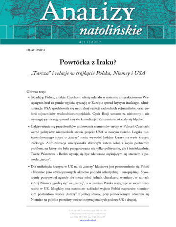 1 4(17)2007 OLAF OSICA Powtórka z Iraku? „Tarcza” i relacje w trójkącie Polska, Niemcy i USA Główne tezy: Składając Polsce, a także Czechom, ofertę udziału w systemie antyrakietowym Wa- szyngton brał za punkt wyjścia sytuację w Europie sprzed kryzysu irackiego. administracja USA spodziewała się neutralnej reakcji zachodnich sojuszników, oraz euforii sojuszników wschodnioeuropejskich. Opór Rosji uznano za nieistotny i nie wymagający niczego ponad zwykłe konsultacje. Założenia te okazały się błędne. Uaktywnienie się przeciwników ulokowania elementów tarczy w Polsce i Czechach wśród polityków niemieckich stawia projekt USA w nowym świetle. Logika niekontrolowanego sporu o „tarczę” może wywołać kolejny kryzys na wzór kryzysu irackiego. Administracja amerykańska stworzyła zatem sobie i swym partnerom problem, na który nie była przygotowana nie tylko politycznie, ale i intelektualnie. Także Warszawa i Berlin wydają się być zdziwione szykującym się starciem z powodu „tarczy”. Dla uniknięcia kryzysu w UE na tle „tarczy” kluczowe jest porozumienie się Polski i Niemiec jako równoprawnych aktorów polityki atlantyckiej i europejskiej. Stworzenie pozytywnej agendy nie może mieć jednak charakteru wymiany, w ramach której Niemcy „godzą się” na „tarczę”, a w zamian Polska rezygnuje ze swych interesów w UE. Mogłaby ona natomiast zakładać wyjście Polski naprzeciw niemieckim postulatom wobec „tarczy” z jednej strony, przy jednoczesnym otwarciu się Niemiec na polskie postulaty wobec instytucjonalnych podstaw UE z drugiej. CENTRUM EUROPEJSKIE NATOLIN ul. Nowoursynowska 84, 02-797 Warszawa tel: 48 22 54 59 800· fax: 48 22 646 12 99 www.natolin.edu.pl 2 „Wśród serdecznych przyjaciół psy zająca zjadły.” Bp. Ignacy Krasicki olityczna cena budowy w Europie elementów amerykańskiego systemu obrony P przeciwrakietowej („tarczy”) rośnie. Już nie tylko Rosja dostrzega w amerykańskich planach zagrożenie dla ładu i stabilności w Europie i w świecie. W su- kurs prezydentowi Putinowi, który podczas 43 konferencji bezpieczeństwa w Monachium wygłosił ostrą krytykę polityki USA i UE 1 , przyszli politycy współrządzącej Niemcami SPD. Szef niemieckiej dyplomacji, Frank Steinmaier, a także przewodniczący SPD, Kurt Beck skrytykowali plany administracji amerykańskiej jako prowadzące do nowych podziałów w Europie, a także wyścigu zbrojeń. 2 Ostrzeżenia przed ta- kim obrotem pojawiają się także w prasie niemieckiej, 3 która zachowuje jednak wyważony obraz problemu. 4 1. W stronę kolejnego kryzysu? Uaktywnienie się przeciwników ulokowania elementów tarczy w Polsce i Czechach wśród polityków niemieckich stawia projekt USA w nowym świetle. Zwiększa się prawdopodobieństwo odżycia podziału na „starą” i „nową” Europę, mimo że po obu stronach Atlantyku panuje (przynajmniej oficjalnie) przekonanie, iż tego rodzaju „awantury” nie przynoszą wymiernych korzyści żadnej ze stron, natomiast skutecznie i trwale uderzają w fundament polityczny Unii i NATO. Narastający spór dotyka z jednej strony politycznych podstaw bezpieczeństwa Europy (tj. pytania kto i w jakim stopniu może decydować o tym co leży w interesie bezpieczeństwa kontynentu). Z drugiej strony, dyskusja ponownie nabiera cech debaty o tożsamości politycznej Europy, a zatem stosunku do USA. „Sprzeciw większości socjaldemokratów wobec „tarczy” można interpretować w kategoriach wzmacniania wizerunku tego ugrupowania jako „partii pokoju”, a nawet jako zwiastun tematu przyszłej kampanii wyborczej w RFN.” 5 Prawdopodobieństwo, że Polska, Niemcy i USA wejdą w swe role z okresu kryzysu irackiego jest zatem niezwykle duże. Główną przyczyną jest ciągłość we wzajemnym CENTRUM EUROPEJSKIE NATOLIN ul. Nowoursynowska 84, 02-797 Warszawa tel: 48 22 54 59 800· fax: 48 22 646 12 99 www.natolin.edu.pl 3 postrzeganiu się wspomnianej trójki. Dominuje w nim instrumentalne podejście i przedkładanie taktyki nad kwestie strategiczne. Nową jakością mogącą znacząco wpłynąć na ostateczny wynik sporu jest kanclerz Angela Merkel, która w Waszyngtonie wydaje się być postrzegana jako kontynuatorka spuścizny Prawdopodobieństwo, że Polska, Niemcy i USA wejdą Helmuta Kohla w nowym kontekście stosunków transatlantyc- w swe role z okresu kich. W zależności od dalszego rozwoju sytuacji nie osłabianie kryzysu irackiego jest pozycji kanclerz Merkel może stać się dla USA równie ważnym niezwykle duże. celem co zdobycie zgody Polski i Czech na budowę elementów Główną przyczyną „tarczy”. Oznaczałoby to prawdopodobnie istotne ograniczenie korzyści politycznych i militarnych, które Polska może otrzymać od USA za udostępnienie swego terytorium pod silosy z jest ciągłość we wzajemnym postrzeganiu rakietami. Spór polsko-niemiecki – wywołany inicjatywą ame- się wspomnianej trój- rykańską – może zaś nie tylko zaprzepaścić szanse na reformę ki. instytucji UE, ale i postępy w kształtowaniu wspólnego stanowiska Unii wobec Rosji. Uniknięcie takiego scenariusza powinno być priorytetem wszystkich zainteresowanych stron. Zwłaszcza, że sam przedmiot sporu, „tarcza”, jest - jak pisał Stephen Larabee z RAND Corporation - prototypem, którego efektywność i niezawodność musi być dopiero sprawdzona, ponieważ dotychczasowe testy nie pozwalają na ocenę jego działania w realnych warunkach. 6 W takiej sytuacji, ryzykowanie nowej odsłony kryzysu w relacjach atlantyckich, którego skutki trudno dziś oszacować, jest działaniem pozbawionym sensu. 2. Polska, Niemcy, USA – nowy kontekst polityczny 2.1. Polska W Polsce trwa proces przewartościowań w myśleniu o relacjach dwustronnych z USA. Jego główną cechą jest demitologizacja wzajemnej współpracy. Wyraźne jest odejście od „barokowego” stylu i języka opisu tych stosunków polsko-amerykań