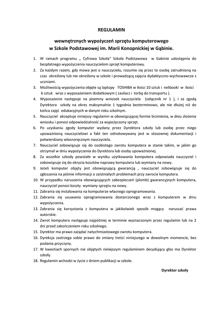 REGULAMIN wewnętrznych wypożyczeń sprzętu komputerowego w Szkole Podstawowej im. Marii Konopnickiej w Gąbinie. 1. W ramach programu ,, Cyfrowa Szkoła” Szkoła Podstawowa w Gabinie udostępnia do bezpłatnego wypożyczenia nauczycielom sprzęt komputerowy. 2. Za każdym razem, gdy mowa jest o nauczycielu, rozumie się przez to osobę zatrudnioną na czas określony lub nie określony w szkole i prowadzącą zajęcia dydaktyczno-wychowawcze z uczniami. 3. Możliwością wypożyczenia objęte są laptopy TOSHIBA w ilości 10 sztuk i netbooki w ilości 6 sztuk wraz z wyposażeniem dodatkowym ( zasilacz i torbą do transportu ). 4. Wyposażenie następuje na pisemny wniosek nauczyciela (załącznik nr 1 ), i za zgodą Dyrektora szkoły na okres maksymalnie 1 tygodnia bezterminowo, ale nie dłużej niż do końca zajęć edukacyjnych w danym roku szkolnym. 5. Nauczyciel akceptuje niniejszy regulamin w obowiązującej formie brzmienia, w dniu złożenia wniosku i ponosi odpowiedzialność za wypożyczony sprzęt. 6. Po uzyskaniu zgody komputer wydany przez Dyrektora szkoły lub osobę przez niego upoważnioną nauczycielowi a fakt ten odnotowywany jest w stosownej dokumentacji i potwierdzany własnoręcznym nauczyciela. 7. Nauczyciel zobowiązuje się do osobistego zwrotu komputera w stanie takim, w jakim go otrzymał w dniu wypożyczenia do Dyrektora lub osoby upoważnionej. 8. Za wszelkie szkody powstałe w wyniku użytkowania komputera odpowiada nauczyciel i zobowiązuje się do okrycia kosztów naprawy komputera lub wymiany na nowy. 9. Jeżeli komputer objęty jest obowiązującą gwarancją , nauczyciel zobowiązuje się do zgłoszenia na piśmie informacji o zaistniałych problemach przy zwrocie komputera. 10. W przypadku naruszenia obowiązujących zabezpieczeń (plomb) gwarancyjnych komputera, nauczyciel ponosi koszty wymiany sprzętu na nowy. 11. Zabrania się instalowania na komputerze własnego oprogramowania. 12. Zabrania się usuwania oprogramowania dostarczonego wraz z komputerem w dniu wypożyczenia. 13. Zabrania się korzystania z komputera w jakikolwiek sposób mogący naruszać prawa autorskie. 14. Zwrot komputera następuje najpóźniej w terminie wyznaczonym przez regulamin lub na 2 dni przed zakończeniem roku szkolnego. 15. Dyrektor ma prawo zażądać natychmiastowego zwrotu komputera. 16. Dyrekcja zastrzega sobie prawo do zmiany treści niniejszego w dowolnym momencie, bez podania przyczyny. 17. W kwestiach spornych nie objętych niniejszym regulaminem decydujący głos ma Dyrektor szkoły. 18. Regulamin wchodzi w życie z dniem publikacji w szkole. Dyrektor szkoły