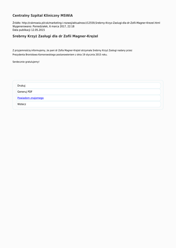 Centralny Szpital Kliniczny MSWiA Źródło: http://cskmswia.pl/csk/marketing-i-rozwoj/aktualnosci/12559,Srebrny-Krzyz-Zaslugi-dla-dr-Zofii-Magner-Krezel.html Wygenerowano: Poniedziałek, 6 marca 2017, 22:18 Data publikacji 12.05.2015 Srebrny Krzyż Zasługi dla dr Zofii Magner-Krężel Z przyjemnością informujemy, że pani dr Zofia Magner-Krężel otrzymała Srebrny Krzyż Zasługi nadany przez Prezydenta Bronisława Komorowskiego postanowieniem z dnia 19 stycznia 2015 roku. Serdecznie gratulujemy! Drukuj Generuj PDF Powiadom znajomego Wstecz