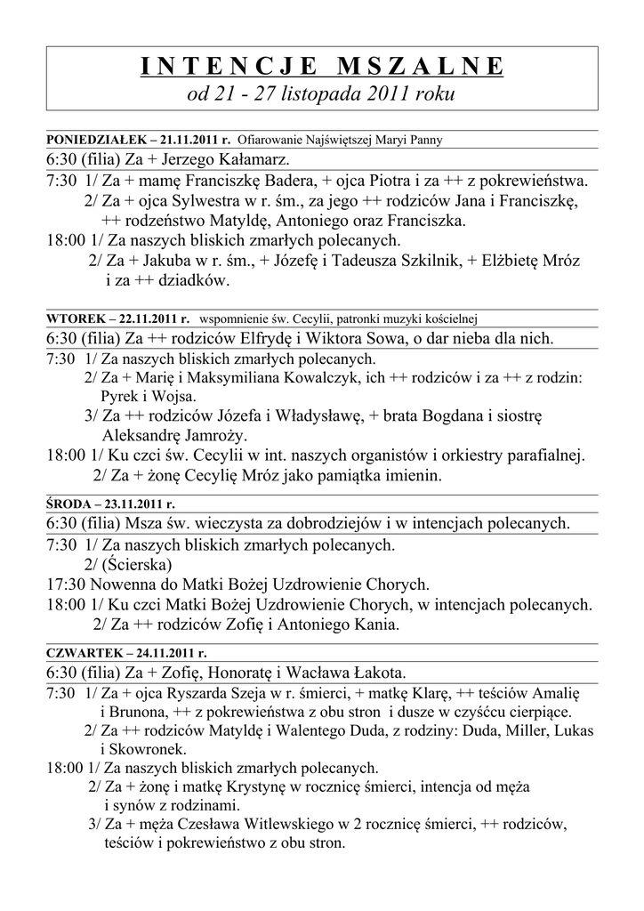 Intencje mszalne od 21 - 27 listopada 2011 roku
