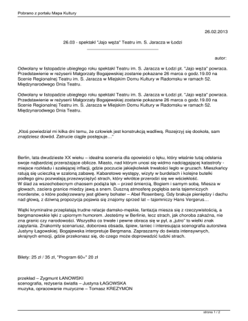 Pobrano z portalu Mapa Kultury 26.02.2013 26.03 - spektakl "Jajo węża" Teatru im. S. Jaracza w Łodzi ____________________________ autor: Odwołany w listopadzie ubiegłego roku spektakl Teatru im. S. Jaracza w Łodzi pt. "Jajo węża" powraca. Przedstawienie w reżyserii Małgorzaty Bogajewskiej zostanie pokazane 26 marca o godz.19.00 na Scenie Regionalnej Teatru im. S. Jaracza w Miejskim Domu Kultury w Radomsku w ramach 52. Międzynarodwego Dnia Teatru. Odwołany w listopadzie ubiegłego roku spektakl Teatru im. S. Jaracza w Łodzi pt. "Jajo węża" powraca. Przedstawienie w reżyserii Małgorzaty Bogajewskiej zostanie pokazane 26 marca o godz.19.00 na Scenie Regionalnej Teatru im. S. Jaracza w Miejskim Domu Kultury w Radomsku w ramach 52. Międzynarodwego Dnia Teatru. „Ktoś powiedział mi kilka dni temu, że człowiek jest konstrukcją wadliwą. Rozejrzyj się dookoła, sam znajdziesz dowód. Zatrucie ciągle postępuje…” Berlin, lata dwudzieste XX wieku – idealna sceneria dla opowieści o lęku, który właśnie tutaj odsłania swoje najbardziej przerażające oblicze. Miasto, nad którym unosi się widmo nadciągającej katastrofy miejsce rozkładu i szalejącej inflacji, gdzie poczucie jakiejkolwiek trwałości legło w gruzach. Mieszkańcy ratują się ucieczką w szaloną zabawę. Kabaretowe występy, wizyty w burdelach i kolejne butelki podłego ginu pozwalają przezwyciężyć strach, który wkrótce przerodzi się we wściekłość. W ślad za wszechobecnym chaosem podąża lęk – przed śmiercią, Bogiem i samym sobą. Miesza w głowach, zaciera granice miedzy jawą a snem. Duszną atmosferę pogłębia seria tajemniczych morderstw, o które podejrzewany jest główny bohater – Abel Rosenberg. Gdy brakuje pieniędzy i dachu nad głową, z dziwną propozycja pojawia się znajomy sprzed lat – tajemniczy Hans Vergerus… Wątki kryminalne przeplatają trudne relacje damsko-męskie, fantazja miesza się z rzeczywistością, a bergmanowskie lęki z upiornym humorem. Jesteśmy w Berlinie, lecz strach, jak choroba zakaźna, nie zna granic czy narodowości. Wszystko co trwałe i pewne obraca się w pył, a „jutro” to wielki znak zapytania. Znakomity scenariusz, doborowa obsada, śpiew, taniec i interesująca scenografia autorstwa Justyny Łagowskiej. Bogajewska interpretuje Bergmana. Zapraszamy do świata intensywnych, skrajnych emocji, gdzie przekonasz się, do czego może doprowadzić ludzki strach. Bilety: 25 zł / 35 zł, "Program 60+" 20 zł przekład – Zygmunt ŁANOWSKI scenografia, reżyseria światła – Justyna ŁAGOWSKA muzyka, opracowanie muzyczne – Tomasz KREZYMON strona 1 / 2 Pobrano z portalu Mapa Kultury choreografia – Jacek WAZELIN asystent reżysera, inspicjent – Marta BARASZKIEWICZ OBSADA Abel Rosenberg – Michał STASZCZAK Manuela - Katarzyna CYNKE Bauer - Andrzej WICHROWSKI Szefowa – Milena LISIECKA Maks, Żołnierz, Monroe – Marcin WŁODARSKI Fraulain Dorst, Rebeka, Służąca – Dorota KIEŁKOWICZ Hollinger, Ksiądz, Żołnierz – Mariusz SŁUPIŃSKI Hans Vergerus - Mariusz JAKUS Frau Holle, Stella – Izabela NOSZCZYK Doktor Soltermann – Mariusz SIUDZIŃSKI Żołnierz, Chiquita, Mikaela – Marcin ŁUCZAK strona 2 / 2