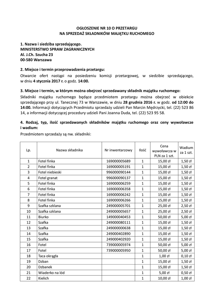 OGŁOSZENIE NR 10 O PRZETARGU NA SPRZEDAŻ SKŁADNIKÓW MAJĄTKU RUCHOMEGO 1. Nazwa i siedziba sprzedającego. MINISTERSTWO SPRAW ZAGRANICZNYCH Al. J.Ch. Szucha 23 00-580 Warszawa 2. Miejsce i termin przeprowadzenia przetargu: Otwarcie ofert nastąpi na posiedzeniu komisji przetargowej, w siedzibie sprzedającego, w dniu 4 stycznia 2017 r. o godz. 14:00. 3. Miejsce i termin, w którym można obejrzeć sprzedawany składnik majątku ruchomego: Składniki majątku ruchomego będące przedmiotem przetargu można obejrzeć w obiekcie sprzedającego przy ul. Tanecznej 73 w Warszawie, w dniu 28 grudnia 2016 r. w godz. od 12:00 do 14:00. Informacji dotyczących Przedmiotu sprzedaży udzieli Pan Marcin Mędrzycki, tel. (22) 523 86 14, a informacji dotyczącej procedury udzieli Pani Joanna Duda, tel. (22) 523 95 58. 4. Rodzaj, typ, ilość sprzedawanych składników majątku ruchomego oraz ceny wywoławcze i wadium: Przedmiotem sprzedaży są nw. składniki: Lp. 1 2 3 4 5 6 7 8 9 10 11 12 13 14 15 16 17 18 19 20 21 22 Nazwa składnika Fotel finka Fotel finka Fotel niebieski Fotel granat Fotel finka Fotel finka Fotel finka Fotel finka Szafka szklana Szafka szklana Biurko Szafka Szafka Szafka Szafka Fotel Fotel Taca okrągła Dzban Dzbanek Wiaderko na lód Kielich Nr inwentarzowy Ilość 169000005689 169000005191 996000090144 996000090137 169000006259 169000006358 169000006242 169000006266 249000005701 249000005657 149000040453 249000080111 249000000638 249000402890 249000402920 739000005974 739000005950 1 1 1 1 1 1 1 1 1 1 1 1 1 1 1 1 1 1 1 1 1 1 Cena Wadium wywoławcza w za 1 szt. PLN za 1 szt. 15,00 zł 1,50 zł 15,00 zł 1,50 zł 15,00 zł 1,50 zł 15,00 zł 1,50 zł 15,00 zł 1,50 zł 15,00 zł 1,50 zł 15,00 zł 1,50 zł 15,00 zł 1,50 zł 25,00 zł 2,50 zł 25,00 zł 2,50 zł 50,00 zł 5,00 zł 15,00 zł 1,50 zł 15,00 zł 1,50 zł 15,00 zł 1,50 zł 15,00 zł 1,50 zł 50,00 zł 5,00 zł 50,00 zł 5,00 zł 1,00 zł 0,10 zł 15,00 zł 1,50 zł 15,00 zł 1,50 zł 5,00 zł 0,50 zł 10,00 zł 1,00 zł Lp. Nazwa składnika 23 Dzban z przykrywką Zestaw multimedialny PlayStation 3. W skład zestawu wchodzą: konsola z wbudowanym dyskiem twardym - 40 Gb, okablowanie, bezprzewodowy pad SIXAXIS Książka kancelaryjna Mównica fornirowana Mównica fornirowana 24 25 26 27 Nr inwentarzowy Ilość 3 12-278 6609000001228 6609000001075 Cena Wadium wywoławcza w za 1 szt. PLN za 1 szt. 15,00 zł 1,50 zł 1 250,00 zł 25,00 zł 698 1 1 1,00 zł 250,00 zł 250,00 zł 0,10 zł 25,00 zł 25,00 zł 5. Wysokość wadium oraz termin i miejsce jego wniesienia: 1. Warunkiem przystąpienia do przetargu jest wniesienie wadium w wysokości 10% ceny wywoławczej sprzedawanego składnika rzeczowego majątku ruchomego. 2. Wadium należy wpłacić na konto sprzedającego o numerze 39101010100007361391200000. 3. Wadium musi być wniesione przed upływem terminu składania ofert, wyłącznie w formie pieniężnej. 4. Wadium złożone przez oferentów, których oferty nie zostały wybrane lub zostały odrzucone, sprzedający zwróci w terminie 7 dni, odpowiednio od dnia dokonania wyboru lub odrzucenia oferty. 5. Wadium złożone przez nabywcę zalicza się na poczet ceny. 6. Wadium nie podlega zwrotowi w przypadku, gdy oferent, który wygrał przetarg, uchyli się od zawarcia umowy sprzedaży. 6. Oferta złożona w przetargu powinna zawierać: 1. imię i nazwisko, adres lub nazwę (firmę) i siedzibę oferenta, telefon kontaktowy, e-mail, NIP, Regon; 2. określony składnik majątku na jaki złożona jest oferta (nazwa, numer pozycji w ogłoszeniu, numer inwentarzowy, jeżeli podano w ogłoszeniu), oferowaną cenę za składnik majątku ruchomego objętego przedmiotem przetargu (nie niższą niż cena wywoławcza) i warunki jej zapłaty (przelew lub płatność gotówką); 3. oświadczenie oferenta, że zapoznał się ze stanem przedmiotu przetargu lub że ponosi odpowiedzialność za skutki wynikające z rezygnacji z oględzin; 4. oryginał lub kserokopię (poświadczoną za zgodność z oryginałem) dowodu wpłaty lub poleceniem przelewu wniesionego wadium (uwaga: wadium musi być na koncie Sprzedającego przed upływem terminu składania ofert); 5. oświadczenie oferenta na jaki numer konta ma zostać zwrócone wadium; 6. w przypadku przystąpienia do przetargu osoby prawnej należy do oferty dołączyć aktualny odpis z właściwego rejestru, wystawiony nie wcześniej niż 6 miesięcy przed upływem terminu składania ofert, a w przypadku przedsiębiorcy informację o wpisie do CEIDG. 7. Termin, miejsce i tryb złożenia oferty 1. Ofertę wraz z wymaganymi dokumentami należy złożyć w zaklejonej kopercie. 2. Koperta musi być zaadresowana wg poniższego wzoru: 3. 4. 5. 6. Ministerstwo Spraw Zagranicznych Biuro Administracji Al. J.Ch.Szucha 23 00-580 Warszawa Na kopercie powinien znajdować się napis: „Oferta w przetargu na sprzedaż składników majątku ruchomego. Nie otwierać do dnia 4 stycznia 2017 r. do godz. 14:00. Dotyczy Ogłoszenia nr 10.”; Oferty pisemne należy składać w dni robocze (pon. -pt.) w godz. 9:00-15:30, nie później niż do dnia 4 stycznia 2017 r. do godz. 12:00 na Dzienniku Podawczym w siedzibie sprzedającego przy Al. J.Ch. Szucha 21 w Warszawie. Oferta jest wiążąca przez 14 dni. Organizatorowi przetargu przysługuje prawo zamknięcia przetargu bez wybrania którejkolwiek z ofert bez podania przyczyn. 8. Odrzucenie oferty 1. Komisja przetargowa odrzuca ofertę, jeżeli: 1. została złożona po wyznaczonym terminie, w niewłaściwym miejscu lub przez oferenta, który nie wniósł wadium; 2. nie zawiera danych i dokumentów, o których mowa w pkt. 6 („Oferta złożona w przetargu powinna zawierać”) lub są one niekompletne, nieczytelne lub budzą wątpliwość, zaś złożenie wyjaśnień mogłoby prowadzić do uznania jej za nową ofertę; 2. O odrzuceniu oferty Komisja Przetargowa zawiadamia niezwłocznie oferenta. 9. Inne informacje: 1. Przetarg jest prowadzony zgodnie z Rozpor