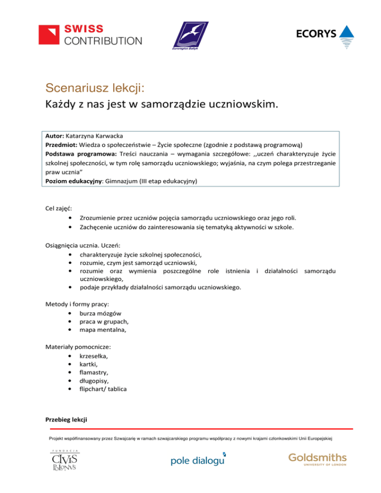 Scenariusz lekcji: Każdy z nas jest w samorządzie uczniowskim. Autor: Katarzyna Karwacka Przedmiot: Wiedza o społeczeństwie – Życie społeczne (zgodnie z podstawą programową) Podstawa programowa: Treści nauczania – wymagania szczegółowe: ,,uczeń charakteryzuje życie szkolnej społeczności, w tym rolę samorządu uczniowskiego; wyjaśnia, na czym polega przestrzeganie praw ucznia” Poziom edukacyjny: Gimnazjum (III etap edukacyjny) Cel zajęć: • • Zrozumienie przez uczniów pojęcia samorządu uczniowskiego oraz jego roli. Zachęcenie uczniów do zainteresowania się tematyką aktywności w szkole. Osiągnięcia ucznia. Uczeń: • charakteryzuje życie szkolnej społeczności, • rozumie, czym jest samorząd uczniowski, • rozumie oraz wymienia poszczególne role istnienia i działalności samorządu uczniowskiego, • podaje przykłady działalności samorządu uczniowskiego. Metody i formy pracy: • burza mózgów • praca w grupach, • mapa mentalna, Materiały pomocnicze: • krzesełka, • kartki, • flamastry, • długopisy, • flipchart/ tablica Przebieg lekcji Projekt współfinansowany przez Szwajcarię w ramach szwajcarskiego programu współpracy z nowymi krajami członkowskimi Unii Europejskiej fundacja civis polonus www.civispolonus.org.pl I Faza wprowadzająca – 10 minut Przywitaj uczniów i zapisz na środku flipczarta słowo: samorządzenie. Oddziel kreską człon ,,samo’’ od ,,rządzenie’’. Zaproś ich do wspólnego zastanowienia się, z czym kojarzy im się słowo ,,rządzenie’’. Swoje pomysły niech wpisują wokół hasła. Warto dopilnować, aby padło jak najwięcej skojarzeń. Przykładowa mapa skojarzeń ( załącznik 1) II Faza realizacyjna – czas: 20 minut • Zapytaj uczniów, czy w ich szkole istnieje i działa samorząd uczniowski. Jeżeli tak, to poproś, aby wyjaśnili, czym on jest i jakimi sprawami się zajmuje. Możliwe, że uczniowie jako samorząd uczniowski postrzegają jego reprezentację. Wyjaśnij, że zgodnie z prawem samorządem uczniowskim są wszyscy uczniowie w szkole. Podkreśl, że wszyscy uczniowie mają prawo do wpływania na to, co się dzieje w ich otoczeniu szkolnym. (Zapis ustawy o systemie oświaty art. 55 w załączniku nr 2.) • Korzystając z notatek zapisanych na flipcharcie zapytaj uczniów, czy wiedzą, kto rządzi w szkole? Wspólnie z uczniami omów pojęcia: władza, podejmowanie decyzji, lider i jego cechy. Jeżeli uczniowie nie będą mieli pomysłu, zapisz na flipcharcie hasła: dyrekcja, nauczyciele, uczniowie. Podziel uczniów na trzy grupy i poproś, aby wspólnie zastanowili się w grupach, jak te osoby wpływają na szkołę i jak w niej rządzą. • Poproś, aby przedstawiciel każdej grupy zaprezentował wyniki dyskusji. Zapytaj uczniów, w jaki sposób i w jakich kwestiach chcieliby, aby organy samorządu uczniowskiego reprezentowały interesy uczniów. III Faza podsumowująca - czas: 15 minut • Zapytaj uczniów, co według nich należy w szkole zrobić, żeby samorząd uczniowski rzeczywiście współrządził? Zachęć uczniów do dyskusji na ten temat. Zapiszcie pomysły w jednym dokumencie i jego kopie przekażcie do reprezentacji samorządu uczniowskiego oraz do dyrekcji. Te pomysły mogą być wykorzystane przy aktualizacji/ulepszaniu regulaminu samorządu uczniowskiego. • Podkreśl, że istnienie i sprawne działanie samorządu uczniowskiego nie powinno ograniczać się do kilku podstawowych aktywności. Warto, aby cały samorząd (wszyscy uczniowie) aktywnie włączali się w różne przedsięwzięcia. Podziękuj za udział w lekcji. 2 fundacja civis polonus www.civispolonus.org.pl Załącznik nr 1 Przykład mapy skojarzeń decyzyjność wpływ kierowanie Samorządzenie planowanie współpraca Podział zadań odpowiedzialność 3 fundacja civis polonus www.civispolonus.org.pl Załącznik nr 2: Ustawa o systemie oświaty Art. 55. 1. W szkole i placówce działa samorząd uczniowski, zwany dalej „samorządem". 2. Samorząd tworzą wszyscy uczniowie szkoły lub placówki. 3. Zasady wybierania i działania organów samorządu określa regulamin uchwalany przez ogół uczniów w głosowaniu równym, tajnym i powszechnym. Organy samorządu są jedynymi reprezentantami ogółu uczniów. 4. Regulamin samorządu nie może być sprzeczny ze statutem szkoły lub placówki. 5. Samorząd może przedstawiać radzie szkoły lub placówki, radzie pedagogicznej oraz dyrektorowi wnioski i opinie we wszystkich sprawach szkoły lub placówki, w szczególności dotyczących realizacji podstawowych praw uczniów, takich jak: 1) prawo do zapoznawania się z programem nauczania, z jego treścią, celem i stawianymi wymaganiami; 2) prawo do jawnej i umotywowanej oceny postępów w nauce i zachowaniu; 3) prawo do organizacji życia szkolnego, umożliwiające zachowanie właściwych proporcji między wysiłkiem szkolnym a możliwością rozwijania i zaspokajania własnych zainteresowań; 4) prawo redagowania i wydawania gazety szkolnej; 5) prawo organizowania działalności kulturalnej, oświatowej, sportowej oraz rozrywkowej zgodnie z własnymi potrzebami i możliwościami organizacyjnymi, w porozumieniu z dyrektorem; 6) prawo wyboru nauczyciela pełniącego rolę opiekuna samorządu. 4