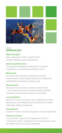 pakiet: ADRENALINA Skok na bungee Skok z najwyższej w Polsce wysokości 90 m. Istnieje możliwość wjazdu widokowego. Skok ze spadochronem Transport do pobliskiego lotniska, gdzie w tandemie mogą Państwo zasmakować podniebnych lotów. Wspinaczka Na naszym terenie zostanie zainstalowana ścianka wspinaczkowa, na której będą mogli Państwo spróbować samodzielnie lub zespołowo zdobyć szczyt. Miasto linowe Na naszym terenie zostanie rozłożone miasto linowe – mosty, zjazdy lub też mini „zręcznościówka”. Pod okiem instruktora muszą Państwo pokonać tor przeszkód. Lot na paralotni Wolność i emocje w powietrzu. Start z pobliskiego lotniska. Będą Państwo mieli okazje sterować specjalnym skrzydłem podziwiając okoliczne krajobrazy. Poduszkowce Transport z Hotelu nad Zalew Zegrzyński, impreza całodzienna. Przeprawy tratwą Tuż przy Hotelu mogą Państwo spróbować swoich sił w budowaniu tratwy i przeprawieniu się na drugą stronę rzeki. Nie będzie łatwo, liczy się praca zespołowa.