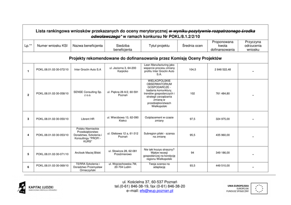 Lista rankingowa wniosków przekazanych do oceny merytorycznej w wyniku pozytywnie rozpatrzonego środka odwoławczego* w ramach konkursu Nr POKL/8.1.2/2/10 Lp.** Numer wniosku KSI Nazwa beneficjenta Siedziba beneficjenta Tytuł projektu Średnia ocen Proponowana kwota dofinansowania Przyczyna odrzucenia wniosku Projekty rekomendowane do dofinansowania przez Komisję Oceny Projektów 1 POKL.08.01.02-30-072/10 Inter Groclin Auto S.A ul. Jeziorna 3, 64-200 Karpicko Lean Manufacturing jako wsparcie procesu zmiany profilu Inter Groclin Auto S.A. 104,5 2 848 522,48 102 761 484,80 POKL.08.01.02-30-058/10 SENSE Consulting Sp. z o.o. ul. Piękna 28 A/2, 60-591 Poznań WIELKOPOLSKIE OBSERWATORIUM GOSPODARCZE badania koniunktury, trendów gospodarczych i strategii zarządzania zmianą w przedsiębiorstwach Wielkopolski POKL.08.01.02-30-050/10 Librent HR ul. Wierzbowa 13, 62-090 Kiekrz Outplacement w czasie zmiany 97,5 324 975,00 4 POKL.08.01.02-30-053/10 Polsko Niemieckie Przedsiębiorstwo Doradztwa, Szkolenia i Konsultingu "PROFI KURS" ul. Glebowa 12 a, 61-312 Poznań Subregion pilski - szansa na zmianę 95,5 435 960,00 5 POKL.08.01.02-30-071/10 Arcilook Maciej Bilski ul. Słowicza 28, 62-081 Przeźmierowo 94 349 186,00 93,5 449 510,00 2 3 6 POKL.08.01.02-30-069/10 TERRA Szkolenia i Doradztwo Przemysław Omieczyński ul. Wojciechowska 7M, 20-704 Lublin Nie taki kryzys straszny? Wpływ recesji gospodarczej na kondycję regionu Wielkopolski Twoja szansa na adaptację ul. Kościelna 37, 60-537 Poznań tel.(0-61) 846-38-19, fax (0-61) 846-38-20 e–mail: [email protected] - - - - - - 7 POKL.08.01.02-30-055/10 Instytut Zachodni Instytut NaukowoBadawczy im. Zygmunta Wojciechowskiego ul. Mostowa 27, 61-854 Poznań Analiza skutków restrukturyzacji i modernizacji branż dla rynku pracy w Wielkopolsce 93 1 799 232,35 - Projekty rekomendowane do dofinansowania przez Komisję Oceny Projektów, lecz nie przyjęte do dofinansowania z powodu wyczerpania alokacji w ramach ww. konkursu 8 11 12 13 14 92 636 126,00 438 785,04 POKL.08.01.02-30-060/10 Maximus Polska Sp. z o.o. POKL.08.01.02-30-065/10 Doradztwo Społeczne i Gospodarcze ul. Św. Wojciech 22/24/7, 61-749 Poznań Zarządzanie zmianą w wielkopolskich przedsiębiorstwach skutecznym narzędziem walki z kryzysem 90,5 DEA Konsulting Izabela Tokarska ul. Międzyborska 2/5, 60162 Poznań Kampania informacyjnaoutplacement dla wielkopolskich przedsiębiorstw 90 Stowarzyszenie "Bezpieczny Konin" ul. Przemysłowa 2/415, 62-510 Konin Dokąd zmierzać? 88,5 POKL.08.01.02-30-075/10 O.K. Centrum Języków Obcych sp. z o.o. ul. Bohaterów Monte Cassino 53, 20-705 Lublin Nowy zawód jest OK! 84,5 POKL.08.01.02-30-054/10 Holdikom S.A ul. Partyzancka 27, 63400 Ostrów Wielkopolski Zmiana gospodarcza. Aktywność i Wiedza 76,5 POKL.08.01.02-30-056/10 Fundacja Edukacji Europejskiej ul. Rynek 7-7a/2a, 58-300 Wałbrzych Przestrzenie przepływów czynników rozwojowych w województwie wielkopolskim 67 9 10 Korzyści płynące z wykorzystania procesów adaptacyjnych i modernizacyjnych w przedsiębiorstwie ul. Jana Henryka Dąbrowskiego 143, 60577 Poznań POKL.08.01.02-30-074/10 POKL.08.01.02-30-064/10 ul. Kościelna 37, 60-537 Poznań tel.(0-61) 846-38-19, fax (0-61) 846-38-20 e–mail: [email protected] - - 387 406,00 - 381 320,00 - 463 828,00 - 625 413,00 - 549 219,27 - Projekty odrzucone 15 16 17 "Eurofiss" Sp. z o.o. ul. Wł. Biegańskiego 44A, 60-682 Poznań Maximus Polska Sp. z o.o. ul. Jana Henryka Dąbrowskiego 143, 60577 Poznań Badanie i wyznaczanie trendów oraz zmian wśród przedsiębiorstw z branży transportowej w Wielkopolsce DEA Konsulting Izabela Tokarska ul. Międzyborska 2/5, 60162 Poznań Szkolenia zamiast zwolnienia - kompleksowe wsparcie dla pracodawców i pracowników branż zagrożonych w Wielkopolsce 79,5 Firma UsługowoDoradcza "Setka" Justyna Górecka ul. Obornicka 9 B, 64-500 Szamotuły Open your mind doradztwo i szkolenia dla osób 45+ 69 POKL.08.01.02-30-061/10 Fundacja Rozwoju Nauki i Przedsiębiorczości ul. Strzelecka 20/8a, 61846 Poznań Tendencje rozwojowe przedsiębiorstw i popyt na pracę w województwie wielkopolskim w kontekście organizacji przez Polskę i Ukrainę Euro 2012-diagnoza i prognoza 63,5 POKL.08.01.02-30-067/10 NS Konsulting Spółka z ograniczoną odpowiedzialnością ul. Nałęczowska 30, 20701 Lublin Naucz się zdobywać fundusze z UE 61,5 POKL.08.01.02-30-070/10 Volkswagen Poznań Sp. z o.o. ul. Warszawska 349, 61060 Poznań POKL.08.01.02-30-073/10 POKL.08.01.02-30-066/10 POKL.08.01.02-30-068/10 POKL.08.01.02-30-057/10 18 19 20 21 Strefa nowej wiedzy Następca - Rozwój kompetencji pracowniczek i pracowników firmy Volkswagen Poznań sp. z ul. Kościelna 37, 60-537 Poznań tel.(0-61) 846-38-19, fax (0-61) 846-38-20 e–mail: [email protected] 96 93 56,5 0,00 0,00 0,00 0,00 0,00 0,00 0,00 Projekt niezgodny jest z zasadami udzielania pomocy publicznej Projekt jest niezgodny z zasadą równości szans kobiet i mężczyzn Projekt niezgodny jest z zasadami udzielania pomocy publicznej Projekt niezgodny jest z zasadami udzielania pomocy publicznej Projekt nie uzyskał wymaganego minimum 60% punktów w części 3.1 i 3.4 Projekt nie jest zgodny z SzOP POKL. Projekt nie jest zgodny z SzOP POKL o.o. 22 23 24 25 26 Aktualne kwalifikacje podstawą stabilizacji zawodowej POKL.08.01.02-30-063/10 O.K. Centrum Języków Obcych sp. z o.o. ul. Bohaterów Monte Casino 53, 20-705 Lublin POKL.08.01.02-30-059/10 Towarzystwo Promocji i Rozwoju Ziemi Kleczewskiej ul. Warszawska 31/215, 62-540 Kleczew Klaster meblowy 37 Miasto Poznań pl. Kolegiacki 17, 61-841 Poznań Innowacyjność, usługi, offshore - cechy Poznania, nowoczesnej gospodarki miejskiej przyszłości. Projekt badawczy 23,5 23 21 POKL.08.01.02-30-051/10 POKL.08.01.02-30-052/10 Miasto Poznań pl. Kolegiacki 17, 61-841 Poznań Wsparcie adaptacji sektora MŚP w aglomeracji poznańskiej do trendów rozwojowych lokalnej gospodarki w obszarze turystyki i organizacji imprez masowych POK