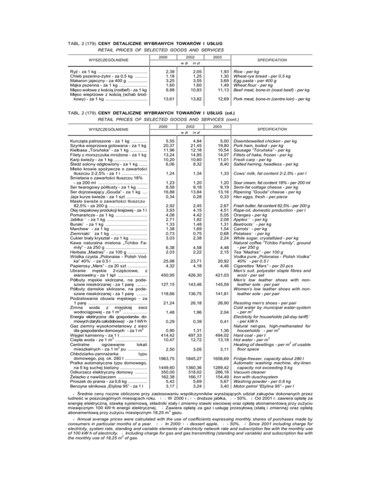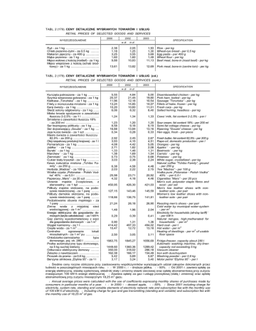 TABL. 2 (179). CENY DETALICZNE WYBRANYCH TOWARÓW I US UG RETAIL PRICES OF SELECTED GOODS AND SERVICES WYSZCZEGÓLNIENIE Ry - za 1 kg ........................................ Chleb pszenno- ytni - za 0,5 kg .......... Makaron jajeczny - za 400 g ................ ka pszenna - za 1 kg ....................... Mi so wo owe z ko ci (rostbef) - za 1 kg Mi so wieprzowe z ko ci (schab rodkowy) - za 1 kg .................................. 2000 2002 wz 2003 SPECIFICATION in zl 2,38 1,18 3,25 1,60 9,88 2,05 1,25 3,55 1,60 10,83 1,93 1,30 3,69 1,49 11,13 Rice - per kg Wheat-rye bread - per 0,5 kg Egg pasta - per 400 g Wheat flour - per kg Beef meat, bone-in (roast beef) - per kg 13,61 13,82 12,69 Pork meat, bone-in (centre loin) - per kg TABL. 2 (179). CENY DETALICZNE WYBRANYCH TOWARÓW I US UG (cd.) RETAIL PRICES OF SELECTED GOODS AND SERVICES (cont.) WYSZCZEGÓLNIENIE Kurcz ta patroszone - za 1 kg ............. Szynka wieprzowa gotowana - za 1 kg Kie basa „Toru ska” - za 1 kg .............. Filety z morszczuka mro one - za 1 kg Karp wie y - za 1 kg ........................... led solony odg owiony - za 1 kg ....... Mleko krowie spo ywcze o zawarto ci uszczu 2-2,5% - za 1 l ..................... mietana o zawarto ci t uszczu 18% - za 200 ml ........................................ Ser twarogowy pó usty - za 1 kg ........ Ser dojrzewaj cy „Gouda” - za 1 kg .... Jaja kurze wie e - za 1 szt ................. Mas o wie e o zawarto ci t uszczu 82,5% - za 200 g ............................... Olej rzepakowy produkcji krajowej - za 1 l Pomara cze - za 1 kg .......................... Jab ka ab - za 1 kg ................................. Buraki a - za 1 kg .................................. Marchew a - za 1 kg .............................. Ziemniaki a za 1 kg .............................. Cukier bia y kryszta - za 1 kg .............. Kawa naturalna mielona „Tchibo Family” - za 250 g .................................. Herbata „Madras” - za 100 g ................ Wódka czysta „Polonaise - Polish Vodka” 40% c - za 0,5 l ............................ Papierosy „Mars” - za 20 szt ................ Ubranie m skie 2-cz ciowe, z elanowe ny - za 1 kpl ........................ Pó buty m skie skórzane, na podeszwie nieskórzanej - za 1 par ......... Pó buty damskie skórzane, na podeszwie nieskórzanej - za 1 par ......... Podzelowanie obuwia m skiego - za 1 par ................................................ Zimna woda z miejskiej sieci 3 wodoci gowej - za 1 m .................... Energia elektryczna dla gospodarstw domowych (taryfa ca odobowa) d - za 1 kW·h Gaz ziemny wysokometanowy z sieci 3 dla gospodarstw domowych e - za 1 m giel kamienny - za 1 t ...................... 3 Ciep a woda - za 1 m .......................... Centralne ogrzewanie lokali 2 mieszkalnych - za 1 m pu ................ Ch odziarko-zamra arka typu domowego, poj. ok. 280 l .................. Pralka automatyczna typu domowego, na 5 kg suchej bielizny ...................... Odkurzacz elektryczny domowy .......... elazko z nawil aczem ........................ Proszek do prania - za 0,6 kg ................ Benzyna silnikowa „Etylina 95” - za 1 l 2000 2002 wz 2003 in zl SPECIFICATION 5,55 20,37 11,96 13,24 10,20 6,06 4,84 21,45 12,18 14,85 10,60 8,32 5,00 19,80 10,54 14,07 11,01 8,40 Disembowelled chicken - per kg Pork ham, boiled - per kg Sausage ”Toru ska” - per kg Fillets of hake, frozen - per kg Fresh carp - per kg Salted herring, headless - per kg 1,24 1,34 1,33 1,23 8,58 16,88 0,34 1,20 9,18 13,84 0,28 1,20 9,19 13,16 0,33 Sour cream, fat content 18% - per 200 ml Semi-fat cottage cheese - per kg Ripening ”Gouda” cheese - per kg Hen eggs, fresh - per piece 2,92 3,93 4,08 2,71 1,33 1,38 0,73 3,03 2,45 4,15 4,42 1,82 1,48 1,69 0,75 2,38 2,67 4,51 5,05 2,08 1,31 1,54 0,68 2,24 6,38 2,03 4,58 2,22 4,48 2,15 25,98 4,32 23,71 4,18 20,92 4,46 450,95 426,30 421,03 127,15 143,46 145,59 118,66 136,75 141,81 Fresh butter, fat content 82,5% - per 200 g Rape-oil, domestic production - per l Oranges - per kg Apples ab - per kg Beetroots a - per kg Carrots a - per kg Potatoes a - per kg White sugar, crystallized - per kg Natural coffee ”Tchibo Family”, ground - per 250 g Tea ”Madras” - per 100 g Vodka pure „Polonaise - Polish Vodka” 40% c - per 0,5 l Cigarettes ”Mars” - per 20 pcs Men’s suit, polyester staple fibres and wool - per set Men’s low leather shoes with nonleather sole - per pair Women’s low leather shoes with nonleather sole - per pair 21,24 26,18 26,90 1,48 1,96 2,04 0,29 0,39 0,41 0,90 414,42 10,47 1,31 497,33 12,72 1,36 494,02 13,18 2,50 3,05 3,11 1963,75 1845,27 1656,69 1449,60 350,00 162,38 5,42 3,17 1360,36 318,02 166,17 5,69 3,24 1289,42 286,18 154,49 5,67 3,40 Cows’ milk, fat content 2-2,5% - per l Resoling men’s shoes - per pair Cold water by municipal water-system 3 - per m Electricity for households (all-day tariff) d - per kW·h Natural net-gas, high-methanated for 3 households e - per m Hard coal - per t 3 Hot water - per m 2 Heating of dwellings - per m of usable floor space Fridge-freezer, capacity about 280 l Automatic washing machine, dry-linen capacity not exceeding 5 kg Vacuum cleaner Iron with duschsystem Washing powder - per 0,6 kg Motor petrol “Etylina 95” - per l a rednie ceny roczne obliczono przy zastosowaniu wspó czynników wyra aj cych udzia zakupów dokonanych przez ludno w poszczególnych miesi cach roku. b, c W 2000 r.: b - dro sze jab ka, c - 50%. d Od 2001 r. zawiera op at za energi elektryczn , stawk systemow , sk adniki sta y i zmienny stawki sieciowej oraz op at abonamentow przy zu yciu miesi cznym 100 kW·h energii elektrycznej. e Zawiera op at za gaz i us ug przesy ow (sta i zmienn ) oraz op at 3 abonamentow przy zu yciu miesi cznym 18,25 m gazu. a Annual average prices were calculated with the use of coefficients expressing monthly shares of purchases made by consumers in particular months of a year. b, c In 2000: b - dessert apple, c - 5