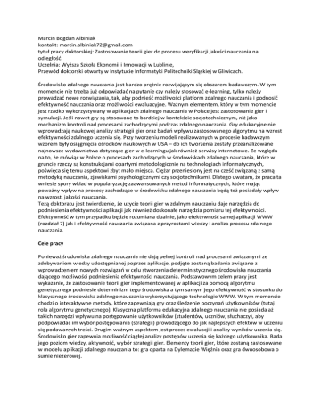 Marcin Bogdan Albiniak kontakt: [email protected] tytuł pracy doktorskiej: Zastosowanie teorii gier do procesu weryfikacji jakości nauczania na odległość. Uczelnia: Wyższa Szkoła Ekonomii i Innowacji w Lublinie, Przewód doktorski otwarty w Instytucie Informatyki Politechniki Śląskiej w Gliwicach. Środowisko zdalnego nauczania jest bardzo prężnie rozwijającym się obszarem badawczym. W tym momencie nie trzeba już odpowiadać na pytanie czy należy stosować e-learning, tylko należy prowadzać nowe rozwiązania, tak, aby podnieść możliwości platform zdalnego nauczania i podnosić efektywność nauczania oraz możliwości ewaluacyjne. Ważnym elementem, który w tym momencie jest rzadko wykorzystywany w aplikacjach zdalnego nauczania w Polsce jest zastosowanie gier i symulacji. Jeśli nawet gry są stosowane to bardziej w kontekście socjotechnicznym, niż jako mechanizm kontroli nad procesami zachodzącymi podczas zdalnego nauczania. Gry edukacyjne nie wprowadzają naukowej analizy strategii gier oraz badań wpływu zastosowanego algorytmu na wzrost efektywności zdalnego uczenia się. Przy tworzeniu modeli realizowanych w procesie badawczym wzorem były osiągnięcia ośrodków naukowych w USA – do ich tworzenia zostały przeanalizowane najnowsze wydawnictwa dotyczące gier w e-learningu jak również serwisy internetowe. Ze względu na to, że mówiąc w Polsce o procesach zachodzących w środowiskach zdalnego nauczania, które w gruncie rzeczy są konstrukcjami opartymi metodologicznie na technologiach informatycznych, poświęca się temu aspektowi zbyt mało miejsca. Ciężar przeniesiony jest na cześć związaną z samą metodyką nauczania, zjawiskami psychologicznymi czy socjotechnikami. Dlatego uważam, że praca ta wniesie spory wkład w popularyzację zaawansowanych metod informatycznych, które mając poważny wpływ na procesy zachodzące w środowisku zdalnego nauczania będą też posiadały wpływ na wzrost, jakości nauczania. Tezą doktoratu jest twierdzenie, że użycie teorii gier w zdalnym nauczaniu daje narzędzia do podniesienia efektywności aplikacji jak również doskonałe narzędzia pomiaru tej efektywności. Efektywność w tym przypadku będzie rozumiana dualnie, jako efektywność samej aplikacji WWW (rozdział 7) jak i efektywność nauczania związana z przyrostami wiedzy i analiza procesu zdalnego nauczania. Cele pracy Ponieważ środowiska zdalnego nauczania nie dają pełnej kontroli nad procesami związanymi ze zdobywaniem wiedzy udostępnianej poprzez aplikacje, podjęte zostaną badania związane z wprowadzeniem nowych rozwiązań w celu stworzenia deterministycznego środowiska nauczania dającego możliwości podniesienia efektywności nauczania. Podstawowym celem pracy jest wykazanie, że zastosowanie teorii gier implementowanej w aplikacji za pomocą algorytmu genetycznego podniesie determinizm tego środowiska a tym samym jego efektywność w stosunku do klasycznego środowiska zdalnego nauczania wykorzystującego technologie WWW. W tym momencie chodzi o interaktywne metody, które zapewniają gry oraz śledzenie poczynań użytkowników (tutaj rola algorytmu genetycznego). Klasyczna platforma edukacyjna zdalnego nauczania nie posiada aż takich narzędzi wpływu na postępowanie użytkowników (studentów, uczniów, słuchaczy), aby podpowiadać im wybór postępowania (strategii) prowadzącego do jak najlepszych efektów w uczeniu się podawanych treści. Drugim ważnym aspektem jest proces ewaluacji i analizy wyników uczenia się. Środowisko gier zapewnia możliwość ciągłej analizy postępów uczenia się każdego użytkownika. Bada jego poziom wiedzy, aktywność, wybór strategii gier. Elementy teorii gier, które zostaną zastosowane w modelu aplikacji zdalnego nauczania to: gra oparta na Dylemacie Więźnia oraz gra dwuosobowa o sumie niezerowej. Gracz X Gracz Y O A (-2,5) C (0,6) NO (5,-5) (2,-2) NN (-5,-5) (0,0) Tabela 1. Tabela wypłat dla graczy w grze dwuosobowej o sumie niezerowej Gdzie zapis (a,b) oznacza a – wpłata dla gracza X, b – wypłata dla gracza Y A, C – oznacza wybrane wcześniej strategie przez gracza X. O – oznacza pozytywna odpowiedź gracza Y. NO – oznacza złą odpowiedź gracza Y i poprawną odpowiedź gracza X. NN – oznacza niepoprawną odpowiedź obu graczy. Gracz X Patrząc na poszczególne strategie już na pierwszy rzut oka widać, że strategia A jest strategią agresywną, natomiast C zachowawczą (powoduje jak najmniej strat po obu stronach). Drugim elementem jest gra oparta na Dylemacie Więźnia. C D Gracz Y C D (2,2) (-2,4) (4,-2) (0,0) Tabela 2. Tabela wypłat dla graczy w grze opartej na Dylemacie Więźnia W tej grze możliwe są dwie strategie: C i D. Przeprowadźmy analizę strategii: Strategia C: Gracz X pozwala graczowi Y przejść do kolejnego bloku wiedzy, tak, aby gracz Y mógł się przygotować do sprawdzianu poszerzając kolejny blok wiedzy. Strategia D: Gracz X sprawdza gracza Y wywołując go quizu. Jeżeli obaj gracze zagrają strategię C to obaj otrzymają po 2 punkty. Jeżeli obaj zagrają D to otrzymują 0 punktów. Natomiast, jeśli jeden z nich wybierze strategię C a drugi D, to ten, który wybrał C otrzymuje karę -2 a drugi gracz nagrodę 4 punkty. Przy wyborze D następuje przystąpienie gracza do quizu, który może być kolejną grą na przykład opartą na strategii wcześniej opisanej gry tworząc rozbudowaną multigrę. Stosując w ten sposób dylemat więźnia możemy „przymusić” studentów, aby nie przyśpieszali sprawdzianu wiadomości, ponieważ sami mogą na tym stracić. Student w większej ilości prób będzie kooperował z drugim i pozwalał mu się uczyć. Sprawdzian nastąpi wtedy, gdy jeden ze studentów uzna, że poziom jego wiedzy jest wystarczający, aby odbyć quiz. Przedstawiony model gry będzie implementowany za pomocą algorytmu genetycznego. Aby wybrać najlepszy dla danego przypadku operator selekcji należ