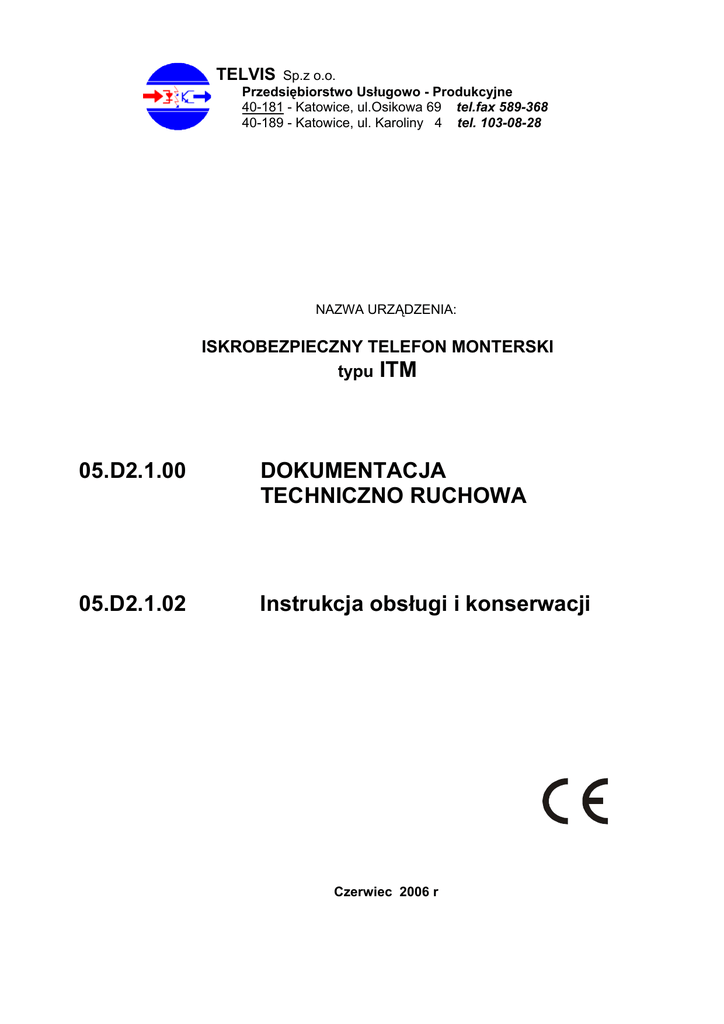 TELVIS Sp.z o.o. Przedsiębiorstwo Usługowo - Produkcyjne 40-181 - Katowice, ul.Osikowa 69 tel.fax 589-368 40-189 - Katowice, ul. Karoliny 4 tel. 103-08-28 NAZWA URZĄDZENIA: ISKROBEZPIECZNY TELEFON MONTERSKI typu ITM 05.D2.1.00 DOKUMENTACJA TECHNICZNO RUCHOWA 05.D2.1.02 Instrukcja obsługi i konserwacji Czerwiec 2006 r PUP TELVIS DTR TELEFONU MONTERSKIEGO ITM - INSTRUKCJA OBSŁUGI I KONSERWACJI SPIS TREŚCI STRONA 1. WSTĘP. 2 1.1. Przeznaczenie i zakres instrukcji. 2 1.2. Przeznaczenie iskrobezpiecznego telefonu monterskiego ITM. 2 1.3. Możliwości funkcjonalne telefonu ITM. 2 2. WYPOSAŻENIE I BUDOWA ISKROBEZPIECZNYCH TELEFONÓW MONTERSKICH. 4 3. DANE TECHNICZNE. 5 4. SPOSÓB OBSŁUGI ISKROBEZPIECZNYCH TELEFONÓW MONTERSKICH 6 4.1. Opis ogólny sposobu stosowania. 6 4.2. Sposób realizacji połączeń dyspozytorskich w systemie STAR. 4.2.1. Połączenie ITM z dyspozytorem. 4.2.2. Połączenia dyspozytora z ITM. 6 6 6 4.3. Opis realizacji połączeń telefonicznych w systemie STAR. 4.3.1. Przywołanie ITM z centrali telefonicznej. 4.3.2. Rozmowa telefoniczna prowadzona z ITM. 7 7 7 4.4. Opis realizacji połączeń telefonicznych w zestawach urządzeń UTI. 4.4.1. Przywołanie ITM z urządzeń UTI i kontrola linii. 4.4.2. Rozmowa telefoniczna prowadzona z ITM poprzez urządzenia UTI. 7 8 8 4.5. Opis realizacji połączeń telefonicznych w systemie SAT. 4.5.1. Połączenie ITM z dyspozytorem. 4.5.2. Połączenia dyspozytora z ITM. 9 9 9 4.6. Opis realizacji połączeń telefonicznych w systemie SAT. 4.6.1. Przywołanie ITM z centrali telefonicznej. 4.6.2. Rozmowa telefoniczna prowadzona z ITM. 9 9 9 5. KONSERWACJA ISKROBEZPIECZNYCH TELEFONÓW MONTERSKICH. 10 5.1. Konserwacja obudowy. 10 5.2. Przegląd okresowy. 10 6. NAPRAWY ISKROBEZPIECZNYCH TELEFONÓW MONTERSKICH. 10 6.1. Naprawy bieżące. 10 6.2. Naprawy gwarancyjne i pogwarancyjne. 10 7. WARUNKI BEZPIECZEŃSTWA 11 8. RYSUNKI 11 1 PUP TELVIS DTR TELEFONU MONTERSKIEGO ITM - INSTRUKCJA OBSŁUGI I KONSERWACJI 1. WSTĘP. 1.1. Przeznaczenie i zakres instrukcji. Instrukcja obsługi i konserwacji jest dokumentacją przekazywaną użytkownikowi zgodnie z odpowiednimi zapisami dyrektyw europejskich. Zawiera niezbędne informacje dla prawidłowego i bezpiecznegu użytkowania urządzenia, a także informacje dotyczące serwisowania. W instrukcji podano również warunki bezpiecznego stosowania urządzenia. 1.2. Przeznaczenie iskrobezpiecznego telefonu monterskiego ITM. Telefony monterskie typu ITM mogą pracować w trudnych warunkach przemysłowych przy dużej wilgotności i wysokim stopniu zapylenia oraz dowolnym stopniu zagrożenia metanowego. Iskrobezpieczne telefony monterskie typu ITM przeznaczone są głównie dla kopalnianych służb łączności nadzorujących urządzenia i sieć teletechniczną iskrobezpieczną. Mogą być również wykorzystywane przez inne służby dołowe (np. dozór górniczy) w charakterze iskrobezpiecznych telefonów przenośnych, włączanych w razie potrzeby do wydzielonych linii telefonicznych lub dozorowych, poprzez specjalne gniazda montowane w skrzynkach teletechnicznych rozdzielczych typu STP. Umożliwiają nawiązanie łączności pomiędzy konserwatorem wyposażeń dołowych urządzeń UTI i systemu STAR, a dyspozytorem kopalni (w przypadku kontroli i napraw linii dozorowych systemu STAR) i dowolnym abonentem ogólnokopalnianej sieci telefonicznej np. telefonistką (w przypadku kontroli i napraw obwodów wyjściowych UTI). Głównym zadaniem telefonów ITM jest kontrola sprawności teletechnicznych linii iskrobezpiecznych dołowych separowanych zespołami separacji typu ZS...,LPI… w ramach urządzeń telefonii iskrobezpiecznej typu UTI, oraz systemu łączności telefonicznej i alarmowo-rozgłoszeniowej typu STAR czy SAT. Kontrola ta polega na możliwości dołączenia się montera (konserwatora) do linii telefonicznej iskrobezpiecznej urządzenia UTI w dowolnym miejscu (np. w skrzynce rozdzielczej STP, po uprzednim odłączeniu aparatu na zaciskach liniowych Lia, Lib, itp.) oraz sprawdzeniu obecności napięcia linii, sygnału zgłoszenia i wybraniu dowolnego numeru w centrali dołączonej do linii systemem wybierania dekadowego PM lub wieloczęstotliwościowego DTMF, za pomocą klawiatury wybierczej. Aparat ITM daje możliwość nawiązania połączenia w obydwu kierunkach, co pozwala stwierdzić nie tylko sprawność linii iskrobezpiecznej ale również wyposażenia liniowego w centrali telefonicznej oraz zespołów separacji ZS..., LPI… Podobnie jak w przypadku urządzeń UTI, telefonem ITM można kontrolować linie dozorowe i wyposażenia liniowe ZLD… oraz zespoły separacji ZSB… pracujące w systemie STAR. W tym przypadku po dołączeniu aparatu ITM (ustawionego w trybie pracy „STAR”) do zacisków linii dozorowej oprócz opisanych powyżej funkcji można sprawdzić sprawność systemu w zakresie nawiązywania połączenia simpleksowego z dyspozytorem zakładu górniczego w obydwu kierunkach oraz wywołania zwykłego przyciskiem „D” i alarmowego przyciskiem „A”, a także nadawania sygnałów alarmowych i komunikatów słownych. Wywołanie telefonu ITM z centrali telefonicznej lub systemu STAR jest sygnalizowane akustycznie i optycznie. Możliwa jest również współpraca z zespołami liniowo-dyspozytorskimi LPI… systemu SAT. 2 PUP TELVIS DTR TELEFONU MONTERSKIEGO ITM - INSTRUKCJA OBSŁUGI I KONSERWACJI 1.3. Możliwości funkcjonalne telefonu ITM. • • • • • • • • • Telefon monterski ITM umożliwia: - realizację podstawowych funkcji sygnalizatora telefonu ZITG w systemie STAR, to jest: nawiązywanie połączeń i prowadzenie rozmowy telefonicznej w ruchu automatycznym i półautomatycznym, za pośrednictwem centrali telefonicznej dowolnego typu, bezpośrednie połączenie głośno mówiące (simpleksowe) dyspozytora z ITM, wywołanie dyspozytora w trybie alarmowym z klawiatury ITM po naciśnięciu przycisku "A", wywołanie dyspozytora w trybie zwykłym z kla