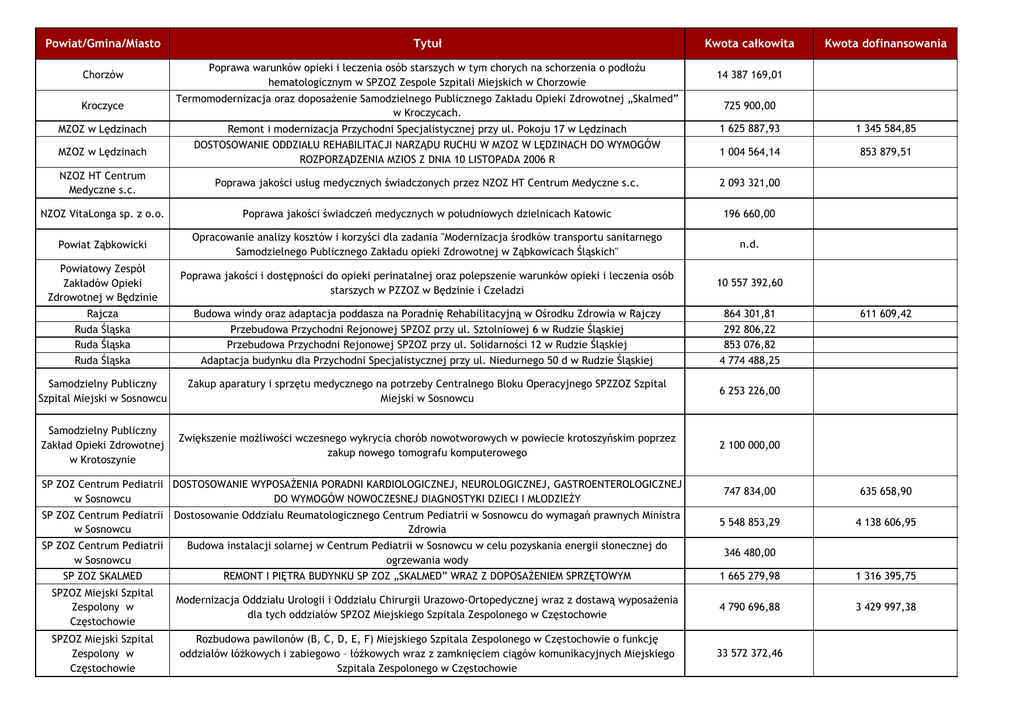 Powiat/Gmina/Miasto Tytuł Kwota całkowita Chorzów Poprawa warunków opieki i leczenia osób starszych w tym chorych na schorzenia o podłożu hematologicznym w SPZOZ Zespole Szpitali Miejskich w Chorzowie 14 387 169,01 Kwota dofinansowania Termomodernizacja oraz doposażenie Samodzielnego Publicznego Zakładu Opieki Zdrowotnej „Skalmed” w Kroczycach. Remont i modernizacja Przychodni Specjalistycznej przy ul. Pokoju 17 w Lędzinach DOSTOSOWANIE ODDZIAŁU REHABILITACJI NARZĄDU RUCHU W MZOZ W LĘDZINACH DO WYMOGÓW ROZPORZĄDZENIA MZIOS Z DNIA 10 LISTOPADA 2006 R 1 625 887,93 1 345 584,85 1 004 564,14 853 879,51 NZOZ HT Centrum Medyczne s.c. Poprawa jakości usług medycznych świadczonych przez NZOZ HT Centrum Medyczne s.c. 2 093 321,00 NZOZ VitaLonga sp. z o.o. Poprawa jakości świadczeń medycznych w południowych dzielnicach Katowic 196 660,00 Powiat Ząbkowicki Opracowanie analizy kosztów i korzyści dla zadania "Modernizacja środków transportu sanitarnego Samodzielnego Publicznego Zakładu opieki Zdrowotnej w Ząbkowicach Śląskich" n.d. Powiatowy Zespół Zakładów Opieki Zdrowotnej w Będzinie Poprawa jakości i dostępności do opieki perinatalnej oraz polepszenie warunków opieki i leczenia osób starszych w PZZOZ w Będzinie i Czeladzi 10 557 392,60 Rajcza Ruda Śląska Ruda Śląska Ruda Śląska Budowa windy oraz adaptacja poddasza na Poradnię Rehabilitacyjną w Ośrodku Zdrowia w Rajczy Przebudowa Przychodni Rejonowej SPZOZ przy ul. Sztolniowej 6 w Rudzie Śląskiej Przebudowa Przychodni Rejonowej SPZOZ przy ul. Solidarności 12 w Rudzie Śląskiej Adaptacja budynku dla Przychodni Specjalistycznej przy ul. Niedurnego 50 d w Rudzie Śląskiej 864 301,81 292 806,22 853 076,82 4 774 488,25 Samodzielny Publiczny Szpital Miejski w Sosnowcu Zakup aparatury i sprzętu medycznego na potrzeby Centralnego Bloku Operacyjnego SPZZOZ Szpital Miejski w Sosnowcu 6 253 226,00 Samodzielny Publiczny Zakład Opieki Zdrowotnej w Krotoszynie Zwiększenie możliwości wczesnego wykrycia chorób nowotworowych w powiecie krotoszyńskim poprzez zakup nowego tomografu komputerowego 2 100 000,00 Kroczyce MZOZ w Lędzinach MZOZ w Lędzinach 725 900,00 611 609,42 SP ZOZ Centrum Pediatrii DOSTOSOWANIE WYPOSAŻENIA PORADNI KARDIOLOGICZNEJ, NEUROLOGICZNEJ, GASTROENTEROLOGICZNEJ w Sosnowcu DO WYMOGÓW NOWOCZESNEJ DIAGNOSTYKI DZIECI I MŁODZIEŻY 747 834,00 635 658,90 SP ZOZ Centrum Pediatrii Dostosowanie Oddziału Reumatologicznego Centrum Pediatrii w Sosnowcu do wymagań prawnych Ministra w Sosnowcu Zdrowia 5 548 853,29 4 138 606,95 SP ZOZ Centrum Pediatrii w Sosnowcu SP ZOZ SKALMED Budowa instalacji solarnej w Centrum Pediatrii w Sosnowcu w celu pozyskania energii słonecznej do ogrzewania wody REMONT I PIĘTRA BUDYNKU SP ZOZ „SKALMED” WRAZ Z DOPOSAŻENIEM SPRZĘTOWYM SPZOZ Miejski Szpital Zespolony w Częstochowie SPZOZ Miejski Szpital Zespolony w Częstochowie 346 480,00 1 665 279,98 1 316 395,75 Modernizacja Oddziału Urologii i Oddziału Chirurgii Urazowo-Ortopedycznej wraz z dostawą wyposażenia dla tych oddziałów SPZOZ Miejskiego Szpitala Zespolonego w Częstochowie 4 790 696,88 3 429 997,38 Rozbudowa pawilonów (B, C, D, E, F) Miejskiego Szpitala Zespolonego w Częstochowie o funkcję oddziałów łóżkowych i zabiegowo – łóżkowych wraz z zamknięciem ciągów komunikacyjnych Miejskiego Szpitala Zespolonego w Częstochowie 33 572 372,46 SPZOZ Miejski Szpital Zespolony w Częstochowie Miejski Szpital Zespolony – Informatyzacja Miejskiego Szpitala Zespolonego w Częstochowie 6 000 000,00 SPZOZ Szpital Specjalistyczny w Zabrzu Program wczesnego wykrywania nowotworów jelita grubego i piersi drogą do poprawy zdrowia wśród mieszkańcow województwa sląskiego 2 733 793,34 Szpital Chorób Płuc w Orzeszu Utworzenie poododziału seniora w Szpitalu chorób Płóc w Orzeszu 4 397 749,00 Szpital Kolejowy w Wilkowicach-Bystrej Podniesienie jakości świadczeń medycznych o dostosowanie do wymogów prawa obiektów szpitala w Wilkowicach-Bystrej 3 734 246,00 Szpital Miejski nr 2 w Rudzie Śląskiej Przywrócenie funkcji medycznych Pawilonu C oraz zakup tomografu komputerowego dla Szpitala Miejskiego nr 2 w Rudzie Śląskiej. 13 834 043,60 Wojewódzkiego Szpitala Specjalistycznego im. Najświętszej Maryi Panny w Częstochowie Poprawa jakości i dostępności do opieki perinatalnej oraz polepszenie warunków opieki i leczenia osób starszych w WSS w Częstochowie. 14 304 054,36 Modernizacja środków transportu sanitarnego SPZOZ Pomoc Doraźna w Ząbkowicach Śląskich 403 860,00 343 281,00 424 126,00 359 159,00 Ząbkowice Śląskie ZOZ Wodzisław Śląski ZOZ Wodzisław Śląski ZOZ Wodzisław Śląski Poprawa skuteczności udzielania pomocy w stanach zagrożenia zdrowotnego poprzez wymianę ambulansu pogotowia ratunkowego w Wodzisławiu Śląskim Organizacja izby przyjęć Szpitala Zespołu Opieki Zdrowotnej w Wodzisławiu Śląskim Zapewnienie efektywnego działania Oddziału Anestezjologii i Intensywnej Terapii Szpitala w Wodzisławiu Śl. poprzez zakup sprzętu medycznego dostosowujący do obowiązujących wymogów Prawnych 5 062 609,00 877 214,00 689 607,00