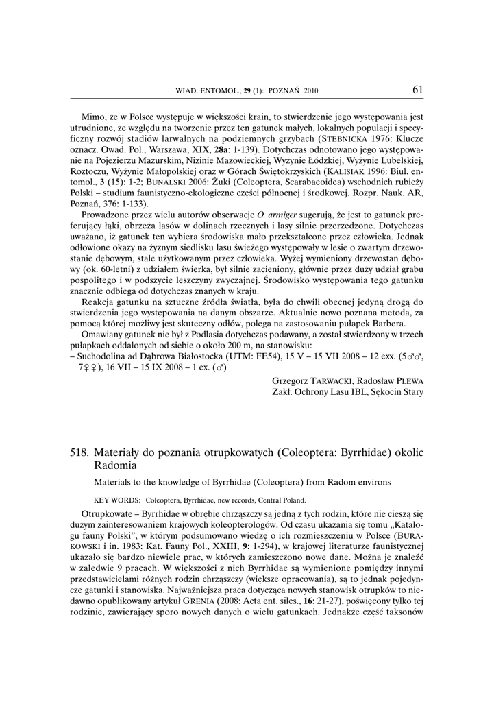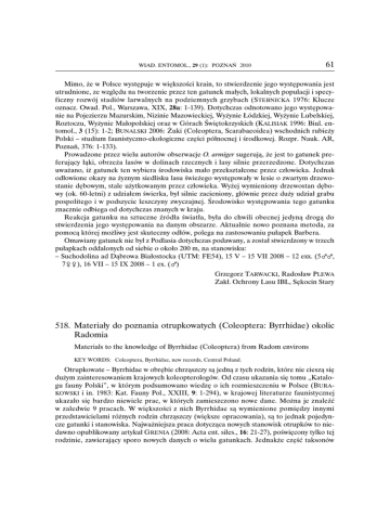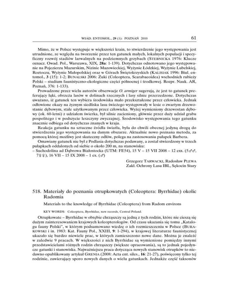 WIAD. ENTOMOL., 29 (1): POZNAŃ 2010 61 Mimo, że w Polsce występuje w większości krain, to stwierdzenie jego występowania jest utrudnione, ze względu na tworzenie przez ten gatunek małych, lokalnych populacji i specyficzny rozwój stadiów larwalnych na podziemnych grzybach (S TEBNICKA 1976: Klucze oznacz. Owad. Pol., Warszawa, XIX, 28a: 1-139). Dotychczas odnotowano jego występowanie na Pojezierzu Mazurskim, Nizinie Mazowieckiej, Wyżynie Łódzkiej, Wyżynie Lubelskiej, Roztoczu, Wyżynie Małopolskiej oraz w Górach Świętokrzyskich (KALISIAK 1996: Biul. entomol., 3 (15): 1-2; BUNALSKI 2006: Żuki (Coleoptera, Scarabaeoidea) wschodnich rubieży Polski – studium faunistyczno-ekologiczne części północnej i środkowej. Rozpr. Nauk. AR, Poznań, 376: 1-133). Prowadzone przez wielu autorów obserwacje O. armiger sugerują, że jest to gatunek preferujący łąki, obrzeża lasów w dolinach rzecznych i lasy silnie przerzedzone. Dotychczas uważano, iż gatunek ten wybiera środowiska mało przekształcone przez człowieka. Jednak odłowione okazy na żyznym siedlisku lasu świeżego występowały w lesie o zwartym drzewostanie dębowym, stale użytkowanym przez człowieka. Wyżej wymieniony drzewostan dębowy (ok. 60-letni) z udziałem świerka, był silnie zacieniony, głównie przez duży udział grabu pospolitego i w podszycie leszczyny zwyczajnej. Środowisko występowania tego gatunku znacznie odbiega od dotychczas znanych w kraju. Reakcja gatunku na sztuczne źródła światła, była do chwili obecnej jedyną drogą do stwierdzenia jego występowania na danym obszarze. Aktualnie nowo poznana metoda, za pomocą której możliwy jest skuteczny odłów, polega na zastosowaniu pułapek Barbera. Omawiany gatunek nie był z Podlasia dotychczas podawany, a został stwierdzony w trzech pułapkach oddalonych od siebie o około 200 m, na stanowisku: – Suchodolina ad Dąbrowa Białostocka (UTM: FE54), 15 V – 15 VII 2008 – 12 exx. (5%%, 7&&), 16 VII – 15 IX 2008 – 1 ex. (%) Grzegorz TARWACKI, Radosław PLEWA Zakł. Ochrony Lasu IBL, Sękocin Stary 518. Materiały do poznania otrupkowatych (Coleoptera: Byrrhidae) okolic Radomia Materials to the knowledge of Byrrhidae (Coleoptera) from Radom environs KEY WORDS: Coleoptera, Byrrhidae, new records, Central Poland. Otrupkowate – Byrrhidae w obrębie chrząszczy są jedną z tych rodzin, które nie cieszą się dużym zainteresowaniem krajowych koleopterologów. Od czasu ukazania się tomu „Katalogu fauny Polski”, w którym podsumowano wiedzę o ich rozmieszczeniu w Polsce (B URAKOWSKI i in. 1983: Kat. Fauny Pol., XXIII, 9: 1-294), w krajowej literaturze faunistycznej ukazało się bardzo niewiele prac, w których zamieszczono nowe dane. Można je znaleźć w zaledwie 9 pracach. W większości z nich Byrrhidae są wymienione pomiędzy innymi przedstawicielami różnych rodzin chrząszczy (większe opracowania), są to jednak pojedyncze gatunki i stanowiska. Najważniejsza praca dotycząca nowych stanowisk otrupków to niedawno opublikowany artykuł GRENIA (2008: Acta ent. siles., 16: 21-27), poświęcony tylko tej rodzinie, zawierający sporo nowych danych o wielu gatunkach. Jednakże część taksonów 62 KRÓTKIE DONIESIENIA współcześnie nie była ponownie wykazywana. Należy więc stwierdzić, że stan poznania rozmieszczenia tej rodziny w Polsce jest nadal wielce niewystarczający i wszelkie publikacje zawierające dane o gatunkach z tej rodziny są cenne. Jeśli chodzi o okolice Radomia, w tym Puszczę Kozienicką, do tej pory opracowane zostały kózkowate (MIŁKOWSKI 2004: Kulon, 9, 1: 81-116), bogatkowate (GUTOWSKI, MIŁKOWSKI 2008: Parki nar. Rez. Przyr., 27, 2: 49-85), gnilikowate (MIŁKOWSKI, RUTA 2005: Wiad. entomol., 24, 1: 11-20), żukowate (BIDAS, MIŁKOWSKI 2005: Kulon, 10: 3-11) oraz skórnikowate (MIŁKOWSKI, RUTA 2008: Wiad. entomol., 27, 1: 9-15). Niniejsza praca stanowi kontynuację serii publikacji o koleopterofaunie tego obszaru. Jedynym jak dotąd gatunkiem podanym z omawianego terenu jest Byrrhus (Byrrhus) pustulatus (FORSTER, 1771), znaleziony w Świerżach Górnych w Puszczy Kozienickiej (GUTOWSKI i in. 2006: Leśne Prace bad., 4: 101-144). Jeżeli nie podano inaczej chrząszcze zebrał drugi z autorów i znajdują się one w jego kolekcji. Materiał oznaczył natomiast pierwszy z autorów. Simplocaria (Simplocaria) semistriata (FABRICIUS, 1794) – Wyżyna Małopolska: Radom - Nowa Wola (EB19), 23 X 1993 – 2 exx., na ścianie budynku, 18 XI 1998 – 1 ex., w klatce schodowej budynku; Radom - Koniówka (EB19), 7 XI 1994 – 1 ex. Morychus aeneus (FABRICIUS, 1775) – Nizina Mazowiecka: Jastrzębia (EC10), 17 VIII 1997 – 1 ex., nad stawem na rzece Jastrzębiance; Kieszek (EC20), 26 VI 1997 – 2 exx., w piaszczystym dołku przy drodze leśnej; Januszno (EC30), 19 IV – 12 V 2009 – 1 ex., ugór, w pułapce Barbera. – Wyżyna Małopolska: Radom - Nowa Wola, 4 V 1993 – 1 ex., 26 V 1993 – 1 ex., 18 VII 1993 – 2 exx., 12 VII 1997 – 1 ex., na ścianie budynku; Radom - Wincentów (EC10), 23 VII 2005 – 1 ex., na składowisku popiołu elektrociepłowni. Lamprobyrrhulus nitidus (SCHALLER, 1783) – Wyżyna Małopolska: Radom - Las Kapturski (EB09), 19 V 1992 – 1 ex.; Radom - ul. Chrobrego (EB19), 21 IV 1994 – 1 ex., na chodniku osiedlowym; Radom - Michałów (EB19), 17 IV 1998 – 1 ex., na chodniku osiedlowym; Radom - Nowa Wola, 22 IV 1995 – 1 ex., na ścianie budynku, 18 IV 1998 – 2 exx., na drodze. Cytilus sericeus (FORSTER, 1771) – Nizina Mazowiecka: okolice rez. „Ponty” (EC20), 24 IV 1998 – 1 ex., na pniu ściętej jodły; Marianów (EC21), 9 VI 1997 – 1 ex., skraj lasu, w piaszczystym dołku. – Wyżyna Małopolska: Radom - Las Kapturski, 20 V 1992 – 1 ex.; Radom - Wincentów, 6 VI 1991 – 1 ex.; Radom - Firlej (EC10), 16 V 1992 – 1 ex., na wydmie; Lesiów Kolonia (EC10), 21 IV 1994 – 2 exx., na piaszczystej drodze polnej. Byrrhus (Byrrhus) fasciatus (