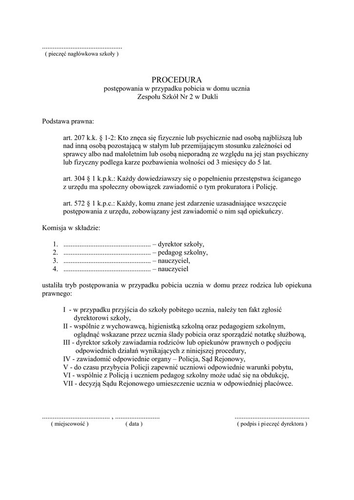 ............................................. ( pieczęć nagłówkowa szkoły ) PROCEDURA postępowania w przypadku pobicia w domu ucznia Zespołu Szkół Nr 2 w Dukli Podstawa prawna: art. 207 k.k. § 1-2: Kto znęca się fizycznie lub psychicznie nad osobą najbliższą lub nad inną osobą pozostającą w stałym lub przemijającym stosunku zależności od sprawcy albo nad małoletnim lub osobą nieporadną ze względu na jej stan psychiczny lub fizyczny podlega karze pozbawienia wolności od 3 miesięcy do 5 lat. art. 304 § 1 k.p.k.: Każdy dowiedziawszy się o popełnieniu przestępstwa ściganego z urzędu ma społeczny obowiązek zawiadomić o tym prokuratora i Policję. art. 572 § 1 k.p.c.: Każdy, komu znane jest zdarzenie uzasadniające wszczęcie postępowania z urzędu, zobowiązany jest zawiadomić o nim sąd opiekuńczy. Komisja w składzie: 1. 2. 3. 4. ................................................. – dyrektor szkoły, ................................................. – pedagog szkolny, ................................................. – nauczyciel, ................................................. – nauczyciel ustaliła tryb postępowania w przypadku pobicia ucznia w domu przez rodzica lub opiekuna prawnego: I - w przypadku przyjścia do szkoły pobitego ucznia, należy ten fakt zgłosić dyrektorowi szkoły, II - wspólnie z wychowawcą, higienistką szkolną oraz pedagogiem szkolnym, oglądnąć wskazane przez ucznia ślady pobicia oraz sporządzić notatkę służbową, III - dyrektor szkoły zawiadamia rodziców lub opiekunów prawnych o podjęciu odpowiednich działań wynikających z niniejszej procedury, IV - zawiadomić odpowiednie organy – Policja, Sąd Rejonowy, V - do czasu przybycia Policji zapewnić uczniowi odpowiednie warunki pobytu, VI - wspólnie z Policją i uczniem pedagog szkolny może udać się na obdukcję, VII - decyzją Sądu Rejonowego umieszczenie ucznia w odpowiedniej placówce. ...................................... , ......................... ( miejscowość ) ( data ) .......................................... ( podpis i pieczęć dyrektora ) ............................................. ( pieczęć nagłówkowa szkoły ) PROCEDURA postępowania w przypadku pobicia dziecka z ZSP w ....................................................., w domu Podstawa prawna: art. 207 k.k. § 1-2: Kto znęca się fizycznie lub psychicznie nad osobą najbliższą lub nad inną osobą pozostającą w stałym lub przemijającym stosunku zależności od sprawcy albo nad małoletnim lub osobą nieporadną ze względu na jej stan psychiczny lub fizyczny podlega karze pozbawienia wolności od 3 miesięcy do 5 lat. art. 304 § 1 k.p.k.: Każdy dowiedziawszy się o popełnieniu przestępstwa ściganego z urzędu ma społeczny obowiązek zawiadomić o tym prokuratora i Policję. art. 572 § 1 k.p.c.: Każdy, komu znane jest zdarzenie uzasadniające wszczęcie postępowania z urzędu, zobowiązany jest zawiadomić o nim sąd opiekuńczy. Komisja w składzie: 5. 6. 7. 8. ................................................. – dyrektor szkoły, ................................................. – pedagog szkolny, ................................................. – nauczyciel, ................................................. – nauczyciel ustaliła tryb postępowania w przypadku pobicia dziecka w domu przez rodzica lub opiekuna prawnego: I - w przypadku przyjścia do szkoły pobitego dziecka, należy ten fakt zgłosić dyrektorowi szkoły, II - wspólnie z wychowawcą, higienistką szkolną oraz pedagogiem szkolnym, oglądnąć wskazane przez dziecko ślady pobicia oraz sporządzić notatkę służbową, III - dyrektor szkoły zawiadamia rodziców lub opiekunów prawnych o podjęciu odpowiednich działań wynikających z niniejszej procedury, IV - zawiadomić odpowiednie organy – Policja, Sąd Rejonowy, V - do czasu przybycia Policji zapewnić dziecku odpowiednie warunki pobytu, VI - wspólnie z Policją i dzieckiem pedagog szkolny może udać się na obdukcję, VII - decyzją Sądu Rejonowego umieszczenie dziecka w odpowiedniej placówce. ...................................... , ......................... ( miejscowość ) ( data ) .......................................... ( podpis i pieczęć dyrektora )