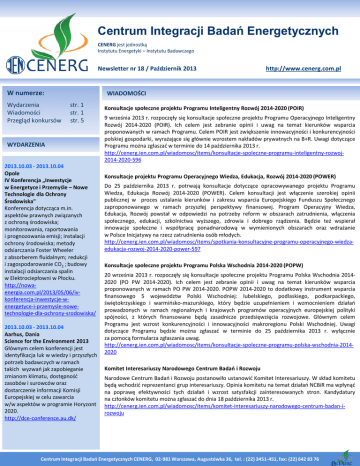 Centrum Integracji Badań Energetycznych CENERG jest jednostką Instytutu Energetyki – Instytutu Badawczego Newsletter nr 18 / Październik 2013 W numerze: Wydarzenia Wiadomości Przegląd konkursów http://www.cenerg.com.pl WIADOMOŚCI str. 1 str. 1 str. 5 WYDARZENIA 2013.10.03 - 2013.10.04 Opole IV Konferencja „Inwestycje w Energetyce i Przemyśle – Nowe Technologie dla Ochrony Środowiska" Konferencja dotycząca m.in. aspektów prawnych związanych z ochroną środowiska; monitorowania, raportowania i prognozowania emisji; instalacji ochrony środowiska; metody odsiarczania Foster Wheeler z absorberem fluidalnym; redukcji i zagospodarowanie CO2 ; budowy instalacji odsiarczania spalin w Elektrociepłowni w Płocku. http://nowaenergia.com.pl/2013/05/06/ivkonferencja-inwestycje-wenergetyce-i-przemysle-nowetechnologie-dla-ochrony-srodowiska/ 2013.10.03 - 2013.10.04 Aarhus, Dania Science for the Environment 2013 Głównym celem konferencji jest identyfikacja luk w wiedzy i przyszłych potrzeb badawczych w ramach takich wyzwań jak zapobieganie zmianom klimatu, dostępność zasobów i surowców oraz dostarczenie informacji Komisji Europejskiej w celu zawarcia w/w aspektów w programie Horyzont 2020. http://dce-conference.au.dk/ Konsultacje społeczne projektu Programu Inteligentny Rozwój 2014-2020 (POIR) 9 września 2013 r. rozpoczęły się konsultacje społeczne projektu Programu Operacyjnego Inteligentny Rozwój 2014-2020 (POIR). Ich celem jest zebranie opinii i uwag na temat kierunków wsparcia proponowanych w ramach Programu. Celem POIR jest zwiększenie innowacyjności i konkurencyjności polskiej gospodarki, wyrażające się głównie wzrostem nakładów prywatnych na B+R. Uwagi dotyczące Programu można zgłaszać w terminie do 14 października 2013 r. http://cenerg.ien.com.pl/wiadomosc/items/konsultacje-spoleczne-programu-inteligentny-rozwoj2014-2020-596 Konsultacje projektu Programu Operacyjnego Wiedza, Edukacja, Rozwój 2014-2020 (POWER) Do 25 października 2013 r. potrwają konsultacje dotyczące opracowywanego projektu Programu Wiedza, Edukacja Rozwój 2014-2020 (POWER). Celem konsultacji jest włączenie szerokiej opinii publicznej w proces ustalania kierunków i zakresu wsparcia Europejskiego Funduszu Społecznego zaproponowanego w ramach przyszłej perspektywy finansowej. Program Operacyjny Wiedza, Edukacja, Rozwój powstał w odpowiedzi na potrzeby reform w obszarach zatrudnienia, włączenia społecznego, edukacji, szkolnictwa wyższego, zdrowia i dobrego rządzenia. Będzie też wspierał innowacje społeczne i współpracę ponadnarodową w wymienionych obszarach oraz wdrażanie w Polsce Inicjatywy na rzecz zatrudnienia osób młodych. http://cenerg.ien.com.pl/wiadomosc/items/spotkania-konsultacyjne-programu-operacyjnego-wiedzaedukacja-rozwoj-2014-2020-power-597 Konsultacje społeczne projektu Programu Polska Wschodnia 2014-2020 (POPW) 20 września 2013 r. rozpoczęły się konsultacje społeczne projektu Programu Polska Wschodnia 20142020 (PO PW 2014-2020). Ich celem jest zebranie opinii i uwag na temat kierunków wsparcia proponowanych w ramach PO PW 2014-2020. POPW 2014-2020 to dodatkowy instrument wsparcia finansowego 5 województw Polski Wschodniej: lubelskiego, podlaskiego, podkarpackiego, świętokrzyskiego i warmińsko-mazurskiego, który będzie uzupełnieniem i wzmocnieniem działań prowadzonych w ramach regionalnych i krajowych programów operacyjnych europejskiej polityki spójności, z których finansowane będą zasadnicze przedsięwzięcia rozwojowe. Głównym celem Programu jest wzrost konkurencyjności i innowacyjności makroregionu Polski Wschodniej. Uwagi dotyczące Programu będzie można zgłaszać w terminie do 25 października 2013 r. wyłącznie za pomocą formularza zgłaszania uwag. http://cenerg.ien.com.pl/wiadomosc/items/konsultacje-spoleczne-programu-polska-wschodnia-20142020 Komitet Interesariuszy Narodowego Centrum Badań i Rozwoju Narodowe Centrum Badań i Rozwoju postanowiło ustanowić Komitet Interesariuszy. W skład komitetu będą wchodzić reprezentanci grup interesariuszy. Opinia komitetu na temat działań NCBiR ma wpłynąć na poprawę efektywności tych działań i wzrost satysfakcji zainteresowanych stron. Kandydatury na członków komitetu można zgłaszać do dnia 18 października 2013 r. http://cenerg.ien.com.pl/wiadomosc/items/komitet-interesariuszy-narodowego-centrum-badan-irozwoju Centrum Integracji Badań Energetycznych CENERG, 02-981 Warszawa, Augustówka 36, tel. : (22) 3451-451, fax: (22) 642 83 76 2013.10.03 Gliwice Oferty stażowe i stypendialne w godzinę. Poszukiwanie partnerów do projektu i tworzenie konsorcjum Spotkanie dotyczące aktualnych ofert stażowych i stypendialnych kierowanych do doktorantów i naukowców na różnych etapach kariery zawodowej oraz skutecznych sposobów poszukiwania partnerów do realizacji projektów badawczych i budowania międzynarodowych konsorcjów. http://www.kpk.gov.pl/aktualnosci /imprezy/i.html?id=5036 2013.10.04 Kraków Konsultacje społeczne Programu Infrastruktura i Środowisko Celem konsultacji jest zebranie opinii i uwag na temat kierunków wsparcia proponowanych w ramach POIiŚ 2014-2020. http://www.pois.gov.pl/2014_2020 /Strony/Konsultacje_spoleczne_POI iS2014_2020_09082013.aspx 2013.10.06 - 2013.10.09 Kopenhaga, Dania IEEE ISGT Europe 2013 Konferencji dotycząca najnowszych technologii inteligentnych sieci i związanych z nimi rozwiązań w zakresie zwiększenia udziału odnawialnych oraz rozproszonych źródeł energii w systemie elektroenergetycznym. http://www.ieee-isgt-2013.eu/ 2013.10.07 - 2013.10.09 Innsbruck, Austria HYDRO 2013 Konferencja dotycząca energetyki wodnej, w tym zaplanowanych systemów wodnych, modernizacji oraz budowy nowych elektrowni, a także dostosowania do zmian klimatycznych. http://www.hydropowerdams.com/hydro-2013-conferencemission.php?c_id=120 Nowy materiał termoelektryczny Naukowcy z Politechniki w Wiedniu (TU Wien) opracowal