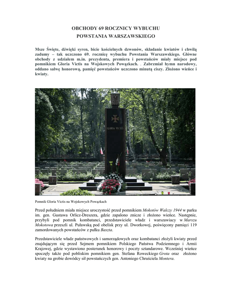 OBCHODY 69 ROCZNICY WYBUCHU POWSTANIA WARSZAWSKIEGO Msze Święte, dźwięki syren, bicie kościelnych dzwonów, składanie kwiatów i chwilą zadumy – tak uczczono 69. rocznicę wybuchu Powstania Warszawskiego. Główne obchody z udziałem m.in. prezydenta, premiera i powstańców miały miejsce pod pomnikiem Gloria Victis na Wojskowych Powązkach. . Zabrzmiał hymn narodowy, oddano salwę honorową, pamięć powstańców uczczono minutą ciszy. ZłoŜono wieńce i kwiaty. Pomnik Gloria Victis na Wojskowych Powązkach Przed południem miała miejsce uroczystość przed pomnikiem Mokotów Walczy 1944 w parku im. gen. Gustawa Orlicz-Dreszera, gdzie zapalono znicze i złoŜono wieńce. Następnie, przybyli pod pomnik kombatanci, przedstawiciele władz i warszawiacy w Marszu Mokotowa przeszli ul. Puławską pod obelisk przy ul. Dworkowej, poświęcony pamięci 119 zamordowanych powstańców z pułku Baszta. Przedstawiciele władz państwowych i samorządowych oraz kombatanci złoŜyli kwiaty przed znajdującym się przed Sejmem pomnikiem Polskiego Państwa Podziemnego i Armii Krajowej, gdzie wystawiono posterunek honorowy i poczty sztandarowe. Wcześniej wieńce spoczęły takŜe pod pobliskim pomnikiem gen. Stefana Roweckiego Grota oraz złoŜono kwiaty na grobie dowódcy sił powstańczych gen. Antoniego Chruściela Montera. Pomnik Polskiego Państwa Podziemnego i Armii Krajowej Wieczorem a Kopcu Powstania Warszawskiego na stołecznym Mokotowie zapalono ogień pamięci przyniesiony z Grobu Nieznanego śołnierza przez sztafetę pokoleń złoŜoną z kombatantów, Ŝołnierzy i harcerek. Jej dowódcą był powstaniec z pułku AK „Baszta” – Jerzy Grzelak. Uroczyste rozpalenie Ogniska Pamięci w ramach obchodów /PAP Prezes Światowego Związku śołnierzy AK Leszek śukowski przypomniał okoliczności wybuchu powstania, którego rozpoczęcie uznał za umotywowane politycznie. - Trzeba przyznać, Ŝe w potrzebie rodacy potrafią się jednoczyć; w powstaniu pod dowództwo AK oddały się wszystkie ugrupowania zbrojne odmienne politycznie np. Narodowe Siły Zbrojne, Bataliony Chłopskie, Armia Ludowa. Rozpoczęcie powstania warszawskiego nie było więc wymysłem garstki zapaleńców, tylko konsekwencją działań rządu w Londynie i krajowej reprezentacji politycznej, miało charakter polityczny - dodał śukowski. O 17, godzinie wybuchu powstania, w całym kraju zawyły syreny alarmowe. Przede wszystkim w Warszawie wiele osób przystanęło na chwilę, by oddać cześć powstańcom; zatrzymały się samochody, autobusy i tramwaje. Stołeczne obchody zakończyły uroczystości i modlitwa ekumeniczna przy pomniku PolegliNiepokonani 1939-1945na wolskim Cmentarzu Powstańców Warszawy. Wieczorem na pl. Zamkowym zaplanowano koncert piosenek powstańczych Warszawiacy śpiewają (nie)zakazane piosenki, a na Kopcu Powstania Warszawskiego na Czerniakowie rozpalenie Ognia Pamięci. Uroczystości zakończy o północy premiera spektaklu Marcina Cecko Kamienne niebo zamiast gwiazd w Muzeum Powstania Warszawskiego. Z udziałem władz miejskich, parlamentarzystów Ziemi Częstochowskiej, przedstawicieli Światowego Związku śołnierzy Armii Krajowej Okręgu Częstochowy, kombatantów, młodzieŜy i przedstawicieli Kościoła odbyły się w Częstochowie obchody 69. rocznicy Powstania Warszawskiego. Uroczyste obchody rozpoczęły się minutą ciszy za poległych w Powstaniu Warszawskim i Mszą św. o godz. 17 w kościele pw. Najświętszego Imienia Maryi w Częstochowie. Po Mszy św. odbył się przemarsz pod Pomnik - Grób Nieznanego śołnierza w alei Sienkiewicza, w podjasnogórskich parkach. Tu uczestnicy uroczystości uczczili ofiary Powstania Warszawskiego. Od początku jego wybuchu, losami Powstania Warszawskiego i powstańców interesowali się mieszkańcy Częstochowy. Miasto niosło powstańcom pomoc militarną. Reakcja okupantów niemieckich na ten czyn była natychmiastowa. 6 sierpnia 1944 r. Niemcy odpowiedzieli rozkazem, na mocy którego miano aresztować i wymordować niemal 10 tys. mieszkańców Częstochowy, którzy starali się za wszelką cenę wspomóc walczącą Warszawę. 14 sierpnia 1944 na pomoc powstańcom warszawskim, po mobilizacji oddziałów Armii Krajowej, wyruszyło 2,5 tys. Ŝołnierzy, a z nimi zgrupowania Jerzego Kurpińskiego „Ponurego” i Marcina Tarchalskiego „Marcina”. W nocy z 16 na 17 sierpnia na Starym Mieście w Warszawie zginął Eugeniusz Stasiecki, który w 1944 r. pełnił funkcję zastępcy naczelnika Szarych Szeregów, twórca konspiracyjnego harcerskiego hufca częstochowskiego „Obraz”. Z Częstochową związany był m.in. Wojciech Omyła, który walczył m.in. o zdobycie obozu „Gęsiówka”. Zginął 8 sierpnia 1944 r. na terenie cmentarza ewangelickiego na Woli. Z Częstochową związany był równieŜ Antoni Zębik twórca radiostacji „Błyskawica”. W Warszawie w czasie powstania obecny był równieŜ ks. Antoni Marchewka, późniejszy redaktor naczelny „Niedzieli” w latach 1945-53, który w schronach spowiadał powstańców. Częstochowianie starali się wspierać takŜe materialnie uciekinierów i wysiedlonych z Warszawy. 13 września 1944 r. otwarto biuro dla ewakuowanych z Warszawy, pomocy udzielał takŜe Polski Komitet Opiekuńczy. Mieszkańcy powstańczej Warszawy uzyskiwali wsparcie od Kościoła. 7 października 1944 r. biskup częstochowski Teodor Kubina wydał Odezwę Arcypasterską w sprawie zbiórki dla wysiedlonych z Warszawy. 19 października Siostry Zmartwychwstanki uruchomiły kuchnię w barakach przy ul. Chłopickiego. Mieszkańcy stolicy znaleźli teŜ schronienie i opiekę w domach zakonnych i przy parafiach. Szczególną rolę odegrała parafia św. Jakuba i jej proboszcz ks. Wojciech Mondry (pierwszy redaktor naczelny „Niedzieli”, w latach 1926-37). Przy kościele św. Jakuba schronienie i opiekę odnaleźli kapłani, których losy wojenne przywiodły do Częstochowy. Po Powstaniu Warszawskim swoje