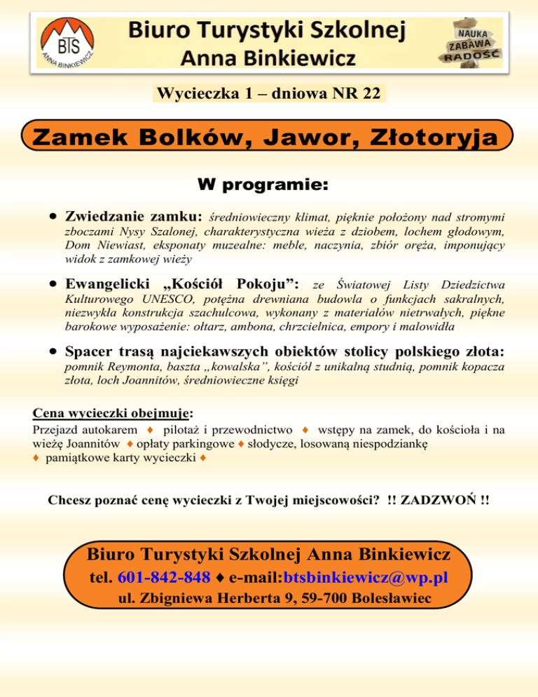 Wycieczka 1 – dniowa NR 22 Zamek Bolków, Jawor, Złotoryja W programie: Zwiedzanie zamku: średniowieczny klimat, pięknie położony nad stromymi zboczami Nysy Szalonej, charakterystyczna wieża z dziobem, lochem głodowym, Dom Niewiast, eksponaty muzealne: meble, naczynia, zbiór oręża, imponujący widok z zamkowej wieży Ewangelicki „Kościół Pokoju”: ze Światowej Listy Dziedzictwa Kulturowego UNESCO, potężna drewniana budowla o funkcjach sakralnych, niezwykła konstrukcja szachulcowa, wykonany z materiałów nietrwałych, piękne barokowe wyposażenie: ołtarz, ambona, chrzcielnica, empory i malowidła Spacer trasą najciekawszych obiektów stolicy polskiego złota: pomnik Reymonta, baszta „kowalska”, kościół z unikalną studnią, pomnik kopacza złota, loch Joannitów, średniowieczne księgi Cena wycieczki obejmuje: Przejazd autokarem ♦ pilotaż i przewodnictwo ♦ wstępy na zamek, do kościoła i na wieżę Joannitów ♦ opłaty parkingowe ♦ słodycze, losowaną niespodziankę ♦ pamiątkowe karty wycieczki ♦ Chcesz poznać cenę wycieczki z Twojej miejscowości? !! ZADZWOŃ !! Biuro Turystyki Szkolnej Anna Binkiewicz tel. 601-842-848 ♦ e-mail:[email protected] ul. Zbigniewa Herberta 9, 59-700 Bolesławiec