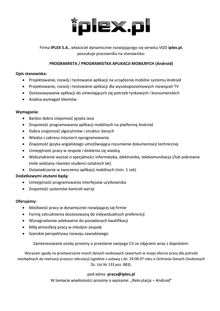 Firma IPLEX S.A., właściciel dynamicznie rozwijającego się serwisu VOD iplex.pl, poszukuje pracownika na stanowisko: PROGRAMISTA / PROGRAMISTKA APLIKACJI MOBILNYCH (Android) Opis stanowiska: Projektowanie, rozwój i testowanie aplikacji na urządzenia mobilne systemu Android Projektowanie, rozwój i testowanie aplikacji dla wysokopoziomowych rozwiązań TV Dostosowywanie aplikacji do zmieniających się potrzeb rynkowych i konsumenckich Analiza wymagań klientów Wymagania: Bardzo dobra znajomość języka Java Znajomość programowania aplikacji mobilnych na platformę Android Dobra znajomość algorytmów i struktur danych Wiedza z zakresu inżynierii oprogramowania Znajomość języka angielskiego umożliwiająca rozumienie dokumentacji technicznej Umiejętność pracy w zespole i dzielenia się wiedzą Wykształcenie wyższe o specjalności informatyka, elektronika, telekomunikacja i/lub pokrewne (mile widziany również studenci ostatnich lat) Doświadczenie w tworzeniu aplikacji mobilnych (min. 1 rok) Dodatkowymi atutami będą: Umiejętność programowania interfejsów użytkownika Znajomość systemów kontroli wersji Oferujemy: Możliwość pracy w dynamicznie rozwijającej się firmie Formę zatrudnienia dostosowaną do indywidualnych preferencji Wynagrodzenie adekwatne do posiadanych kwalifikacji Miłą atmosferę pracy w młodym zespole Szerokie perspektywy rozwoju zawodowego Zainteresowane osoby prosimy o przesłanie swojego CV ze zdjęciem wraz z dopiskiem: Wyrażam zgodę na przetwarzanie moich danych osobowych zawartych w mojej ofercie pracy dla potrzeb niezbędnych do realizacji procesu rekrutacji (zgodnie z ustawą z dn. 29.08.97 roku o Ochronie Danych Osobowych Dz. Ust Nr 133 poz. 883). pod adres: [email protected] W temacie wiadomości prosimy o wpisanie: „Rekrutacja – Android” Firma IPLEX S.A., właściciel dynamicznie rozwijającego się serwisu VOD iplex.pl, poszukuje pracownika na stanowisko: PYTHON DEVELOPER Opis stanowiska: Projektowanie i rozwój aplikacji front-end dla serwisu VOD Dostosowywanie aplikacji do zmieniających się potrzeb rynkowych i konsumenckich Analiza wymagań klientów Wymagania: Bardzo dobra znajomość języków Python i JavaScript Doświadczenie w pracy z frameworkami webowymi (np. Django, Pylons, Pyramid) Znajomość technologii HTML, CSS Dobra znajomość algorytmów i struktur danych Wiedza z zakresu inżynierii oprogramowania Znajomość języka angielskiego umożliwiająca rozumienie dokumentacji technicznej Umiejętność pracy w zespole i dzielenia się wiedzą Wykształcenie wyższe o specjalności informatyka, elektronika, telekomunikacja i/lub pokrewne (mile widziany również studenci ostatnich lat) Doświadczenie w tworzeniu aplikacji web (min. 1 rok) Dodatkowymi atutami będą: Znajomość bibliotek JavaScript: jQuery, jQuery UI Znajomość systemów kontroli wersji Oferujemy: Możliwość pracy w dynamicznie rozwijającej się firmie Formę zatrudnienia dostosowaną do indywidualnych preferencji Wynagrodzenie adekwatne do posiadanych kwalifikacji Miłą atmosferę pracy w młodym zespole Szerokie perspektywy rozwoju zawodowego Zainteresowane osoby prosimy o przesłanie swojego CV ze zdjęciem wraz z dopiskiem: Wyrażam zgodę na przetwarzanie moich danych osobowych zawartych w mojej ofercie pracy dla potrzeb niezbędnych do realizacji procesu rekrutacji (zgodnie z ustawą z dn. 29.08.97 roku o Ochronie Danych Osobowych Dz. Ust Nr 133 poz. 883). pod adres: [email protected] W temacie wiadomości prosimy o wpisanie: „Rekrutacja – Python Developer” Firma IPLEX S.A., właściciel dynamicznie rozwijającego się serwisu VOD iplex.pl, poszukuje pracownika na stanowisko: PROGRAMISTA / PROGRAMISTKA APLIKACJI MOBILNYCH (iOS) Opis stanowiska: Projektowanie, rozwój i testowanie aplikacji na urządzenia mobilne systemu iOS Dostosowywanie aplikacji do zmieniających się potrzeb rynkowych i konsumenckich Analiza wymagań klientów Wymagania: Znajomość programowania aplikacji mobilnych na platformę iOS (native)0 Dobra znajomość algorytmów i struktur danych Wiedza z zakresu inżynierii oprogramowania Znajomość języka angielskiego umożliwiająca rozumienie dokumentacji technicznej Umiejętność pracy w zespole i dzielenia się wiedzą Wykształcenie wyższe o specjalności informatyka, elektronika, telekomunikacja i/lub pokrewne (mile widziany również studenci ostatnich lat) Doświadczenie w tworzeniu aplikacji mobilnych (min. 1 rok) Dodatkowymi atutami będą: Umiejętność programowania interfejsów użytkownika Znajomość systemów kontroli wersji Oferujemy: Możliwość pracy w dynamicznie rozwijającej się firmie Formę zatrudnienia dostosowaną do indywidualnych preferencji Wynagrodzenie adekwatne do posiadanych kwalifikacji Miłą atmosferę pracy w młodym zespole Szerokie perspektywy rozwoju zawodowego Zainteresowane osoby prosimy o przesłanie swojego CV ze zdjęciem wraz z dopiskiem: Wyrażam zgodę na przetwarzanie moich danych osobowych zawartych w mojej ofercie pracy dla potrzeb niezbędnych do realizacji procesu rekrutacji (zgodnie z ustawą z dn. 29.08.97 roku o Ochronie Danych Osobowych Dz. Ust Nr 133 poz. 883). pod adres: [email protected] W temacie wiadomości prosimy o wpisanie: „Rekrutacja – iOS”