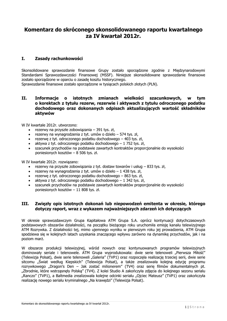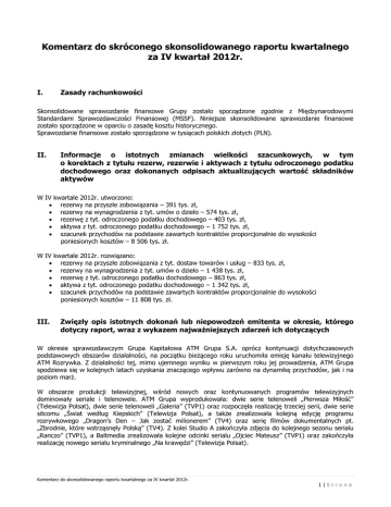Komentarz do skróconego skonsolidowanego raportu kwartalnego za IV kwartał 2012r. I. Zasady rachunkowości Skonsolidowane sprawozdanie finansowe Grupy zostało sporządzone zgodnie z Międzynarodowymi Standardami Sprawozdawczości Finansowej (MSSF). Niniejsze skonsolidowane sprawozdanie finansowe zostało sporządzone w oparciu o zasadę kosztu historycznego. Sprawozdanie finansowe zostało sporządzone w tysiącach polskich złotych (PLN). II. Informacje o istotnych zmianach wielkości szacunkowych, w tym o korektach z tytułu rezerw, rezerwie i aktywach z tytułu odroczonego podatku dochodowego oraz dokonanych odpisach aktualizujących wartość składników aktywów W IV kwartale 2012r. utworzono: rezerwy na przyszłe zobowiązania – 391 tys. zł, rezerwy na wynagrodzenia z tyt. umów o dzieło – 574 tys. zł, rezerwę z tyt. odroczonego podatku dochodowego – 403 tys. zł, aktywa z tyt. odroczonego podatku dochodowego – 1 752 tys. zł, szacunek przychodów na podstawie zawartych kontraktów proporcjonalnie do wysokości poniesionych kosztów – 8 506 tys. zł. W IV kwartale 2012r. rozwiązano: rezerwy na przyszłe zobowiązania z tyt. dostaw towarów i usług – 833 tys. zł, rezerwy na wynagrodzenia z tyt. umów o dzieło – 1 438 tys. zł, rezerwę z tyt. odroczonego podatku dochodowego – 863 tys. zł, aktywa z tyt. odroczonego podatku dochodowego – 1 342 tys. zł, szacunek przychodów na podstawie zawartych kontraktów proporcjonalnie do wysokości poniesionych kosztów – 11 808 tys. zł. III. Zwięzły opis istotnych dokonań lub niepowodzeń emitenta w okresie, którego dotyczy raport, wraz z wykazem najważniejszych zdarzeń ich dotyczących W okresie sprawozdawczym Grupa Kapitałowa ATM Grupa S.A. oprócz kontynuacji dotychczasowych podstawowych obszarów działalności, na początku bieżącego roku uruchomiła emisję kanału telewizyjnego ATM Rozrywka. Z działalności tej, mimo ujemnego wyniku w pierwszym roku jej prowadzenia, ATM Grupa spodziewa się w kolejnych latach uzyskania znaczącego wpływu zarówno na dynamikę przychodów, jak i na poziom marż. W obszarze produkcji telewizyjnej, wśród nowych oraz kontynuowanych programów telewizyjnych dominowały seriale i telenowele. ATM Grupa wyprodukowała: dwie serie telenoweli „Pierwsza Miłość” (Telewizja Polsat), dwie serie telenoweli „Galeria” (TVP1) oraz rozpoczęła realizację trzeciej serii, dwie serie sitcomu „Świat według Kiepskich” (Telewizja Polsat), a także zrealizowała kolejną edycję programu rozrywkowego „Dragon’s Den – Jak zostać milionerem” (TV4) oraz serię filmów dokumentalnych pt. „Zbrodnie, które wstrząsnęły Polską” (TV4). Z kolei Studio A zakończyła zdjęcia do kolejnego sezonu serialu „Ranczo” (TVP1), a Baltmedia zrealizowała kolejne odcinki serialu „Ojciec Mateusz” (TVP1) oraz zakończyła realizację nowego serialu kryminalnego „Na krawędzi” (Telewizja Polsat). Komentarz do skonsolidowanego raportu kwartalnego za IV kwartał 2012r. 1|Strona Działalność związaną z zarządzaniem aktywami telewizyjnym prowadzą w Grupie Kapitałowej spółki ATM System (obsługa sprzętowa oraz świadczenie usług związanych z postprodukcją), ATM Studio (wynajem powierzchni studyjnych) oraz ATM FX (realizacja efektów specjalnych). ATM System, poza obsługą sprzętową produkcji realizowanych w ramach Grupy Kapitałowej ATM Grupa S.A., świadczyła też usługi dla podmiotów zewnętrznych m.in. do programów „Bitwa na głosy” (realizowana dla TVP przez Mastiff Media Polska), „Malanowski & Partnerzy” (realizowana przez Constantin Entertainment dla Telewizji Polsat). Oprócz obsługi takich wydarzeń sportowych jak np. Speedway Grand Prix oraz meczy piłkarskich Ekstraklasy, spółka brała także udział w realizacji tak spektakularnych wydarzeń sportowych jak French Open, Wimbledon, City Challenge Baku oraz Igrzyska Olimpijskie 2012. Współpracowała również z Miastem Stołecznym Warszawa przy organizacji imprezy masowej - Strefa Kibica UEFA EURO 2012. Z imprez muzycznych, w których realizacji Spółka brała udział można wymienić m.in. 49 KFPP Opole 2012, Burn Selector Festival, Gala VIVAT COMET czy Heineken Opene’er Festival. Z istotnych zadań inwestycyjnych Spółki zakończonych w okresie sprawozdawczym należy przede wszystkim wymienić budowę drugiego wozu realizacyjnego w technologii HD, który jako jedyny w Polsce jest przygotowany do rejestracji obrazu w technologii 3D. Na uwagę zasługuje fakt, że w następnym okresie sprawozdawczym oba wozy HD mają być w pełni wykorzystywane o czym świadczą zawarte umowy przez ATM System (m.in. umowa na realizację wizji i emisji materiałów telewizyjnych z meczów rozgrywek Ekstraklasy czy różnego rodzaju imprezy muzyczne). Z kolei ATM Studio od początku roku realizowała działania w kierunku sprzedaży powierzchni studyjnych i biurowych w nowym kompleksie studyjnym w Warszawie. Obiekt ten zdążył już zdobyć wiele pozytywnych ocen w zakresie jego funkcjonalności i jakości. Spółka świadczyła usługi wynajmu swoich powierzchni m.in. takim podmiotom jak: Teatr Nowy Krzysztofa Warlikowskiego (realizacja spektakli teatralnych), OTO sp. z o.o., Redworks sp. z o.o., Bomaye sp. z o.o. (realizacja filmów reklamowych), Sony Europe (organizacja imprez eventowych) czy Telewizji Polskiej S.A. (realizacja kolejnej edycji muzycznego show „Bitwa na Głosy”). Uruchomienie nowoczesnego kompleksu studyjnego w Warszawie jest ważnym krokiem w dalszym umacnianiu pozycji Grupy na rynku oraz daje wraz z usługami świadczonymi przez ATM System możliwość oferowania kompleksowych usług realizacji telewizyjnych dla rynku producenckiego. Uzupełnieniem oferty Grupy są usługi w zakresie realizacji efektów specjalnych świadczone przez spółkę ATM FX na potrzeby produkcji filmowych i telewizyjnych. Spółka w okresie sprawozdawczym zrealizowała m.in. efekty specj