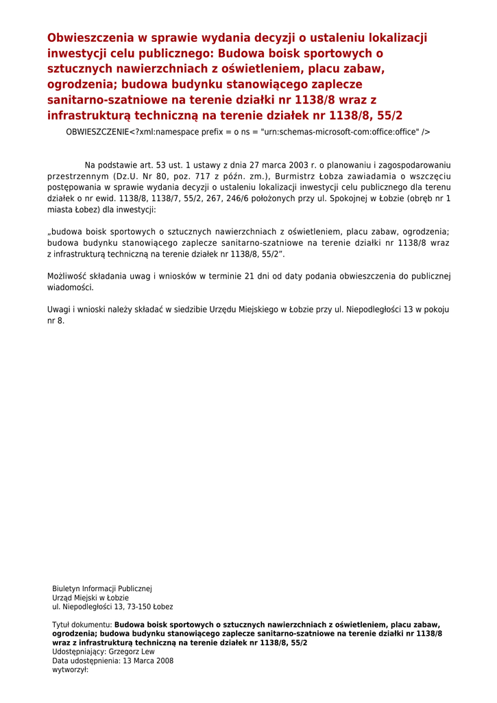 Obwieszczenia w sprawie wydania decyzji o ustaleniu lokalizacji inwestycji celu publicznego: Budowa boisk sportowych o sztucznych nawierzchniach z oświetleniem, placu zabaw, ogrodzenia; budowa budynku stanowiącego zaplecze sanitarno-szatniowe na terenie działki nr 1138/8 wraz z infrastrukturą techniczną na terenie działek nr 1138/8, 55/2 OBWIESZCZENIE<?xml:namespace prefix = o ns = "urn:schemas-microsoft-com:office:office" /> Na podstawie art. 53 ust. 1 ustawy z dnia 27 marca 2003 r. o planowaniu i zagospodarowaniu przestrzennym (Dz.U. Nr 80, poz. 717 z późn. zm.), Burmistrz Łobza zawiadamia o wszczęciu postępowania w sprawie wydania decyzji o ustaleniu lokalizacji inwestycji celu publicznego dla terenu działek o nr ewid. 1138/8, 1138/7, 55/2, 267, 246/6 położonych przy ul. Spokojnej w Łobzie (obręb nr 1 miasta Łobez) dla inwestycji: „budowa boisk sportowych o sztucznych nawierzchniach z oświetleniem, placu zabaw, ogrodzenia; budowa budynku stanowiącego zaplecze sanitarno-szatniowe na terenie działki nr 1138/8 wraz z infrastrukturą techniczną na terenie działek nr 1138/8, 55/2”. Możliwość składania uwag i wniosków w terminie 21 dni od daty podania obwieszczenia do publicznej wiadomości. Uwagi i wnioski należy składać w siedzibie Urzędu Miejskiego w Łobzie przy ul. Niepodległości 13 w pokoju nr 8. Biuletyn Informacji Publicznej Urząd Miejski w Łobzie ul. Niepodległości 13, 73-150 Łobez Tytuł dokumentu: Budowa boisk sportowych o sztucznych nawierzchniach z oświetleniem, placu zabaw, ogrodzenia; budowa budynku stanowiącego zaplecze sanitarno-szatniowe na terenie działki nr 1138/8 wraz z infrastrukturą techniczną na terenie działek nr 1138/8, 55/2 Udostępniający: Grzegorz Lew Data udostępnienia: 13 Marca 2008 wytworzył: