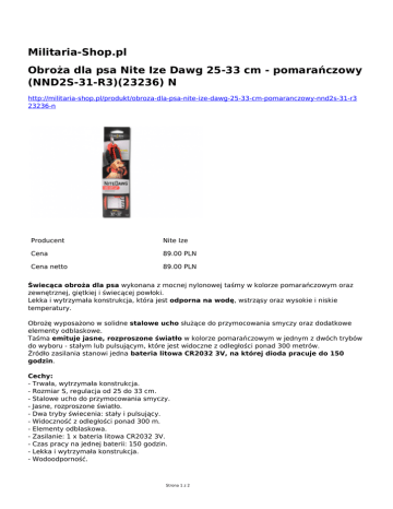 Militaria-Shop.pl Obroża dla psa Nite Ize Dawg 25-33 cm - pomarańczowy (NND2S-31-R3)(23236) N http://militaria-shop.pl/produkt/obroza-dla-psa-nite-ize-dawg-25-33-cm-pomaranczowy-nnd2s-31-r3 23236-n Producent Nite Ize Cena 89.00 PLN Cena netto 89.00 PLN Świecąca obroża dla psa wykonana z mocnej nylonowej taśmy w kolorze pomarańczowym oraz zewnętrznej, giętkiej i świecącej powłoki. Lekka i wytrzymała konstrukcja, która jest odporna na wodę, wstrząsy oraz wysokie i niskie temperatury. Obrożę wyposażono w solidne stalowe ucho służące do przymocowania smyczy oraz dodatkowe elementy odblaskowe. Taśma emituje jasne, rozproszone światło w kolorze pomarańczowym w jednym z dwóch trybów do wyboru - stałym lub pulsującym, które jest widoczne z odległości ponad 300 metrów. Źródło zasilania stanowi jedna bateria litowa CR2032 3V, na której dioda pracuje do 150 godzin. Cechy: - Trwała, wytrzymała konstrukcja. - Rozmiar S, regulacja od 25 do 33 cm. - Stalowe ucho do przymocowania smyczy. - Jasne, rozproszone światło. - Dwa tryby świecenia: stały i pulsujący. - Widoczność z odległości ponad 300 m. - Elementy odblaskowa. - Zasilanie: 1 x bateria litowa CR2032 3V. - Czas pracy na jednej baterii: 150 godzin. - Lekka i wytrzymała konstrukcja. - Wodoodporność. Strona 1 z 2 - Odporność na wstrząsy oraz wysokie i niskie temperatury. Producent: Nite Ize, USA Strona 2 z 2