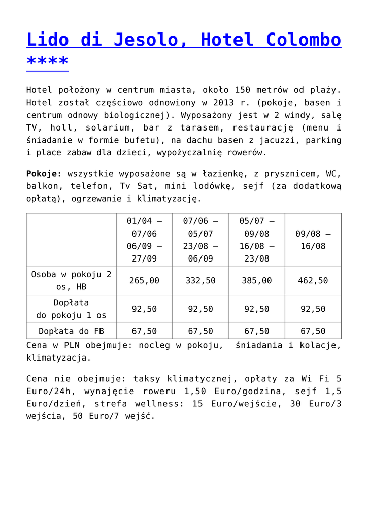 Lido di Jesolo, Hotel Colombo **** Hotel położony w centrum miasta, około 150 metrów od plaży. Hotel został częściowo odnowiony w 2013 r. (pokoje, basen i centrum odnowy biologicznej). Wyposażony jest w 2 windy, salę TV, holl, solarium, bar z tarasem, restaurację (menu i śniadanie w formie bufetu), na dachu basen z jacuzzi, parking i place zabaw dla dzieci, wypożyczalnię rowerów. Pokoje: wszystkie wyposażone są w łazienkę, z prysznicem, WC, balkon, telefon, Tv Sat, mini lodówkę, sejf (za dodatkową opłatą), ogrzewanie i klimatyzację. 01/04 – 07/06 06/09 – 27/09 07/06 – 05/07 23/08 – 06/09 05/07 – 09/08 16/08 – 23/08 09/08 – 16/08 Osoba w pokoju 2 os, HB 265,00 332,50 385,00 462,50 Dopłata do pokoju 1 os 92,50 92,50 92,50 92,50 Dopłata do FB 67,50 67,50 67,50 67,50 Cena w PLN obejmuje: nocleg w pokoju, klimatyzacja. śniadania i kolacje, Cena nie obejmuje: taksy klimatycznej, opłaty za Wi Fi 5 Euro/24h, wynajęcie roweru 1,50 Euro/godzina, sejf 1,5 Euro/dzień, strefa wellness: 15 Euro/wejście, 30 Euro/3 wejścia, 50 Euro/7 wejść.