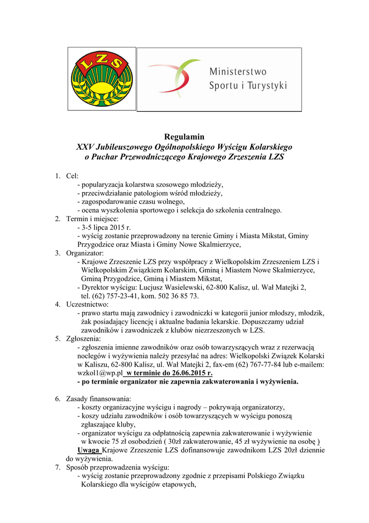 Regulamin XXV Jubileuszowego Ogólnopolskiego Wyścigu Kolarskiego o Puchar Przewodniczącego Krajowego Zrzeszenia LZS 1. Cel: - popularyzacja kolarstwa szosowego młodzieży, - przeciwdziałanie patologiom wśród młodzieży, - zagospodarowanie czasu wolnego, - ocena wyszkolenia sportowego i selekcja do szkolenia centralnego. 2. Termin i miejsce: - 3-5 lipca 2015 r. - wyścig zostanie przeprowadzony na terenie Gminy i Miasta Mikstat, Gminy Przygodzice oraz Miasta i Gminy Nowe Skalmierzyce, 3. Organizator: - Krajowe Zrzeszenie LZS przy współpracy z Wielkopolskim Zrzeszeniem LZS i Wielkopolskim Związkiem Kolarskim, Gminą i Miastem Nowe Skalmierzyce, Gminą Przygodzice, Gminą i Miastem Mikstat, - Dyrektor wyścigu: Lucjusz Wasielewski, 62-800 Kalisz, ul. Wał Matejki 2, tel. (62) 757-23-41, kom. 502 36 85 73. 4. Uczestnictwo: - prawo startu mają zawodnicy i zawodniczki w kategorii junior młodszy, młodzik, żak posiadający licencję i aktualne badania lekarskie. Dopuszczamy udział zawodników i zawodniczek z klubów niezrzeszonych w LZS. 5. Zgłoszenia: - zgłoszenia imienne zawodników oraz osób towarzyszących wraz z rezerwacją noclegów i wyżywienia należy przesyłać na adres: Wielkopolski Związek Kolarski w Kaliszu, 62-800 Kalisz, ul. Wał Matejki 2, fax-em (62) 767-77-84 lub e-mailem: [email protected] w terminie do 26.06.2015 r. - po terminie organizator nie zapewnia zakwaterowania i wyżywienia. 6. Zasady finansowania: - koszty organizacyjne wyścigu i nagrody – pokrywają organizatorzy, - koszy udziału zawodników i osób towarzyszących w wyścigu ponoszą zgłaszające kluby, - organizator wyścigu za odpłatnością zapewnia zakwaterowanie i wyżywienie w kwocie 75 zł osobodzień ( 30zł zakwaterowanie, 45 zł wyżywienie na osobę ) Uwaga Krajowe Zrzeszenie LZS dofinansowuje zawodnikom LZS 20zł dziennie do wyżywienia. 7. Sposób przeprowadzenia wyścigu: - wyścig zostanie przeprowadzony zgodnie z przepisami Polskiego Związku Kolarskiego dla wyścigów etapowych, I etap 3 lipca 2015 r. godz. 14.00 Mikstat: junior młodszy – 78,5km (6 okrążeń), juniorka młodsza, młodzik, młodziczka– 31,4km (2 okrążenia), żak, żaczka – 15,7km (1 okrążenie) II etap 4 lipca 2015 r. godz. 14.30 Ludwików: junior młodszy – 75km (5 okrążeń), juniorka młodsza, młodzik, młodziczka – 30km (2 okrążenia), żak, żaczka – 15km (1 okrążenie) III etap 5 lipca 2015 r. godz. 10.30 Droszew: junior młodszy – 77km (11 okrążeń), juniorka młodsza, młodzik, młodziczka – 28km (4 okrążenia), żak, żaczka – 14km (2 okrążenia) - wyścig zostanie rozegrany w klasyfikacji indywidualnej, - junior młodszy za pierwsze trzy miejsca w klasyfikacji na etapach I, II, III otrzyma bonifikatę 10, 6, 4 sekundy - zwycięzcą w klasyfikacji generalnej zostanie zawodnik, który wraz z bonifikatami i karami osiągnie najlepszy czas, - dojazd na poszczególne etapy wynosi średnio 20km. 8. Nagrody: - junior młodszy za miejsca otrzyma na każdym etapie następujące nagrody: I miejsce 200 zł + puchar II miejsce 150 zł + puchar III miejsce 120 zł + puchar IV miejsce 100 zł V miejsce 80 zł VI miejsce 50 zł W klasyfikacji generalnej: I miejsce 200 zł + puchar III miejsce 120 zł V miejsce 80 zł II miejsce 150 zł IV miejsce 100 zł VI miejsce 50 zł - juniorka młodsza, młodzik za miejsca otrzymają na każdym etapie następujące nagrody oraz w klasyfikacji generalnej juniorek młodszych i młodzików: I miejsce 150 zł + puchar II miejsce 100 zł + puchar III miejsce 80 zł + puchar IV miejsce 70 zł V miejsce 60 zł VI miejsce 50 zł W klasyfikacji generalnej: I miejsce 150 zł + puchar III miejsce 80 zł II miejsce 100 zł - młodziczka za miejsca otrzyma na każdym etapie następujące nagrody: I miejsce 100 zł + puchar II miejsce 80 zł + puchar III miejsce 70 zł + puchar IV miejsce 60 zł V miejsce 50 zł VI miejsce 40 zł W klasyfikacji generalnej: I miejsce 100 zł + puchar III miejsce 70 zł II miejsce 80 zł Żak, żaczka za miejsca I-III na każdym etapie otrzymają puchary oraz za miejsca I-VI dyplomy i nagrody rzeczowe W klasyfikacji generalnej żaka: I miejsce 80 zł + puchar III miejsce 60 zł II miejsce 70 zł W klasyfikacji generalnej żaczek: I miejsce 60 zł + puchar III miejsce 40 zł II miejsce 50 zł Organizator przewiduje dodatkowe nagrody za lotne premie na etapach. Ilość lotnych premii zostanie podana na odprawie technicznej w dniu 3.07.2015 r. 9. Postanowienia końcowe: - zawodnicy startują na odpowiedzialność zgłaszających klubów i muszą być ubezpieczeni od NW, - wyścig rozegrany będzie przy ograniczonym ruchu drogowym, - organizator nie ponosi odpowiedzialności za wypadki i rzeczy zagubione, - ekipy powinny zgłaszać się w dniu 3.07.2015r. od godz. 10.00 do godz. 12.00 w biurze zawodów – w Miejsko- Gminnym Ośrodku Kultury w Mikstacie, ul. Chopina 1, TELEFON ORGANIZATORA: 502 36 85 73, - wyżywienie rozpoczyna się w dniu 3.07.2015 r. od kolacji i kończy się obiadem w dniu 5.07.2015 r. - odprawa techniczna odbędzie się w dniu 3.07.2014 r. o godz. 13.00 w biurze zawodów w Mikstacie, - w sprawie wyścigu należy kontaktować się z Wielkopolskim Związkiem Kolarskim w Kaliszu, 62-800 Kalisz, ul. Wał Matejki 2, tel. (62) 757-23-41, fax. 767-77-84 w godz. od 10.00-16.00, - zawodnicy startują w kaskach sztywnych, - noclegi: Bursa Medycznego Studium Zawodowego, Ostrów Wlkp, ul. Limanowskiego 17, tel: (62) 736-24-78 10. Szpitale: - Szpital Rejonowy w Ostrzeszowie, ul. Wolności 4, tel: 730 34 36, - Szpital Miejski w Ostrowie Wlkp, ul. Limanowskiego 20, tel: 595 11 00, - Szpital Zespolony w Kaliszu, ul. Poznańska 79, tel. 765 12 51. Krajowe Zrzeszenie Ludowe Zespoły Sportowe