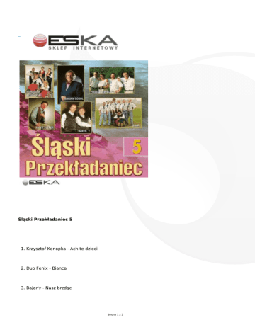 Śląski Przekładaniec 5 1. Krzysztof Konopka - Ach te dzieci 2. Duo Fenix - Bianca 3. Bajer'y - Nasz brzdąc Strona 1 z 3 4. B.A.R. - Byle było słońce 5. Oliver - Do zakochania jeden krok 6. Piotr Szefer - Hej! Bonjur 7. Janusz Żyłka & Prospekt - Pytanie dla taty 8. Proskauer Echo - Nie szukej szczyńścia hen daleko 9. Marian Gogol - Białe majowe bzy 10. Mirosław Szołtysek & Andrzej Skaźnik - Miłosny flirt 11. Eliot - Melancholii czas 12. Mirosław Jędrowski - Hej moja ziemo 13. Trapery - Mój przyjaciel 14. Katarzyna Motyka - Tńczmy calutką noc 15. Jacek Krupa - Życie w pięknym raju 16. Kormorany - Za Tobą pójdę 17. Marzenia Mikołajczyk & Jacek Krupa - Kołyszmy serduszka Strona 2 z 3 18. Robert Szewczyk - Miłość ma słodki smak 19. Adam Lozor - Balsam miłości Strona 3 z 3