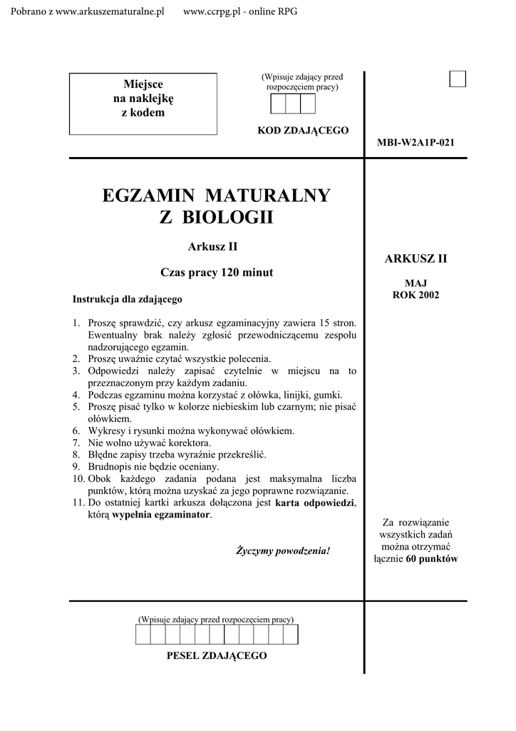 Pobrano z www.arkuszematuralne.pl www.ccrpg.pl - online RPG (Wpisuje zdaj¹cy przed rozpoczêciem pracy) Miejsce na naklejkê z kodem KOD ZDAJ¥CEGO MBI-W2A1P-021 EGZAMIN MATURALNY Z BIOLOGII Arkusz II ARKUSZ II Czas pracy 120 minut MAJ ROK 2002 Instrukcja dla zdaj¹cego 1. Proszê sprawdziæ, czy arkusz egzaminacyjny zawiera 15 stron. Ewentualny brak nale¿y zg³osiæ przewodnicz¹cemu zespo³u nadzoruj¹cego egzamin. 2. Proszê uwa¿nie czytaæ wszystkie polecenia. 3. Odpowiedzi nale¿y zapisaæ czytelnie w miejscu na to przeznaczonym przy ka¿dym zadaniu. 4. Podczas egzaminu mo¿na korzystaæ z o³ówka, linijki, gumki. 5. Proszê pisaæ tylko w kolorze niebieskim lub czarnym; nie pisaæ o³ówkiem. 6. Wykresy i rysunki mo¿na wykonywaæ o³ówkiem. 7. Nie wolno u¿ywaæ korektora. 8. B³êdne zapisy trzeba wyranie przekreliæ. 9. Brudnopis nie bêdzie oceniany. 10. Obok ka¿dego zadania podana jest maksymalna liczba punktów, któr¹ mo¿na uzyskaæ za jego poprawne rozwi¹zanie. 11. Do ostatniej kartki arkusza do³¹czona jest karta odpowiedzi, któr¹ wype³nia egzaminator. ¯yczymy powodzenia! (Wpisuje zdaj¹cy przed rozpoczêciem pracy) PESEL ZDAJ¥CEGO Za rozwi¹zanie wszystkich zadañ mo¿na otrzymaæ ³¹cznie 60 punktów 2 Egzamin maturalny z biologii Arkusz II Zadanie 26. (2 pkt) Porównuj¹c budowê struktur komórkowych, mo¿na wskazaæ podobieñstwa i ró¿nice. Przedstaw dwie cechy wspólne w budowie chloroplastu i mitochondrium. ....................................................................................................................................................... ....................................................................................................................................................... Zadanie 27. (3 pkt) Poni¿ej przedstawiono zdania prawdziwe i b³êdne, dotycz¹ce porównania budowy i funkcji komórki prokariotycznej i eukariotycznej. Wybierz sporód sformu³owañ od A do F dwa, które s¹ b³êdne. Uzasadnij wybór ka¿dego z nich. A. Komórki prokariotyczne maj¹ prostsz¹ budowê ni¿ komórki eukariotyczne. B. Komórki prokariotyczne przeprowadzaj¹ fermentacjê, a eukariotyczne oddychaj¹ wy³¹cznie tlenowo. C. Oba typy komórek mno¿¹ siê na drodze podzia³ów. D. Tylko w komórkach eukariotycznych biosynteza bia³ek odbywa siê w rybosomach. E. Zarówno komórki prokariotyczne, jak i eukariotyczne mog¹ zawieraæ chlorofil i przeprowadzaæ fotosyntezê. F. Sposób zapisu informacji genetycznej jest taki sam w obu typach komórek. ....................................................................................................................................................... ....................................................................................................................................................... ....................................................................................................................................................... Zadanie 28. (2 pkt) Rysunki przedstawiaj¹ niektóre typy owoców. Okrel wspóln¹ cechê budowy oraz wspóln¹ funkcjê charakterystyczn¹ dla wszystkich przedstawionych wy¿ej typów owoców. ....................................................................................................................................................... ....................................................................................................................................................... Egzamin maturalny z biologii Arkusz II 3 Zadanie 29. (2 pkt) Pe³nienie specyficznych funkcji w komórce przez okrelone sk³adniki chemiczne jest zwi¹zane z ich w³aciwociami. Na przyk³ad DNA jest nonikiem informacji genetycznej. Okrel, jakie znaczenie dla pe³nienia funkcji biologicznej przez DNA ma jego zdolnoæ do replikacji oraz do transkrypcji. ....................................................................................................................................................... ....................................................................................................................................................... ....................................................................................................................................................... Zadanie 30. (2 pkt) Poni¿szy rysunek obrazuje w sposób uproszczony budowê nab³onka jednowarstwowego, wielorzêdowego wycielaj¹cego, miêdzy innymi, drogi oddechowe. Wyjanij, na czym polega adaptacja w budowie nab³onka dróg oddechowych do pe³nienia okrelonych funkcji przez tê tkankê. W odpowiedzi uwzglêdnij dwa elementy budowy nab³onka oddechowego przedstawione na rysunku. ....................................................................................................................................................... ....................................................................................................................................................... Egzamin maturalny z biologii Arkusz II 4 Zadanie 31. (2 pkt) Schematy A i B przedstawiaj¹ zdolnoæ kie³kowania nasion trawy - kostrzewy czerwonej roz³ogowej (Festuca rubra fallax). Schemat A – zdolnoæ kie³kowania nasion o ró¿nej zawartoci wody (8%, 10%, 14%) przechowywanych w temperaturze 30o C. Schemat B – zdolnoæ kie³kowania nasion zawieraj¹cych 14% wody, przechowywanych w ró¿nej temperaturze (2o C, 10o C, 30o C). Okrel, na czym polegaj¹ zale¿noci miêdzy zdolnoci¹ kie³kowania nasion badanego gatunku trawy a: - zawartoci¹ wody w tych nasionach, - temperatur¹ przechowywania nasion. ....................................................................................................................................................... ....................................................................................................................................................... ..................................................................................
