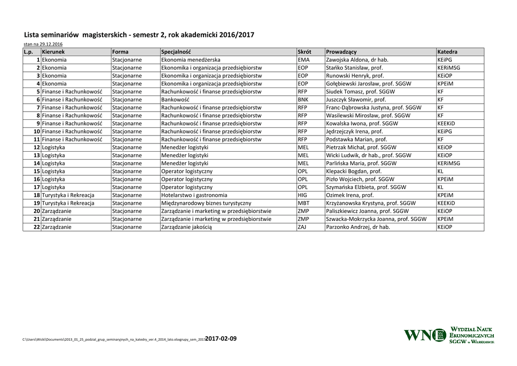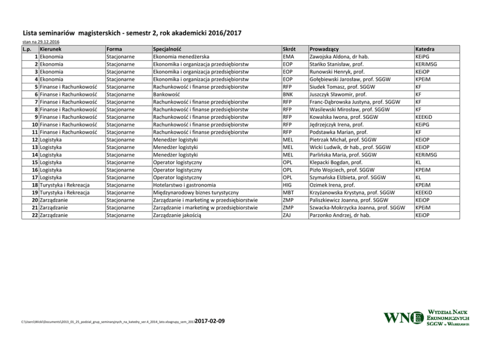 Lista seminariów magisterskich ‐ semestr 2, rok akademicki 2016/2017 stan na 29.12.2016 L.p. 1 2 3 4 5 6 7 8 9 10 11 12 13 14 15 16 17 18 19 20 21 22 Kierunek Ekonomia Ekonomia Ekonomia Ekonomia Finanse i Rachunkowość Finanse i Rachunkowość Finanse i Rachunkowość Finanse i Rachunkowość Finanse i Rachunkowość Finanse i Rachunkowość Finanse i Rachunkowość Logistyka Logistyka Logistyka Logistyka Logistyka Logistyka Turystyka i Rekreacja Turystyka i Rekreacja Zarządzanie Zarządzanie Zarządzanie Forma Stacjonarne Stacjonarne Stacjonarne Stacjonarne Stacjonarne Stacjonarne Stacjonarne Stacjonarne Stacjonarne Stacjonarne Stacjonarne Stacjonarne Stacjonarne Stacjonarne Stacjonarne Stacjonarne Stacjonarne Stacjonarne Stacjonarne Stacjonarne Stacjonarne Stacjonarne Specjalność Ekonomia menedżerska Ekonomika i organizacja przedsiębiorstw Ekonomika i organizacja przedsiębiorstw Ekonomika i organizacja przedsiębiorstw Rachunkowość i finanse przedsiębiorstw Bankowość Rachunkowość i finanse przedsiębiorstw Rachunkowość i finanse przedsiębiorstw Rachunkowość i finanse przedsiębiorstw Rachunkowość i finanse przedsiębiorstw Rachunkowość i finanse przedsiębiorstw Menedżer logistyki Menedżer logistyki Menedżer logistyki Operator logistyczny Operator logistyczny Operator logistyczny Hotelarstwo i gastronomia Międzynarodowy biznes turystyczny Zarządzanie i marketing w przedsiębiorstwie Zarządzanie i marketing w przedsiębiorstwie Zarządzanie jakością 2017‐02‐09 C:\Users\Wicki\Documents\2013_01_25_podzial_grup_seminaryjnych_na_katedry_ver.4_2014_lato.xlsxgrupy_sem_2017 Skrót EMA EOP EOP EOP RFP BNK RFP RFP RFP RFP RFP MEL MEL MEL OPL OPL OPL HIG MBT ZMP ZMP ZAJ Prowadzący Zawojska Aldona, dr hab. Stańko Stanisław, prof. Runowski Henryk, prof. Gołębiewski Jarosław, prof. SGGW Siudek Tomasz, prof. SGGW Juszczyk Sławomir, prof. Franc‐Dąbrowska Justyna, prof. SGGW Wasilewski Mirosław, prof. SGGW Kowalska Iwona, prof. SGGW Jędrzejczyk Irena, prof. Podstawka Marian, prof. Pietrzak Michał, prof. SGGW Wicki Ludwik, dr hab., prof. SGGW Parlińska Maria, prof. SGGW Klepacki Bogdan, prof. Pizło Wojciech, prof. SGGW Szymańska Elżbieta, prof. SGGW Ozimek Irena, prof. Krzyżanowska Krystyna, prof. SGGW Paliszkiewicz Joanna, prof. SGGW Szwacka‐Mokrzycka Joanna, prof. SGGW Parzonko Andrzej, dr hab. Katedra KEiPG KERiMSG KEiOP KPEiM KF KF KF KF KEEKiD KEiPG KF KEiOP KEiOP KERiMSG KL KPEiM KL KPEiM KEEKiD KEiOP KPEiM KEiOP