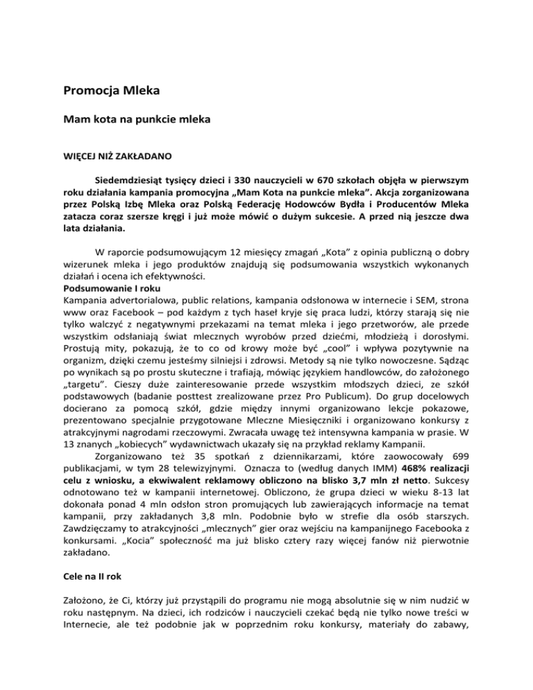 Promocja Mleka Mam kota na punkcie mleka WIĘCEJ NIŻ ZAKŁADANO Siedemdziesiąt tysięcy dzieci i 330 nauczycieli w 670 szkołach objęła w pierwszym roku działania kampania promocyjna „Mam Kota na punkcie mleka”. Akcja zorganizowana przez Polską Izbę Mleka oraz Polską Federację Hodowców Bydła i Producentów Mleka zatacza coraz szersze kręgi i już może mówić o dużym sukcesie. A przed nią jeszcze dwa lata działania. W raporcie podsumowującym 12 miesięcy zmagań „Kota” z opinia publiczną o dobry wizerunek mleka i jego produktów znajdują się podsumowania wszystkich wykonanych działań i ocena ich efektywności. Podsumowanie I roku Kampania advertorialowa, public relations, kampania odsłonowa w internecie i SEM, strona www oraz Facebook – pod każdym z tych haseł kryje się praca ludzi, którzy starają się nie tylko walczyć z negatywnymi przekazami na temat mleka i jego przetworów, ale przede wszystkim odsłaniają świat mlecznych wyrobów przed dziećmi, młodzieżą i dorosłymi. Prostują mity, pokazują, że to co od krowy może być „cool” i wpływa pozytywnie na organizm, dzięki czemu jesteśmy silniejsi i zdrowsi. Metody są nie tylko nowoczesne. Sądząc po wynikach są po prostu skuteczne i trafiają, mówiąc językiem handlowców, do założonego „targetu”. Cieszy duże zainteresowanie przede wszystkim młodszych dzieci, ze szkół podstawowych (badanie posttest zrealizowane przez Pro Publicum). Do grup docelowych docierano za pomocą szkół, gdzie między innymi organizowano lekcje pokazowe, prezentowano specjalnie przygotowane Mleczne Miesięczniki i organizowano konkursy z atrakcyjnymi nagrodami rzeczowymi. Zwracała uwagę też intensywna kampania w prasie. W 13 znanych „kobiecych” wydawnictwach ukazały się na przykład reklamy Kampanii. Zorganizowano też 35 spotkań z dziennikarzami, które zaowocowały 699 publikacjami, w tym 28 telewizyjnymi. Oznacza to (według danych IMM) 468% realizacji celu z wniosku, a ekwiwalent reklamowy obliczono na blisko 3,7 mln zł netto. Sukcesy odnotowano też w kampanii internetowej. Obliczono, że grupa dzieci w wieku 8-13 lat dokonała ponad 4 mln odsłon stron promujących lub zawierających informacje na temat kampanii, przy zakładanych 3,8 mln. Podobnie było w strefie dla osób starszych. Zawdzięczamy to atrakcyjności „mlecznych” gier oraz wejściu na kampanijnego Facebooka z konkursami. „Kocia” społeczność ma już blisko cztery razy więcej fanów niż pierwotnie zakładano. Cele na II rok Założono, że Ci, którzy już przystąpili do programu nie mogą absolutnie się w nim nudzić w roku następnym. Na dzieci, ich rodziców i nauczycieli czekać będą nie tylko nowe treści w Internecie, ale też podobnie jak w poprzednim roku konkursy, materiały do zabawy, szkoleniowe, czy wreszcie specjalne pikniki organizowane w plenerze. Założono też pozyskanie nowych uczestników kampanii w liczbie co najmniej 105 200 dzieci (czyli ok. 5009 klas w 1 tys. szkół). Rozwój trendu zwiększania wiedzy na temat wartości mleka i jego produktów ma być dalej utrzymane w lekkiej i przyjemnej formie. Oprócz już sprawdzonych działań mają być ogłoszone konkursy muzyczne (nagranie „kocio-mlecznej” piosenki) gdzie nagroda będą między innymi odtwarzacze mp3, konkursy plastyczne (kot w komiksie), tu nagrodą mają być aparaty cyfrowe, konkursy filmowe (energia z mleka), których laureaci wzbogacą się o tablety multimedialne. Duży nacisk w drugim roku kampanii „Mam kota na punkcie mleka” ma być położony, na wyjaśnianiu słów kluczowych czyli najczęściej wpisywanych w wyszukiwarkach. Chodzi tu o np.o takie hasła: mleko UHT, mleko pasteryzowane, skład mleka, czy mleko tuczy, czy mleko szkodzi, mleko a odchudzanie, mleko dla dorosłych, mleko w diecie, fakty i mity picie mleka. Dodatkowo ma być wydany profesjonalny komiks lub książka fantasy „z przygodami kota, który przez swoje wścibstwo pakuje się w różne kabały, ale dzięki wrodzonemu sprytowi i zwinności zawsze wychodzi z nich cało”. Inicjatorami kampanii „Mam kota na punkcie mleka” są Polska Izba Mleka oraz Polska Federacja Hodowców Bydła i Producentów Mleka. Celem akcji jest m.in. edukacja i poinformowanie grup docelowych (dzieci i młodzieży oraz matek, rodziców i nauczycieli) o właściwościach odżywczych mleka i produktów mleczarskich (jogurty, sery i mleko), zwiększenie wiedzy na temat racjonalnego odżywiania się oraz utrwalenie pozytywnego wizerunku mleka i produktów mleczarskich. Program ma trwać trzy lata. Bogusław Bazydło Szczegóły kampanii „Mam kota na punkcie mleka” na stronie www.mamkotanpunkciemleka.pl