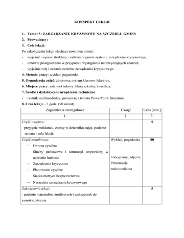 KONSPEKT LEKCJI 1. Temat 5: ZARZĄDZANIE KRYZYSOWE NA SZCZEBLU GMINY 2. Prowadzący: 3. Cele lekcji: Po zakończeniu lekcji słuchacz powinien umieć: - wyjaśnić i opisać strukturę i zadania organów systemu zarządzania kryzysowego, - omówić postępowanie w przypadku wystąpienia nadzwyczajnych zdarzeń, - wyjaśnić rolę i zadania centrów zarządzania kryzysowego. 4. Metoda pracy: wykład, pogadanka. 5. Organizacja zajęć: zbiorowa, system klasowo-lekcyjny. 6. Miejsce pracy: sala wykładowa, klasa szkolna, świetlica. 7. Środki i dydaktyczne urządzenia techniczne: - rzutnik multimedialny, prezentacja tematu PowerPoint, literatura 8. Czas lekcji – 2 godz. (90 minut). Zagadnienia szczegółowe Uwagi Czas [min.] 1. 2. 3. Część wstępna: 5 - przyjęcie meldunku, zapisy w dzienniku zajęć, podanie tematu i celu lekcji. Część zasadnicza: Wykład, pogadanka 80 Obrona cywilna Służby państwowe i samorząd terytorialny w ochronie ludności Foliogramy, zdjęcia, Zarządzanie kryzysowe Prezentacja Planowanie cywilne multimedialna Siatka-matryca bezpieczeństwa Narzędzia zarządzania kryzysowego Zakończenie lekcji; - podanie materiałów źródłowych i wskazówek do samokształcenia. 5
