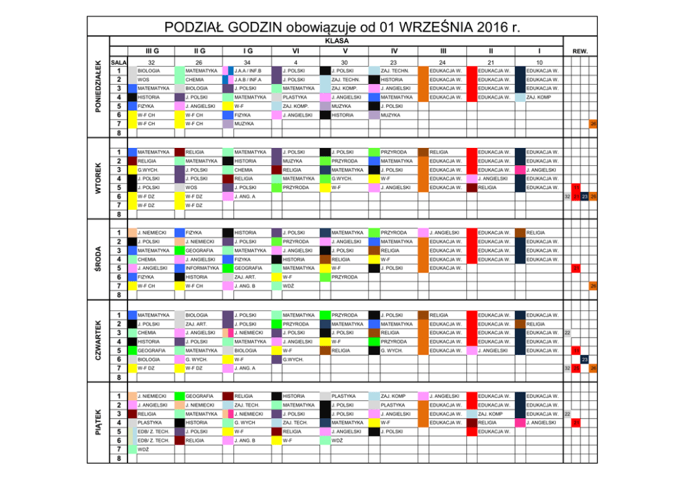 PIĄTEK CZWARTEK ŚRODA WTOREK PONIEDZIAŁEK PODZIAŁ GODZIN obowiązuje od 01 WRZEŚNIA 2016 r. SALA III G II G IG VI KLASA V IV III II I 32 26 34 4 30 23 24 21 10 1 2 3 4 5 6 7 8 BIOLOGIA MATEMATYKA J.A.A / INF.B J. POLSKI J. POLSKI ZAJ. TECHN. EDUKACJA W. EDUKACJA W. EDUKACJA W. WOS CHEMIA J.A.B / INF.A J. POLSKI ZAJ. TECHN. HISTORIA EDUKACJA W. EDUKACJA W. EDUKACJA W. MATEMATYKA BIOLOGIA J. POLSKI MATEMATYKA ZAJ. KOMP. J. ANGIELSKI EDUKACJA W. EDUKACJA W. EDUKACJA W. HISTORIA J. POLSKI MATEMATYKA PLASTYKA J. ANGIELSKI MATEMATYKA EDUKACJA W. EDUKACJA W. ZAJ. KOMP FIZYKA J. ANGIELSKI W-F ZAJ. KOMP. MUZYKA J. POLSKI W-F CH W-F CH FIZYKA J. ANGIELSKI HISTORIA MUZYKA W-F CH W-F CH MUZYKA 1 2 3 4 5 6 7 8 MATEMATYKA RELIGIA MATEMATYKA J. POLSKI J. POLSKI PRZYRODA RELIGIA EDUKACJA W. EDUKACJA W. RELIGIA MATEMATYKA HISTORIA MUZYKA PRZYRODA MATEMATYKA EDUKACJA W. EDUKACJA W. EDUKACJA W. G.WYCH. J. POLSKI CHEMIA RELIGIA MATEMATYKA J. POLSKI EDUKACJA W. EDUKACJA W. J. ANGIELSKI J. POLSKI J. POLSKI RELIGIA MATEMATYKA G.WYCH. W-F EDUKACJA W. J. ANGIELSKI EDUKACJA W. J. POLSKI WOS J. POLSKI PRZYRODA W-F J. ANGIELSKI EDUKACJA W. RELIGIA EDUKACJA W. W-F DZ W-F DZ J. ANG. A W-F DZ W-F DZ 1 2 3 4 5 6 7 8 J. NIEMIECKI FIZYKA HISTORIA J. POLSKI MATEMATYKA PRZYRODA J. ANGIELSKI EDUKACJA W. RELIGIA J. POLSKI J. NIEMIECKI J. POLSKI PRZYRODA J. ANGIELSKI MATEMATYKA EDUKACJA W. EDUKACJA W. EDUKACJA W. MATEMATYKA GEOGRAFIA MATEMATYKA J. ANGIELSKI J. POLSKI RELIGIA EDUKACJA W. EDUKACJA W. EDUKACJA W. CHEMIA J. ANGIELSKI FIZYKA HISTORIA RELIGIA W-F EDUKACJA W. EDUKACJA W. EDUKACJA W. J. ANGIELSKI INFORMATYKA GEOGRAFIA MATEMATYKA W-F J. POLSKI EDUKACJA W. FIZYKA HISTORIA ZAJ. ART. W-F PRZYRODA W-F CH W-F CH J. ANG. B WDŻ 1 2 3 4 5 6 7 8 MATEMATYKA BIOLOGIA J. POLSKI MATEMATYKA PRZYRODA J. POLSKI RELIGIA EDUKACJA W. EDUKACJA W. J. POLSKI ZAJ. ART. J. POLSKI PRZYRODA MATEMATYKA MATEMATYKA EDUKACJA W. EDUKACJA W. RELIGIA CHEMIA J. ANGIELSKI J. NIEMIECKI J. POLSKI J. POLSKI RELIGIA EDUKACJA W. EDUKACJA W. EDUKACJA W. HISTORIA J. POLSKI MATEMATYKA J. ANGIELSKI W-F PRZYRODA EDUKACJA W. EDUKACJA W. EDUKACJA W. GEOGRAFIA MATEMATYKA BIOLOGIA W-F RELIGIA G. WYCH. EDUKACJA W. J. ANGIELSKI EDUKACJA W. BIOLOGIA G. WYCH. W-F G.WYCH. W-F DZ W-F DZ J. ANG. A 1 2 3 4 5 6 7 8 J. NIEMIECKI GEOGRAFIA RELIGIA HISTORIA PLASTYKA ZAJ. KOMP J. ANGIELSKI EDUKACJA W. EDUKACJA W. J. ANGIELSKI J. NIEMIECKI ZAJ. TECH. MATEMATYKA J. POLSKI PLASTYKA EDUKACJA W. EDUKACJA W. EDUKACJA W. RELIGIA MATEMATYKA J. NIEMIECKI J. POLSKI J. POLSKI J. ANGIELSKI EDUKACJA W. ZAJ. KOMP EDUKACJA W. PLASTYKA HISTORIA G. WYCH ZAJ. TECH. MATEMATYKA W-F EDUKACJA W. RELIGIA J. ANGIELSKI EDB/ Z. TECH. J. POLSKI W-F RELIGIA J. ANGIELSKI J. POLSKI EDB/ Z. TECH. RELIGIA J. ANG. B W-F WDŻ WDŻ REW. 26 11 32 21 23 26 21 26 22 11 23 32 25 EDUKACJA W. 22 21 26