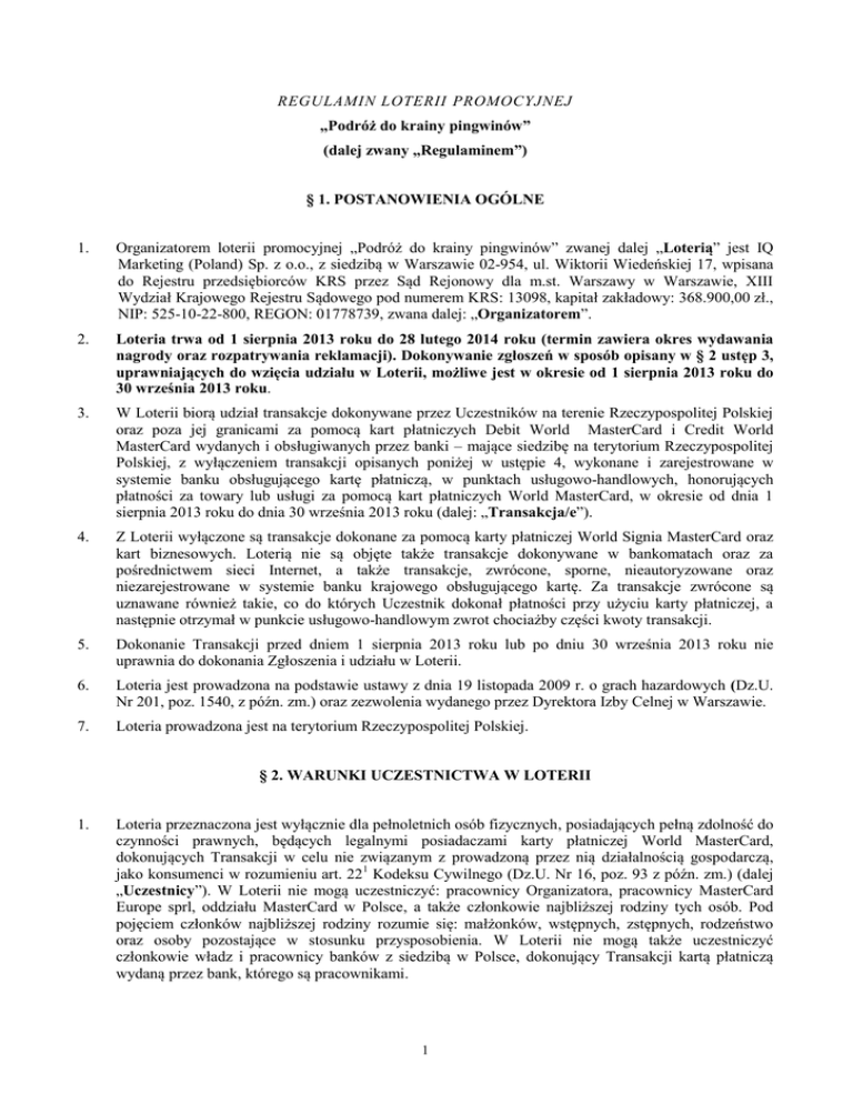 REGULAMIN LOTERII PROMOCYJNEJ „Podróż do krainy pingwinów” (dalej zwany „Regulaminem”) § 1. POSTANOWIENIA OGÓLNE 1. Organizatorem loterii promocyjnej „Podróż do krainy pingwinów” zwanej dalej „Loterią” jest IQ Marketing (Poland) Sp. z o.o., z siedzibą w Warszawie 02-954, ul. Wiktorii Wiedeńskiej 17, wpisana do Rejestru przedsiębiorców KRS przez Sąd Rejonowy dla m.st. Warszawy w Warszawie, XIII Wydział Krajowego Rejestru Sądowego pod numerem KRS: 13098, kapitał zakładowy: 368.900,00 zł., NIP: 525-10-22-800, REGON: 01778739, zwana dalej: „Organizatorem”. 2. Loteria trwa od 1 sierpnia 2013 roku do 28 lutego 2014 roku (termin zawiera okres wydawania nagrody oraz rozpatrywania reklamacji). Dokonywanie zgłoszeń w sposób opisany w § 2 ustęp 3, uprawniających do wzięcia udziału w Loterii, możliwe jest w okresie od 1 sierpnia 2013 roku do 30 września 2013 roku. 3. W Loterii biorą udział transakcje dokonywane przez Uczestników na terenie Rzeczypospolitej Polskiej oraz poza jej granicami za pomocą kart płatniczych Debit World MasterCard i Credit World MasterCard wydanych i obsługiwanych przez banki – mające siedzibę na terytorium Rzeczypospolitej Polskiej, z wyłączeniem transakcji opisanych poniżej w ustępie 4, wykonane i zarejestrowane w systemie banku obsługującego kartę płatniczą, w punktach usługowo-handlowych, honorujących płatności za towary lub usługi za pomocą kart płatniczych World MasterCard, w okresie od dnia 1 sierpnia 2013 roku do dnia 30 września 2013 roku (dalej: „Transakcja/e”). 4. Z Loterii wyłączone są transakcje dokonane za pomocą karty płatniczej World Signia MasterCard oraz kart biznesowych. Loterią nie są objęte także transakcje dokonywane w bankomatach oraz za pośrednictwem sieci Internet, a także transakcje, zwrócone, sporne, nieautoryzowane oraz niezarejestrowane w systemie banku krajowego obsługującego kartę. Za transakcje zwrócone są uznawane również takie, co do których Uczestnik dokonał płatności przy użyciu karty płatniczej, a następnie otrzymał w punkcie usługowo-handlowym zwrot chociażby części kwoty transakcji. 5. Dokonanie Transakcji przed dniem 1 sierpnia 2013 roku lub po dniu 30 września 2013 roku nie uprawnia do dokonania Zgłoszenia i udziału w Loterii. 6. Loteria jest prowadzona na podstawie ustawy z dnia 19 listopada 2009 r. o grach hazardowych (Dz.U. Nr 201, poz. 1540, z późn. zm.) oraz zezwolenia wydanego przez Dyrektora Izby Celnej w Warszawie. 7. Loteria prowadzona jest na terytorium Rzeczypospolitej Polskiej. § 2. WARUNKI UCZESTNICTWA W LOTERII 1. Loteria przeznaczona jest wyłącznie dla pełnoletnich osób fizycznych, posiadających pełną zdolność do czynności prawnych, będących legalnymi posiadaczami karty płatniczej World MasterCard, dokonujących Transakcji w celu nie związanym z prowadzoną przez nią działalnością gospodarczą, jako konsumenci w rozumieniu art. 221 Kodeksu Cywilnego (Dz.U. Nr 16, poz. 93 z późn. zm.) (dalej „Uczestnicy”). W Loterii nie mogą uczestniczyć: pracownicy Organizatora, pracownicy MasterCard Europe sprl, oddziału MasterCard w Polsce, a także członkowie najbliższej rodziny tych osób. Pod pojęciem członków najbliższej rodziny rozumie się: małżonków, wstępnych, zstępnych, rodzeństwo oraz osoby pozostające w stosunku przysposobienia. W Loterii nie mogą także uczestniczyć członkowie władz i pracownicy banków z siedzibą w Polsce, dokonujący Transakcji kartą płatniczą wydaną przez bank, którego są pracownikami. 1 2. W Loterii nie mogą brać udziału osoby prawne i jednostki organizacyjne nieposiadające osobowości prawnej. 3. Warunkiem wzięcia udziału w Loterii jest łącznie: a) dokonanie w okresie od 1 sierpnia 2013 roku do 30 września 2013 roku co najmniej jednej Transakcji o dowolnej wartości; oraz b) zachowanie oryginalnego dowodu dokonania Transakcji, w postaci wydruku z terminala płatniczego, świadczącego o dokonaniu Transakcji, w okresie o którym mowa w lit. a) powyżej; a następnie: c) zgłoszenie wykonanej Transakcji do Loterii w terminie od dnia 1 sierpnia 2013 roku, do dnia 30 września 2013 roku (dalej: „Zgłoszenie”), poprzez zarejestrowanie Transakcji na stronie internetowej www.worldpromocja.pl (dalej: „Stronie Loterii”) za pomocą elektronicznego formularza (dalej: „Formularz Zgłoszeniowy”): i. imię i nazwisko; ii. numer telefonu komórkowego iii. datę dokonania Transakcji i jej kwotę oraz walutę, iv. dane dotyczące karty, którą zgłaszana Transakcja była dokonana, tj. nazwę banku, który wydał kartę, z zastrzeżeniem, że: Jedna Transakcja może być zarejestrowana w Loterii wyłącznie jeden raz; oraz udzielenie zgody na: v. przetwarzanie danych osobowych Uczestnika w celach i w zakresie związanym z Loterią, w zakresie wskazanym w § 7 ustęp 1, oraz vi. 4. zaakceptowanie Regulaminu. Aby usprawnić dokonywanie Zgłoszeń, Uczestnik może zamiast podawania swoich danych przy każdorazowym dokonywaniu Zgłoszenia założyć konto na Stronie Loterii. W celu założenia konta, Uczestnik podaje za pośrednictwem formularza dostępnego na Stronie Loterii następujące dane: i. imię i nazwisko; ii. numer telefonu komórkowego; iii. adres mailowy; iv. wybrane przez siebie hasło dostępu do konta Uczestnika na Stronie Loterii, oraz udziela zgody na: v. przetwarzanie danych osobowych Uczestnika w celach i w zakresie związanym z założeniem konta oraz udziałem w Loterii, w zakresie wskazanym w § 7 ustęp 1, oraz vi. akceptuje Regulamin. Aktywowanie konta Uczestnika (wraz z automatycznym logowaniem Uczestnika) następuje po kliknięciu w aktywny link zawarty w wiadomości mailowej otrzymanej przez Uczestnika na podany przez niego adres poczty elektronicznej, bezpośrednio po dokonaniu rejestracji, o której mowa w § 2 ustęp 4. Późniejsze logowanie na Stronie Loterii i dokonywanie Zgłoszeń, następuje po wpisan