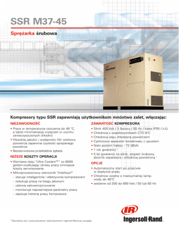 SSR M37-45 Sprężarka śrubowa Kompresory typu SSR zapewniają użytkownikom mnóstwo zalet, włączając: NIEZAWODNOŚĆ ZAWARTOŚĆ KOMPRESORA • Praca w temperaturze otoczenia do 46 °C, a także minimalizacja wyłączeń w wyniku zanieczyszczonych chłodnic • Wysokiej jakości i wydajności filtr wlotowy powietrza zapewnia czystość sprężanego powietrza • Bezserwisowa przekładnia zębata • Silnik 400 Volt / 3 fazowy / 50 Hz / klasa IP55 / /∆ • Chłodnica z współczynnikiem CTD 8°C • Chłodnica oleju chłodzona powietrzem • Cyklonowy separator kondensatu z upustem • Niski poziom hałasu - 72 dB(A) • 1 rok gwarancji 1 • 5 lat gwarancji na silnik, stopień śrubowy, zbiornik separatora i chłodnicę powietrzną 1 • Wymiana oleju "Ultra Coolant™" co 8000 godzin-wydłużając okresy pracy zmniejsza koszty serwisowania • Mikroprocesorowy sterownik "Intellisys®" - steruje inteligentnie i efektywnie kompresorem - redukuje pracę na biegu jałowym - ułatwia sekwencjonowanie - monitoruje najważniejsze parametry pracy - zapisuje historię pracy kompresora 1 Y NIŻSZE KOSZTY OPERACJI OPCJE • Automatyczny start po przerwie w dopływie prądu • Chłodnice wodne o maksymalnej temp. wody do 46°C • zasilanie od 200 do 690 Volt / 50 lub 60 Hz Skontaktuj się z autoryzowanym dystrybutorem Ingersoll-Rand po szczgóły SSR M37-45 Sprężarka śrubowa Model Ciśnienie Moc nominalna Wydajność Waga bar(g) psi(g) kW hp m3/min cfm kg ML37 MM37 MH37 MU37 7.5 8.5 10 13 109 123 145 189 37 37 37 37 50 50 50 50 6.3 6.0 5.6 4.7 222 212 198 166 880 880 880 880 ML45 MM45 MH45 MU45 7.5 8.5 10 13 109 123 145 189 45 45 45 45 60 60 60 60 7.4 7.1 6.5 5.7 261 250 230 201 900 900 900 900 Wymiary dotyczą kompresorów chłodzonych powietrzem: A - Wejście na kabel, średnica 50 mm B - Drenaż kondensatu, 1 /8” BSPT C - Wylot powietrza 11/2” BSPT D - Wylot powietrza chłodzącego E - Wlot powietrza chłodzącego F - Sterownik Kompresory firmy Ingersoll-Rand nie są przystosowane dla sprężania powietrza do oddychania. Ingersoll-Rand nie zezwala na używanie kompresorów do sprężania powietrza do oddychania i nie ponosi odpowiedzialności za używanie ich do tego celu. Informacje zawarte na powyższej karcie nie uprawniają do przedłużenia gwarancji na kompresor. Ingersoll-Rand stale ulepsza swje produkty i stąd zastrzega sobie prawo zmian bez uprzedniej informacji. www.air.irco.com/uk Industrial Air Solutions © 2004 by Ingersoll-Rand Company Limited. Printed in the UK CPN 22493498 Ingersoll-Rand European Sales Limited Swan Lane Hindley Green Wigan WN2 4EZ, UK Tel: +44 (0) 1942 257171 Fax: +44 (0) 1942 254162