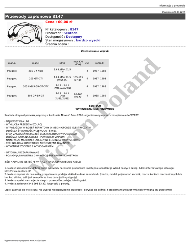 Informacje o produkcie Utworzono 06-03-2017 Przewody zapłonowe 8147 Cena : 60,00 zł Nr katalogowy : 8147 Producent : Sentech Dostępność : Dostępny Stan magazynowy : bardzo wysoki Średnia ocena : silnik Peugeot 205 GR Auto Peugeot 205 GTi-CTi Peugeot Peugeot moc KM (KW) cyl. rocznik 1.6 L (Mot XU5 1C) 4 1987 1988 1.6 L (Mot XU5 105-115 J/XU5 JA) (77-85) 4 1987 1992 305 II GLS-GR-GT-GTX 1.6 L - 1.9 L (XU51C/XU9J1) 4 1987 1988 309 GR-SR-GT 1.6 L - 1.9 L (Mot XU5S/XU9S) 4 1985 1989 80-105 (59-77) la model Po marka nd Zastosowanie wiązki: SENTECH WYPRZEDZA INNE PRZEWODY Sentech otrzymał pierwszą nagrodę w konkursie Nowość Roku 2006, organizowanym przez czasopismo autoEXPERT. ic ro n - NAJLEPSZY DLA LPG - WYKLUCZA PRZEBICIA IZOLACJI - WYPOSAŻONY W RDZEŃ FERRYTOWY O NISKIM OPORZE ELEKTRYCZNYM - DŁUŻSZA ŻYWOTNOŚĆ PRZEWODU I ŚWIEC - BRAK ZAKŁÓCEŃ URZĄDZEŃ ELEKTRYCZNYCH W POJAZDACH - DŁUŻSZA ISKRA NA ŚWIECY - PEWNIEJSZY ZAPŁON - NAJNOWSZE MATERIAŁY IZOLACYJNE ELIMINUJĄ WADY SILIKONU - TECHNOLOGIA KONSTRUKCJI NIEDOSTĘPNA DLA INNYCH - WYKONANE ZGODNIE Z WYMOGAMI OEM - ORYGINALNIE ZAPAKOWANE - POSIADAJĄ DWULETNIĄ GWARANCJĘ BEZ LIMITU KILOMETRÓW M JEŚLI NADAL NIE JESTEŚ PEWNY, CZY TO SĄ ODPOWIEDNIE KABLE: 1. Możesz samodzielnie dobrać sobie przewody na stronie producenta i następnie odnaleźć je wśród naszych aukcji. Adres internetowego katalogu: http://www.sentech.pl/ 2. Możesz napisać do nas maila z zapytaniem, podając dokładne dane samochodu (marka, model, pojemność, rocznik, moc w koniach mechanicznych lub kw, kod silnika, jeśli jest znany oraz inne dane jeśli występują). 3. Możesz wysłać nam zdjęcie starych przewodów podając ich długości. 4. Możesz zadzwonić (42 298 83 32) i poprosić o poradę. Lepiej zapytać się wiele razy, niż wybrać nieodpowiednie przewody i borykać się później z problemami związanymi z ich wymianą czy zwrotem!!! Wygenerowano w programie www.oscGold.com