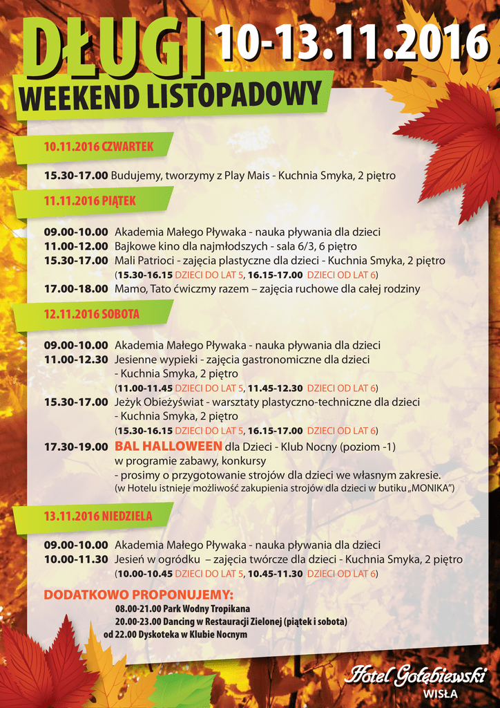 DŁUGI WEEKEND LISTOPADOWY 10-13.11.2016 10.11.2016 CZWARTEK 15.30-17.00 Budujemy, tworzymy z Play Mais - Kuchnia Smyka, 2 piętro 11.11.2016 PIĄTEK 09.00-10.00 Akademia Małego Pływaka - nauka pływania dla dzieci 11.00-12.00 Bajkowe kino dla najmłodszych - sala 6/3, 6 piętro 15.30-17.00 Mali Patrioci - zajęcia plastyczne dla dzieci - Kuchnia Smyka, 2 piętro (15.30-16.15 DZIECI DO LAT 5, 16.15-17.00 DZIECI OD LAT 6) 17.00-18.00 Mamo, Tato ćwiczmy razem – zajęcia ruchowe dla całej rodziny 12.11.2016 SOBOTA 09.00-10.00 Akademia Małego Pływaka - nauka pływania dla dzieci 11.00-12.30 Jesienne wypieki - zajęcia gastronomiczne dla dzieci - Kuchnia Smyka, 2 piętro (11.00-11.45 DZIECI DO LAT 5, 11.45-12.30 DZIECI OD LAT 6) 15.30-17.00 Jeżyk Obieżyświat - warsztaty plastyczno-techniczne dla dzieci - Kuchnia Smyka, 2 piętro (15.30-16.15 DZIECI DO LAT 5, 16.15-17.00 DZIECI OD LAT 6) 17.30-19.00 BAL HALLOWEEN dla Dzieci - Klub Nocny (poziom -1) w programie zabawy, konkursy - prosimy o przygotowanie strojów dla dzieci we własnym zakresie. (w Hotelu istnieje możliwość zakupienia strojów dla dzieci w butiku „MONIKA”) 13.11.2016 NIEDZIELA 09.00-10.00 Akademia Małego Pływaka - nauka pływania dla dzieci 10.00-11.30 Jesień w ogródku – zajęcia twórcze dla dzieci - Kuchnia Smyka, 2 piętro (10.00-10.45 DZIECI DO LAT 5, 10.45-11.30 DZIECI OD LAT 6) DODATKOWO PROPONUJEMY: 08.00-21.00 Park Wodny Tropikana 20.00-23.00 Dancing w Restauracji Zielonej (piątek i sobota) od 22.00 Dyskoteka w Klubie Nocnym WISŁA WISŁA