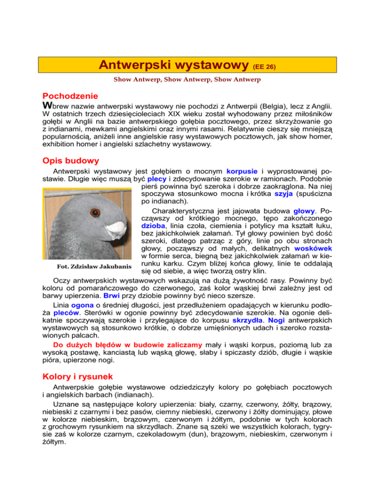 Antwerpski wystawowy (EE 26) Show Antwerp, Show Antwerp, Show Antwerp Pochodzenie Wbrew nazwie antwerpski wystawowy nie pochodzi z Antwerpii (Belgia), lecz z Anglii. W ostatnich trzech dziesięcioleciach XIX wieku został wyhodowany przez miłośników gołębi w Anglii na bazie antwerpskiego gołębia pocztowego, przez skrzyŜowanie go z indianami, mewkami angielskimi oraz innymi rasami. Relatywnie cieszy się mniejszą popularnością, aniŜeli inne angielskie rasy wystawowych pocztowych, jak show homer, exhibition homer i angielski szlachetny wystawowy. Opis budowy Antwerpski wystawowy jest gołębiem o mocnym korpusie i wyprostowanej postawie. Długie więc muszą być plecy i zdecydowanie szerokie w ramionach. Podobnie pierś powinna być szeroka i dobrze zaokrąglona. Na niej spoczywa stosunkowo mocna i krótka szyja (spuścizna po indianach). Charakterystyczna jest jajowata budowa głowy. Począwszy od krótkiego mocnego, tępo zakończonego dzioba, linia czoła, ciemienia i potylicy ma kształt łuku, bez jakichkolwiek załamań. Tył głowy powinien być dość szeroki, dlatego patrząc z góry, linie po obu stronach głowy, począwszy od małych, delikatnych woskówek w formie serca, biegną bez jakichkolwiek załamań w kierunku karku. Czym bliŜej końca głowy, linie te oddalają Fot. Zdzisław Jakubanis się od siebie, a więc tworzą ostry klin. Oczy antwerpskich wystawowych wskazują na duŜą Ŝywotność rasy. Powinny być koloru od pomarańczowego do czerwonego, zaś kolor wąskiej brwi zaleŜny jest od barwy upierzenia. Brwi przy dziobie powinny być nieco szersze. Linia ogona o średniej długości, jest przedłuŜeniem opadających w kierunku podłoŜa pleców. Sterówki w ogonie powinny być zdecydowanie szerokie. Na ogonie delikatnie spoczywają szerokie i przylegające do korpusu skrzydła. Nogi antwerpskich wystawowych są stosunkowo krótkie, o dobrze umięśnionych udach i szeroko rozstawionych palcach. Do duŜych błędów w budowie zaliczamy mały i wąski korpus, poziomą lub za wysoką postawę, kanciastą lub wąską głowę, słaby i spiczasty dziób, długie i wąskie pióra, upierzone nogi. Kolory i rysunek Antwerpskie gołębie wystawowe odziedziczyły kolory po gołębiach pocztowych i angielskich barbach (indianach). Uznane są następujące kolory upierzenia: biały, czarny, czerwony, Ŝółty, brązowy, niebieski z czarnymi i bez pasów, ciemny niebieski, czerwony i Ŝółty dominujący, płowe w kolorze niebieskim, brązowym, czerwonym i Ŝółtym, podobnie w tych kolorach z grochowym rysunkiem na skrzydłach. Znane są szeki we wszystkich kolorach, tygrysie zaś w kolorze czarnym, czekoladowym (dun), brązowym, niebieskim, czerwonym i Ŝółtym. Antwerpski wystawowy Fot. Zdzisław Jakubanis Wzorzec antwerpskiego wystawowego wymaga, aby kolory były czyste, pasy na skrzydłach wyraźne, a rysunek na skrzydłach u grochowych równomiernie rozłoŜony. Rysunek u szeków i tygrysich powinien być moŜliwie wyraźny i powinna być zachowana proporcja barw. Uwagi dotyczące hodowli Hodowla antwerpskich wystawowych nie jest tak łatwa jak innych wystawowych gołębi pochodzenia angielskiego, a to ze względu na dość mocno skrócony dziób. Potrafią jednak wykarmić swoje młode, jeśli dostarczy się im odpowiednie ziarno. Obecnie antwerpskie wystawowe hoduje się głównie w wolierach. Zatraciły one juŜ dawno dobrą orientację w terenie. W pobliŜu gołębnika fruwają jednak dość Ŝwawo i gotowe są nawet Ŝerować na polach. Prawie zawsze odnajdują drogę do gołębnika. Obrączka numer 11. Manfred Uglorz