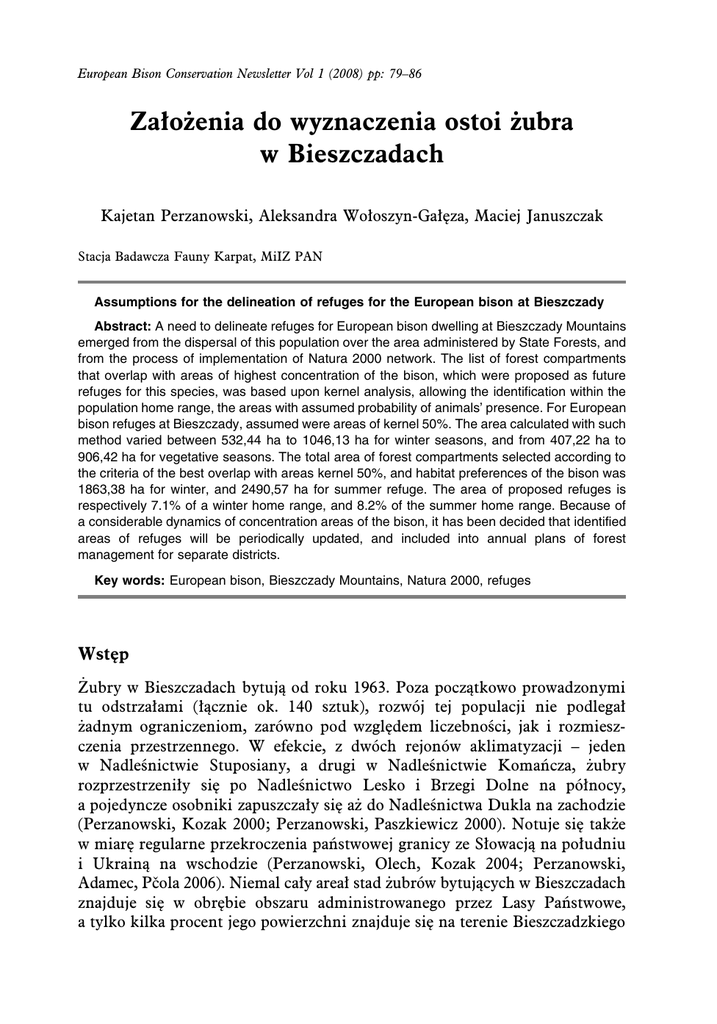 European Bison Conservation Newsletter Vol 1 (2008) pp: 79–86 Założenia do wyznaczenia ostoi żubra w Bieszczadach Kajetan Perzanowski, Aleksandra Wołoszyn-Gałęza, Maciej Januszczak Stacja Badawcza Fauny Karpat, MiIZ PAN Assumptions for the delineation of refuges for the European bison at Bieszczady Abstract: A need to delineate refuges for European bison dwelling at Bieszczady Mountains emerged from the dispersal of this population over the area administered by State Forests, and from the process of implementation of Natura 2000 network. The list of forest compartments that overlap with areas of highest concentration of the bison, which were proposed as future refuges for this species, was based upon kernel analysis, allowing the identification within the population home range, the areas with assumed probability of animals’ presence. For European bison refuges at Bieszczady, assumed were areas of kernel 50%. The area calculated with such method varied between 532,44 ha to 1046,13 ha for winter seasons, and from 407,22 ha to 906,42 ha for vegetative seasons. The total area of forest compartments selected according to the criteria of the best overlap with areas kernel 50%, and habitat preferences of the bison was 1863,38 ha for winter, and 2490,57 ha for summer refuge. The area of proposed refuges is respectively 7.1% of a winter home range, and 8.2% of the summer home range. Because of a considerable dynamics of concentration areas of the bison, it has been decided that identified areas of refuges will be periodically updated, and included into annual plans of forest management for separate districts. Key words: European bison, Bieszczady Mountains, Natura 2000, refuges Wstęp Żubry w Bieszczadach bytują od roku 1963. Poza początkowo prowadzonymi tu odstrzałami (łącznie ok. 140 sztuk), rozwój tej populacji nie podlegał żadnym ograniczeniom, zarówno pod względem liczebności, jak i rozmieszczenia przestrzennego. W efekcie, z dwóch rejonów aklimatyzacji – jeden w Nadleśnictwie Stuposiany, a drugi w Nadleśnictwie Komańcza, żubry rozprzestrzeniły się po Nadleśnictwo Lesko i Brzegi Dolne na północy, a pojedyncze osobniki zapuszczały się aż do Nadleśnictwa Dukla na zachodzie (Perzanowski, Kozak 2000; Perzanowski, Paszkiewicz 2000). Notuje się także w miarę regularne przekroczenia państwowej granicy ze Słowacją na południu i Ukrainą na wschodzie (Perzanowski, Olech, Kozak 2004; Perzanowski, Adamec, Pčola 2006). Niemal cały areał stad żubrów bytujących w Bieszczadach znajduje się w obrębie obszaru administrowanego przez Lasy Państwowe, a tylko kilka procent jego powierzchni znajduje się na terenie Bieszczadzkiego 80 Założenia do wyznaczenia ostoi Parku Narodowego (Perzanowski, Januszczak 2004). Ponieważ tak znaczna część obszaru penetrowanego przez żubry mieści się na terenie objętym gospodarką leśną, wystąpiła konieczność wyznaczenia obszarów ostoi, na których zwierzęta te oraz krytyczne dla nich siedliska podlegałyby szczególnej ochronie. Zbiegło się to w czasie z wprowadzeniem w Polsce sieci Natura 2000, w której ramach żubr jest gatunkiem priorytetowym i wymagane jest wyznaczenie dla niego obszarów krytycznych (Olech, Perzanowski 2004; Chmielewski 2004). Dane pochodzące z monitoringu bieszczadzkiej populacji żubra stały się podstawą do sporządzenia listy wydzieleń leśnych odpowiadających rejonom największej koncentracji żubrów, które zostały zaproponowane jako przyszłe ostoje dla tego gatunku. Teren badań, materiał i metody Badaniami, zgodnie z umową z RDLP Krosno na stały monitoring żubrów na terenie nadleśnictw bieszczadzkich, został objęty cały potencjalny teren bytowania tej populacji, a więc nadleśnictwa: Baligród, Brzegi Dolne, Cisna, Komańcza, Lesko, Lutowiska, Stuposiany i Wetlina. Monitoring prowadzono z różnym natężeniem od 2001 roku, lecz do niniejszej analizy użyte zostały dane z lat 2002–2007, jako najbardziej kompletne i odzwierciedlające możliwie zbliżony do bieżącego stan tej populacji (Perzanowski 2005; Perzanowski, Wołoszyn-Gałęza, Januszczak 2007). Stwierdzenia obecności żubrów będące podstawą do określenia ich frekwencji w poszczególnych partiach ich areału pochodziły z obserwacji bezpośrednich i pośrednich (tropy, kał, ślady żerowania itp.) rejestrowanych przez pracowników ALP i PAN na standardowych kartach obserwacyjnych. Dane te były uzupełniane przez namiary telemetryczne żubrów zaopatrzonych w nadajniki (łącznie 6 sztuk podczas okresu badawczego) (Perzanowski, Olech, Januszczak, Wołoszyn-Gałęza 2006). Wszystkie lokalizacje żubrów zostały wprowadzone jako warstwa tematyczna modelu rozmieszczenia przestrzennego tej populacji, sporządzonego w systemie GIS (ArcView 9.1) obejmującego również takie warstwy tematyczne jak mapa topograficzna, mapa siedliskowa, mapa drzewostanowa, mapa wysokościowa itd. Wyznaczenie miejsc koncentracji żubrów (50% prawdopodobieństwa stwierdzenia obecności) w poszczególnych latach i sezonach zostało wykonane metodą kernel (Worton 1989). Z uwagi na stosunkowo niedużą ilość danych w niektórych latach prowadzenia badań dla subpopulacji wschodniej, obszar koncentracji tych stad w obu sezonach został wyznaczony dla wszystkich lat łącznie. Następnie, na podstawie map urządzeniowych lasu dokonano wyboru wydzieleń, możliwie najdokładniej pokrywających się z granicami obszarów kernel 50% (Perzanowski, Wołoszyn-Gałęza, Januszczak 2007). Ze względu na sezonowe migracje żubrów, osobno analizowano dane dla sezonu zimowego (1 XII – 31 III) oraz wegetacyjnego (16 V – 15 X). W przypadku znacznego Perzanowski i wsp. 81 dystansu między ostojami letnimi i zimowymi, pomiędzy ostojami wyznaczono także korytarze migracyjne, przyjmując że migracja wiosenna odbywa się od 1 IV do 15 V, a jesienna od 16 X do 31 XI. Do wyznaczenia wydzieleń wchodzących w obręb korytarzy w
