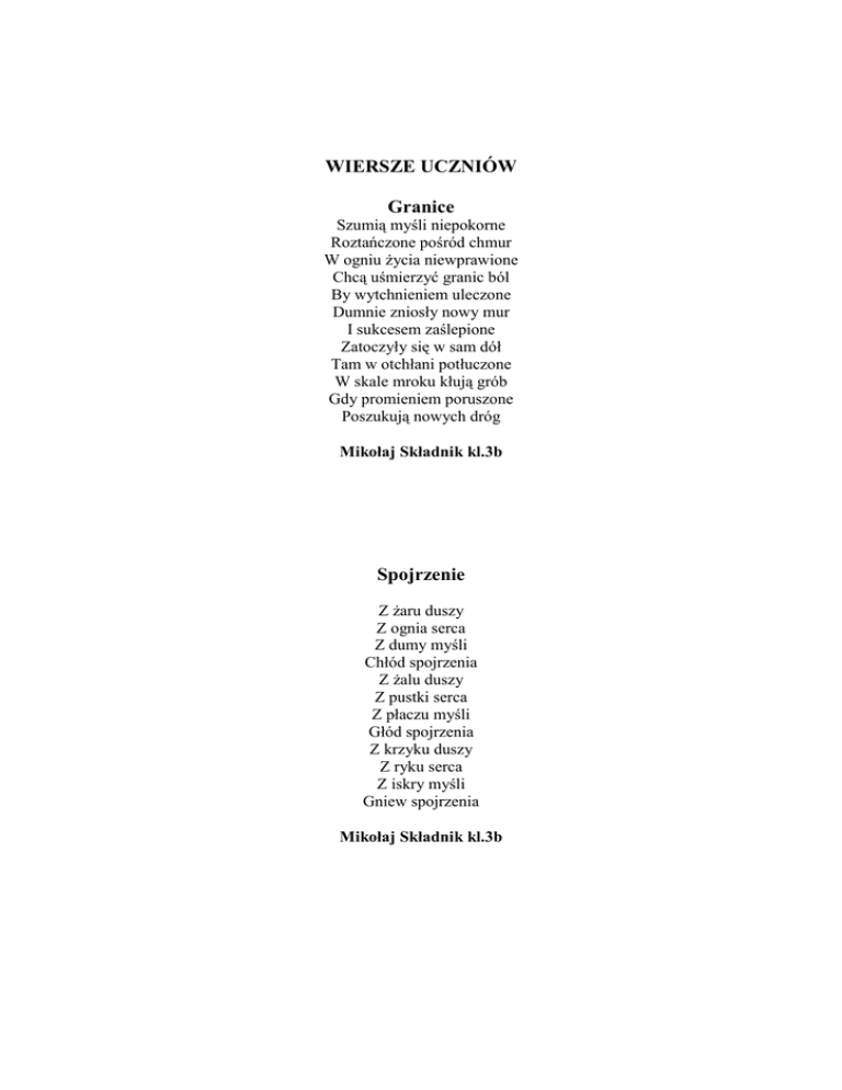 WIERSZE UCZNIÓW Granice Szumią myśli niepokorne Roztańczone pośród chmur W ogniu życia niewprawione Chcą uśmierzyć granic ból By wytchnieniem uleczone Dumnie zniosły nowy mur I sukcesem zaślepione Zatoczyły się w sam dół Tam w otchłani potłuczone W skale mroku kłują grób Gdy promieniem poruszone Poszukują nowych dróg Mikołaj Składnik kl.3b Spojrzenie Z żaru duszy Z ognia serca Z dumy myśli Chłód spojrzenia Z żalu duszy Z pustki serca Z płaczu myśli Głód spojrzenia Z krzyku duszy Z ryku serca Z iskry myśli Gniew spojrzenia Mikołaj Składnik kl.3b Wiersz o Zatorze Królestwo Zatorskie, nieopodal stolicy polskiej Krakowa, gdzie nie brak duszy odważnej I męskiej, położone miasto zwane Zatorem, W którym bramy stoją otworem Dla przejezdnych. Tam mężni wojowie Chytrze tatarskie wojska wyprowadzili w pole, Ci podążając za torem odwróconych podków końskich, Przechytrzeni przez wojów zatorskich, Ominęli miasteczko piękne, a lud tamtejszy Uniknął grabieży i mordu młodzieży. Jak w każdym miasteczku tu także Po dróżkach chodzili bajarze, Ci skorzy do opowieści Opowiadali wymyślone jak i prawdziwe wieści, O smokach, wojach walecznych Jak i o damskich licach przepięknych. Jeden z nich dnia słonecznego Siedząc na progu domu sędziego, Mężczyzny uczciwego i skromnego, Otoczony gęstym tłumem młodzieniaszków Opowiadał historię rybaków, Którzy wyłowić próbowali bezskutecznie Wielką zatorską bestię, Z ciemnych wód zbiornika miejskiego, ogromnego Karpia Zatorskiego. Ten wśród największych wędkarskich mistrzów Budził grozę większą niż zgraja rzezimieszków, Lecz najwięksi mistrzowie wędki wspólnymi siłami Spróbowali wyłowić go z diabelskiej otchłani. Po wielu trudach i znoju Dokonali czynu wielkiego pokroju. Ryba ta zaś, królewska, została przygotowana I na stole księcia Potockiego podana. Aurelia Ćwiertnia kl.2b wyróżnienie w konkursie „ Opowieści z Doliny Karpia – zatorski stragan bajek”