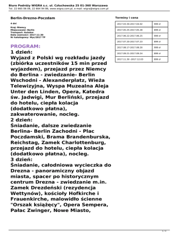 Biuro Podróży WIGRA s.c. ul. Człuchowska 25 01-360 Warszawa Tel. 22 665 06 06, 22 664 94 86, www.wigra.com.pl, e-mail: [email protected] Berlin-Drezno-Poczdam 4 dni Kraj: Niemcy Miejscowość: Berlin Transport: Autokar Data ważności: 2017-11-30 Nr katalogowy: Wyc/2017 TP PROGRAM: 1 dzień: Wyjazd z Polski wg rozkładu jazdy (zbiórka uczestników 15 min przed wyjazdem), przejazd przez Niemcy do Berlina - zwiedzanie- Berlin Wschodni - Alexanderplatz, Wieża Telewizyjna, Wyspa Muzealna Aleja Unter den Linden, Opera, Katedra św. Jadwigi, Mur Berliński, przejazd do hotelu, ciepła kolacja (dodatkowo płatna), zakwaterowanie, nocleg. 2 dzień: Śniadanie, dalsze zwiedzanie Berlina- Berlin Zachodni - Plac Poczdamski, Brama Brandenburska, Reichstag, Zamek Charlottenburg, przejazd do hotelu, ciepła kolacja (dodatkowo płatna), nocleg. 3 dzień: Śniadanie, całodniowa wycieczka do Drezna - panoramiczny objazd miasta, spacer po historycznym centrum Drezna - zwiedzanie m.in. Zamek Drezdeński (rezydencja Wettynów), kościoły Hofkirche i Frauenkirche, malowidło ścienne "Orszak książęcy", Opera Sempera, Pałac Zwinger, Nowe Miasto, Terminy i cena 2017.03.30-2017.04.02 999 zł 2017.05.25-2017.05.28 899 zł 2017.06.22-2017.06.25 999 zł 2017.07.20-2017.07.23 899 zł 2017.08.17-2017.08.20 999 zł 2017.09.21-2017.09.24 899 zł 2017.11.30 -2017.12.03 899 zł 1/3 Biuro Podróży WIGRA s.c. ul. Człuchowska 25 01-360 Warszawa Tel. 22 665 06 06, 22 664 94 86, www.wigra.com.pl, e-mail: [email protected] przejazd do hotelu, ciepła kolacja (dodatkowo płatna), nocleg. 4 dzień: Śniadanie, wykwaterowanie, przejazd do Poczdamu - zwiedzaniekompleksu parkowo - pałacowego Sanssouci, Pałac Cecilienhof miejsce podpisania Układu Poczdamskiego. Wyjazd w drogę powrotną. Przyjazd do Polski wg rozkładu jazdy. ZAREZERWUJ JUŻ DZIŚ, TEL. 22 665 06 06, 22 664 94 86 CENA ZAWIERA: przejazd autokarem- standard turystyczny (WC, Video/DVD, klimatyzacja - dostosowany do wielkości grupy), zakwaterowanie-3 noclegi hotel **/*** w Berlinie – pokoje 2 os. z łazienką (możliwość 1 dostawki), wyżywienie-3 śniadania, opieka pilota, ubezpieczenie NNW, KL, BP, podatek VAT-marża. CENA NIE ZAWIERA: biletów wstępu, przewodników lokalnych, wypożyczenia zestawów Tourist Guide System, komunikacji lokalnej, kosztów programowych. Orientacyjny koszt pakietu ok. 85 euro płatne obligatoryjnie pilotowi. Pilot rozlicza się z grupą z pobranych kwot na cele programowe. Koszty płacone za 2/3 Biuro Podróży WIGRA s.c. ul. Człuchowska 25 01-360 Warszawa Tel. 22 665 06 06, 22 664 94 86, www.wigra.com.pl, e-mail: [email protected] całą grupę (np. przewodnicy lokalni) są dzielone na wszystkich jej uczestników. UWAGI: W trakcie wyjazdu należy posiadać paszport lub dowód osobisty (dotyczy również osób niepełnoletnich). Zalecamy wykupienie ubezpieczenia kosztów rezygnacji. W celu realizacji programu cześć przejazdów może być realizowana środkami komunikacji miejskiej. INNE: Dokwaterowanie do pokoju 2 os., 2 os z dostawką lub 3 os. - bez opłat. Dopłata do pokoju 1 osobowego: 490 zł/os. 3/3 Powered by TCPDF (www.tcpdf.org)