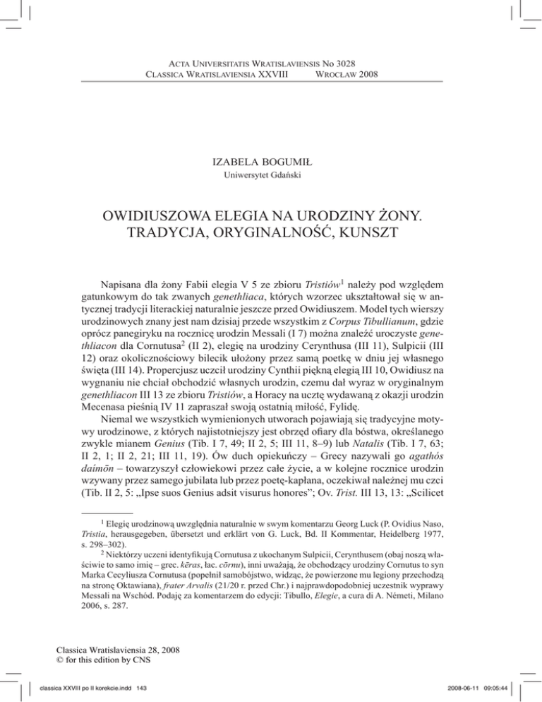 ACTA UNIVERSITATIS WRATISLAVIENSIS No 3028 CLASSICA WRATISLAVIENSIA XXVIII WROCŁAW 2008 143 IZABELA BOGUMIŁ Uniwersytet Gdański OWIDIUSZOWA ELEGIA NA URODZINY ŻONY. TRADYCJA, ORYGINALNOŚĆ, KUNSZT Napisana dla żony Fabii elegia V 5 ze zbioru Tristiów1 należy pod względem gatunkowym do tak zwanych genethliaca, których wzorzec ukształtował się w antycznej tradycji literackiej naturalnie jeszcze przed Owidiuszem. Model tych wierszy urodzinowych znany jest nam dzisiaj przede wszystkim z Corpus Tibullianum, gdzie oprócz panegiryku na rocznicę urodzin Messali (I 7) można znaleźć uroczyste genethliacon dla Cornutusa2 (II 2), elegię na urodziny Cerynthusa (III 11), Sulpicii (III 12) oraz okolicznościowy bilecik ułożony przez samą poetkę w dniu jej własnego święta (III 14). Propercjusz uczcił urodziny Cynthii piękną elegią III 10, Owidiusz na wygnaniu nie chciał obchodzić własnych urodzin, czemu dał wyraz w oryginalnym genethliacon III 13 ze zbioru Tristiów, a Horacy na ucztę wydawaną z okazji urodzin Mecenasa pieśnią IV 11 zapraszał swoją ostatnią miłość, Fylidę. Niemal we wszystkich wymienionych utworach pojawiają się tradycyjne motywy urodzinowe, z których najistotniejszy jest obrzęd ofiary dla bóstwa, określanego zwykle mianem Genius (Tib. I 7, 49; II 2, 5; III 11, 8–9) lub Natalis (Tib. I 7, 63; II 2, 1; II 2, 21; III 11, 19). Ów duch opiekuńczy – Grecy nazywali go agathós daímōn – towarzyszył człowiekowi przez całe życie, a w kolejne rocznice urodzin wzywany przez samego jubilata lub przez poetę-kapłana, oczekiwał należnej mu czci (Tib. II 2, 5: „Ipse suos Genius adsit visurus honores”; Ov. Trist. III 13, 13: „Scilicet 1 Elegię urodzinową uwzględnia naturalnie w swym komentarzu Georg Luck (P. Ovidius Naso, Tristia, herausgegeben, übersetzt und erklärt von G. Luck, Bd. II Kommentar, Heidelberg 1977, s. 298–302). 2 Niektórzy uczeni identyfikują Cornutusa z ukochanym Sulpicii, Cerynthusem (obaj noszą właściwie to samo imię – grec. kēras, łac. cōrnu), inni uważają, że obchodzący urodziny Cornutus to syn Marka Cecyliusza Cornutusa (popełnił samobójstwo, widząc, że powierzone mu legiony przechodzą na stronę Oktawiana), frater Arvalis (21/20 r. przed Chr.) i najprawdopodobniej uczestnik wyprawy Messali na Wschód. Podaję za komentarzem do edycji: Tibullo, Elegie, a cura di A. Németi, Milano 2006, s. 287. Classica Wratislaviensia 28, 2008 © for this edition by CNS classica XXVIII po II korekcie.indd 143 2008-06-11 09:05:44 144 IZABELA BOGUMIŁ expectas solitum tibi moris honorem”). Zapraszane zwykle za pomocą tradycyjnych formułek „huc ades” (Tib. I 7, 49), „huc venias” (Tib. II 2, 21; I 7, 53) urodzinowe bóstwo przedstawiają nierzadko elegicy jak uczestnika uczty z girlandą kwiatów na głowie i szyi, z włosami błyszczącymi od olejku nardowego (Tib. I 7, 51–52; II 2, 6–7) i próbują pozyskać jego życzliwość odpowiednimi epitetami (Tib. I 7, 64: „candidior”). Czasem zdaje się zacierać różnica między dniem urodzin (dies natalis) a duchem opiekuńczym3. Takie właśnie wrażenie niejednoznaczności sprawia inicjalny wers elegii Owidiusza, gdzie natalis zyskuje określenie annuus, ale w wierszach 13 i 14 poeta przyzywa już wyraźnie Geniusza: Optime Natalis, quamvis procul absumus, opto Candidus huc venias dissimilisque meo Utwór ten w swej ogólnej koncepcji przypomina nieco urodzinową elegię II 2 Tibullusa, w której podmiot mówiący niby kapłan prosi uczestników obrzędu o zachowanie sakralnej powagi, milczenia (w. 2: „quisquis ades, lingua, vir mulierque, fave”; por. Hor. III 1, 2: „favete linguis”), by mógł spełnić należną bóstwu ofiarę. Także u Owidiusza pojawia się motyw „sprzyjania językiem” – taki apel kieruje jednak poeta do siebie samego – na wygnaniu zapomniał przecież innych słów prócz tych, jakimi żali się ciągle na swój los (Trist. V 5, 5–6): Lingua favens adsit nostrorum oblita malorum, Quae, puto, dedidicit iam bona verba loqui Elegia dla żony nie ma wprawdzie w całości, inaczej niż u Tibullusa, dramatyczno-mimetycznej struktury, ale pewne elementy składania ofiary hic et nunc są czytelne choćby w bezpośrednich, imperatywnych zwrotach do chłopca, który najprawdopodobniej usługuje przy obrzędzie, takich jak (w. 11): „Da mihi tura, puer [...]” czy (w. 29): „Aspice ut [...]”. Niewykluczone, że poecie-kapłanowi asystują też inne osoby i do nich odnoszą się wyrażane w trybie coniunctivus iussivus polecenia, by wznieść zielony ołtarz z darni lub ozdobić ognisko uplecionym wieńcem (w. 9–10): Araque gramineo viridis de caespite fiat Et velet tepidos nexa corona focos!4 Dodajmy, że uwieńczony gałązkami ziół i traw ołtarz, biała szata, a przede wszystkim kadzidła pojawiają się w Owidiuszowej elegii jako niezbędne wręcz, tradycyjne składniki urodzinowego rytuału (por. Tib. I 7, 53; II 2, 1–4; III 11, 9; III 12, 3 Nie tylko bowiem bóstwo opiekuńcze, ale i sam dzień urodzin bywał nazywany natalis (z do- myślnym dies). Por. Tib. III 14, 1; Prop. III 10, 3; III 10, 32; Ov. Trist. III 13, 2; Hor. IV 11, 18. Do Junony określonej epitetem natalis („Natalis Iuno”) zwraca się w dniu swoich urodzin Sulpicia (Tib. III 12, 1). Junona – jako odpowiednik Geniusza przyzywanego przez mężczyzn – była bóstwem opiekuńczym kobiet, zob. Tibullo, Elegie..., s. 345 oraz F. Cairns, Propertius 3, 10 and Roman Birthdays, „Hermes”, Bd. 99 (1971), s. 153. 4 Por. Hor. I 19, 13–16: „hic vivum mihi caespitem, hic / verbenas, pueri, ponite turaque / bimi cum patera meri: / mactata veniet lenior hostia”. Classica Wratislaviensia 28, 2008 © for this edition by CNS classica XXVIII po II korekcie.indd 144 2008-06-11 09:05:44 OWIDIUSZOWA ELEGIA NA URODZINY ŻONY. TRADYCJA, ORYGINALNOŚĆ, KUNSZT 145 1–4; Prop. III 10, 19–20; Ov. Trist. III 13, 13–16; Hor. Ca