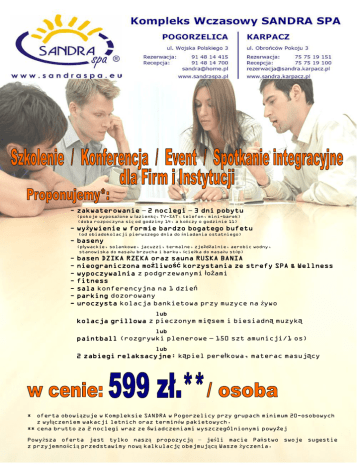 - zakwaterowanie – 2 noclegi – 3 dni pobytu (pokoje wyposażone w łazienkę, TV-SAT, telefon, mini-barek) (doba rozpoczyna się od godziny 14, a kończy o godzinie 11) - wyżywienie w formie bardzo bogatego bufetu (od obiadokolacji pierwszego dnia do śniadania ostatniego) - baseny (pływackie, solankowe, jacuzzi, termalne, zjeżdżalnie, aerobic wodny, stanowiska do masażu brzucha i barku, ścieżka do masażu stóp) - basen DZIKA RZEKA oraz sauna RUSKA BANIA nieograniczona możliwość korzystania ze strefy SPA & Wellness wypoczywalnia z podgrzewanymi łożami fitness sala konferencyjna na 1 dzień parking dozorowany uroczysta kolacja bankietowa przy muzyce na żywo lub kolacja grillowa z pieczonym mięsem i biesiadną muzyką lub paintball (rozgrywki plenerowe – 150 szt amunicji/1 os) lub 2 zabiegi relaksacyjne: kąpiel perełkowa, materac masujący * oferta obowiązuje w Kompleksie SANDRA w Pogorzelicy przy grupach minimum 20-osobowych z wyłączeniem wakacji letnich oraz terminów pakietowych. ** cena brutto za 2 noclegi wraz ze świadczeniami wyszczególnionymi powyżej Powyższa oferta jest tylko naszą propozycją – jeśli macie Państwo swoje sugestie z przyjemnością przedstawimy nową kalkulację obejmującą Wasze życzenia.