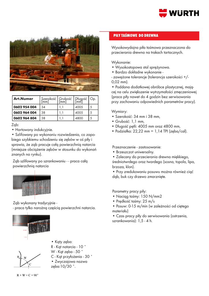 PIŁY TAŚMOWE DO DREWNA Wysokowydajna piła taśmowa przeznaczona do przecierania drewna na trakach tartacznych. Art.Numer Szerokość Grubość Długość Op. [mm] [mm] [mm] 0602 954 004 34 1,1 4005 5 0602 964 004 38 1,1 4005 5 0602 964 804 38 1,1 4800 5 Ząb: • Hartowany indukcyjnie. • Szlifowany po wykonaniu rozwiedzenia, co zapobiega szybkiemu schodzeniu się zębów w oś piły i sprawia, że ząb pracuje całą powierzchnią natarcia (mniejsze obciążenie zębów w stosunku do wykonań znanych na rynku). Wykonanie: • Wysokostopowa stal sprężynowa. • Bardzo dokładne wykonanie - zawężone tolerancje (tolerancja szerokości +/0,02 mm). • Poddana dodatkowej obróbce plastycznej, mającej na celu zwiększenie wytrzymałości zmęczeniowej (praca piły nawet do 4 godzin bez serwisowania przy zachowaniu odpowiednich parametrów pracy). Wymiary: • Szerokość: 34 mm i 38 mm, • Grubość: 1,1 mm, • Długość pętli: 4005 mm oraz 4800 mm, • Podziałka: 22,22 mm = 1,14 TPI (zęba/cal). Ząb szlifowany po szrankowaniu - - praca całą powierzchnią natarcia Przeznaczenie - zastosowanie: • Brzeszczot uniwersalny. • Zalecany do przecierania drewna miękkiego, średniotwrdego oraz twardego (sosna, topola, lipa, brzoza, klon). • Przy zredukowaniu posuwu można również ciąć dąb, buk czy drzewo zmarznięte. Ząb wykonany tradycyjnie - praca tylko narożną częścią powierzchni natarcia. Parametry pracy piły: • Naciąg taśmy: 150 N/mm2 • Prędkość taśmy: 25 m/s • Posuw: 0-15 m/min (w zależności od ciętego materiału) • Czas pracy piły do serwisowania (ostrzenia, szrankowania): 1,5 - 4 h. • Kąty zęba: R - Kąt natarcia - 10 ˚ W - Kąt zęba - 50 ˚ C - Kąt przyłożenia - 30 ˚ • Zwyczajowa nazwa zęba:10/30 ˚.
