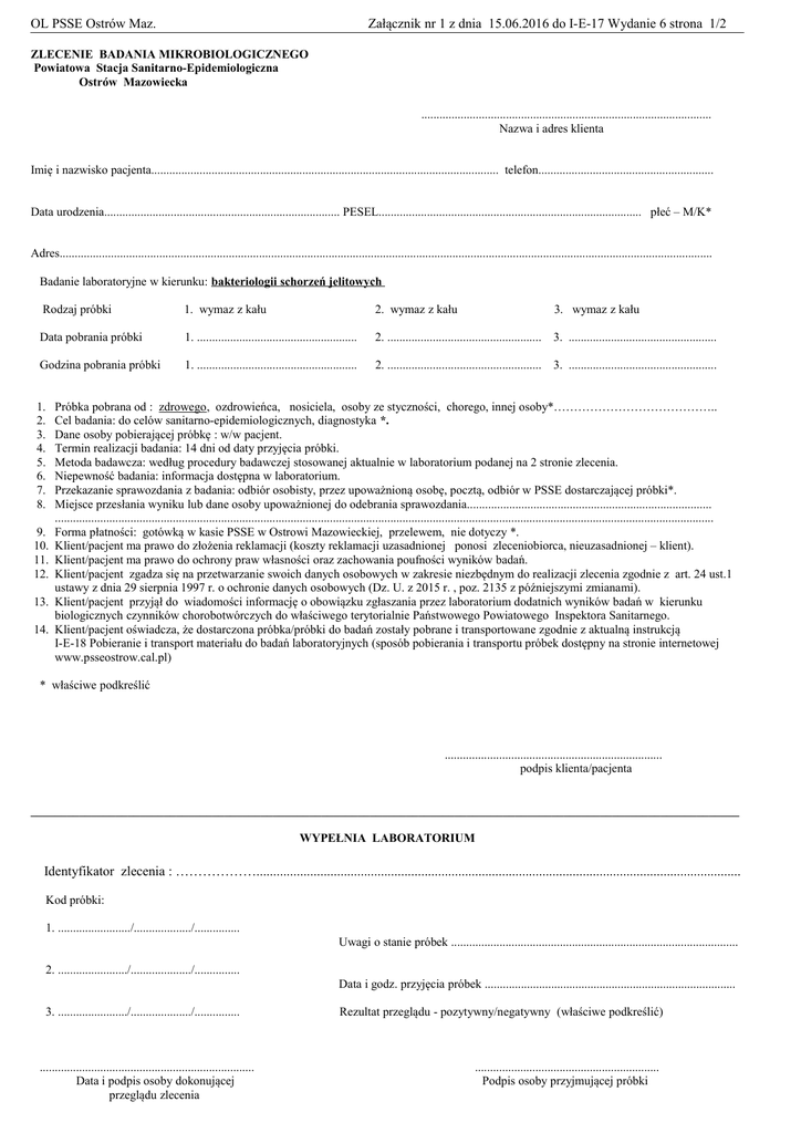 OL PSSE Ostrów Maz. Załącznik nr 1 z dnia 15.06.2016 do I-E-17 Wydanie 6 strona 1/2 ZLECENIE BADANIA MIKROBIOLOGICZNEGO Powiatowa Stacja Sanitarno-Epidemiologiczna Ostrów Mazowiecka ................................................................................................ Nazwa i adres klienta Imię i nazwisko pacjenta................................................................................................................... telefon.......................................................... Data urodzenia.............................................................................. PESEL....................................................................................... płeć – M/K* Adres........................................................................................................................................................................................................................ Badanie laboratoryjne w kierunku: bakteriologii schorzeń jelitowych Rodzaj próbki 1. wymaz z kału 2. wymaz z kału Data pobrania próbki 1. ..................................................... 2. ................................................... 3. ................................................. Godzina pobrania próbki 1. ..................................................... 2. ................................................... 3. ................................................. 1. 2. 3. 4. 5. 6. 7. 8. 9. 10. 11. 12. 13. 14. 3. wymaz z kału Próbka pobrana od : zdrowego, ozdrowieńca, nosiciela, osoby ze styczności, chorego, innej osoby*………………………………….. Cel badania: do celów sanitarno-epidemiologicznych, diagnostyka *. Dane osoby pobierającej próbkę : w/w pacjent. Termin realizacji badania: 14 dni od daty przyjęcia próbki. Metoda badawcza: według procedury badawczej stosowanej aktualnie w laboratorium podanej na 2 stronie zlecenia. Niepewność badania: informacja dostępna w laboratorium. Przekazanie sprawozdania z badania: odbiór osobisty, przez upoważnioną osobę, pocztą, odbiór w PSSE dostarczającej próbki*. Miejsce przesłania wyniku lub dane osoby upoważnionej do odebrania sprawozdania................................................................................. .......................................................................................................................................................................................................................... Forma płatności: gotówką w kasie PSSE w Ostrowi Mazowieckiej, przelewem, nie dotyczy *. Klient/pacjent ma prawo do złożenia reklamacji (koszty reklamacji uzasadnionej ponosi zleceniobiorca, nieuzasadnionej – klient). Klient/pacjent ma prawo do ochrony praw własności oraz zachowania poufności wyników badań. Klient/pacjent zgadza się na przetwarzanie swoich danych osobowych w zakresie niezbędnym do realizacji zlecenia zgodnie z art. 24 ust.1 ustawy z dnia 29 sierpnia 1997 r. o ochronie danych osobowych (Dz. U. z 2015 r. , poz. 2135 z późniejszymi zmianami). Klient/pacjent przyjął do wiadomości informację o obowiązku zgłaszania przez laboratorium dodatnich wyników badań w kierunku biologicznych czynników chorobotwórczych do właściwego terytorialnie Państwowego Powiatowego Inspektora Sanitarnego. Klient/pacjent oświadcza, że dostarczona próbka/próbki do badań zostały pobrane i transportowane zgodnie z aktualną instrukcją I-E-18 Pobieranie i transport materiału do badań laboratoryjnych (sposób pobierania i transportu próbek dostępny na stronie internetowej www.psseostrow.cal.pl) * właściwe podkreślić ........................................................................ podpis klienta/pacjenta _____________________________________________________________________________________________________________________ WYPEŁNIA LABORATORIUM Identyfikator zlecenia : ………………................................................................................................................................................ Kod próbki: 1. ......................../.................../............... Uwagi o stanie próbek ............................................................................................... 2. ......................./..................../............... Data i godz. przyjęcia próbek ................................................................................... 3. ......................./..................../............... ....................................................................... Data i podpis osoby dokonującej przeglądu zlecenia Rezultat przeglądu - pozytywny/negatywny (właściwe podkreślić) ............................................................. Podpis osoby przyjmującej próbki OL PSSE Ostrów Maz. Załącznik nr 1 z dnia 15.06.2016 do I-E-17 Wydanie 6 strona 2/2 Wykaz metod badawczych stosowanych w Sekcji Laboratoryjnej Mikrobiologii Lekarskiej PSSE w Ostrowi Mazowieckiej Numer procedury badawczej Tytuł procedury badawczej Wykrywanie pałeczek jelitowych z rodzaju Salmonella, Shigella (A) Wykrywanie pałeczek z rodzaju Yersinia (A) Wykrywanie enteropatogennych i enterokrwotocznych Escherichia coli w próbkach kału Nr wydania procedury Data wydania procedury PB-E-01 2 01.07.2004 r. PB-E-10 1 12.12.2007 r. PB-E-17 1 19.05.2009 r. (A) – metoda akredytowana (certyfikat PCA Nr AB 581, zakres akredytacji dostępny na www.pca.gov.pl) POBIERANIE I TRANSPORT PRÓBKI WYMAZU Z KAŁU Kał należy oddać (po wcześniejszym opróżnieniu pęcherza moczowego) do czystego, suchego naczynia, z którego następnie pobrać próbkę do badania. Należy zwrócić uwagę czy w kale znajduje się śluz, krew lub ropa i z takich miejsc pobrać próbkę przede wszystkim. Próbkę wymazu z kału pobrać jałową wymazówką z kilku miejsc kału poprzez włożenie do niego wacika umocowanego na patyczku (tzw. wymazówka), obrócenie go kilkukrotne w materiale k