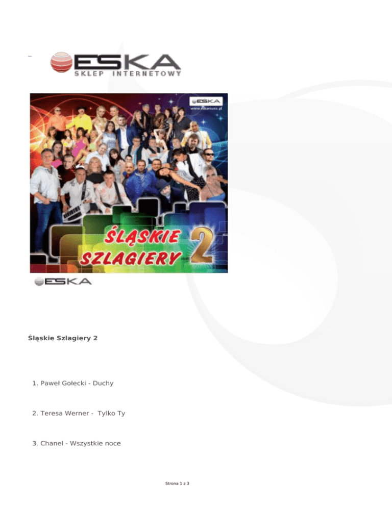 Śląskie Szlagiery 2 1. Paweł Gołecki - Duchy 2. Teresa Werner - Tylko Ty 3. Chanel - Wszystkie noce Strona 1 z 3 4. Blue Party - Dziewczyna ze snów 5. Bogdan Traliszewski - Kiedy jesień powróci 6. Paradise - Dla niej jednej 7. Łysy - Co w życiu mym 8. Dominika i Janusz Żyłka - W ciszy 9. Mariusz Kalaga - Biegnij nad morze! 10. Jacek Silski - Manuela 11. Bez Nazwy - Na zawsze mam w pamięci 12. Jula i Kola - Niespodzianki 13. Adi - Wyspa marzeń 14. Brygida i Robert Łukowski - Zabawa na 102 15. Claudia i Kasia Chwołka - Powiedz mi ukochany 16. Tobi King - Lej wino 17. Karpowicz Family - Gdy mamy siebie Strona 2 z 3 18. Bałkan Express - Nasze róże 19. Golden Mix - Do widzenia Strona 3 z 3