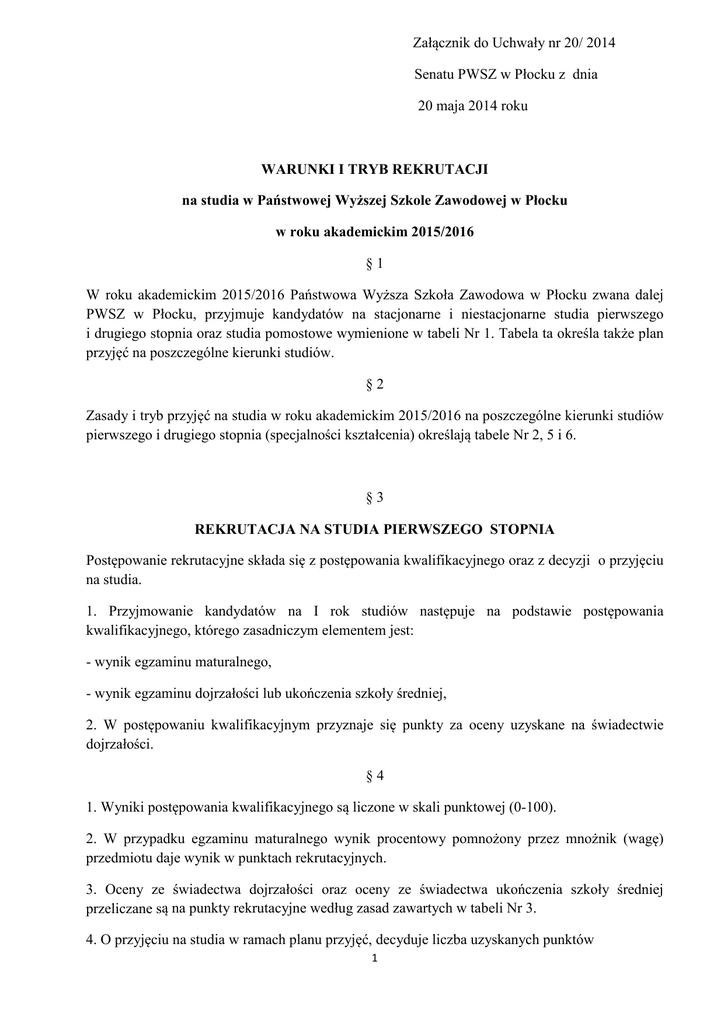 Załącznik do Uchwały nr 20/ 2014 Senatu PWSZ w Płocku z dnia 20 maja 2014 roku WARUNKI I TRYB REKRUTACJI na studia w Państwowej Wyższej Szkole Zawodowej w Płocku w roku akademickim 2015/2016 §1 W roku akademickim 2015/2016 Państwowa Wyższa Szkoła Zawodowa w Płocku zwana dalej PWSZ w Płocku, przyjmuje kandydatów na stacjonarne i niestacjonarne studia pierwszego i drugiego stopnia oraz studia pomostowe wymienione w tabeli Nr 1. Tabela ta określa także plan przyjęć na poszczególne kierunki studiów. §2 Zasady i tryb przyjęć na studia w roku akademickim 2015/2016 na poszczególne kierunki studiów pierwszego i drugiego stopnia (specjalności kształcenia) określają tabele Nr 2, 5 i 6. §3 REKRUTACJA NA STUDIA PIERWSZEGO STOPNIA Postępowanie rekrutacyjne składa się z postępowania kwalifikacyjnego oraz z decyzji o przyjęciu na studia. 1. Przyjmowanie kandydatów na I rok studiów następuje na podstawie postępowania kwalifikacyjnego, którego zasadniczym elementem jest: - wynik egzaminu maturalnego, - wynik egzaminu dojrzałości lub ukończenia szkoły średniej, 2. W postępowaniu kwalifikacyjnym przyznaje się punkty za oceny uzyskane na świadectwie dojrzałości. §4 1. Wyniki postępowania kwalifikacyjnego są liczone w skali punktowej (0-100). 2. W przypadku egzaminu maturalnego wynik procentowy pomnożony przez mnożnik (wagę) przedmiotu daje wynik w punktach rekrutacyjnych. 3. Oceny ze świadectwa dojrzałości oraz oceny ze świadectwa ukończenia szkoły średniej przeliczane są na punkty rekrutacyjne według zasad zawartych w tabeli Nr 3. 4. O przyjęciu na studia w ramach planu przyjęć, decyduje liczba uzyskanych punktów 1 §5 Szczegółowe zasady przyjmowania na studia laureatów oraz finalistów olimpiad stopnia centralnego określa Uchwała Senatu PWSZ w Płocku z dnia 15 maja 2012 roku. §6 1. Obywatele polscy oraz cudzoziemcy, którzy ukończyli szkołę za granicą, oraz uzyskali świadectwo maturalne uczestniczą w postępowaniu kwalifikacyjnym na zasadach określonych dla kandydatów, którzy zdali egzamin maturalny pod warunkiem, że posiadane przez nich świadectwo jest uznawane za świadectwo równorzędne świadectwu dojrzałości na zasadach przewidzianych w umowach międzynarodowych. 2. W razie braku odpowiednich umów międzynarodowych, świadectwa maturalne mogą być w drodze nostryfikacji uznane za równorzędne świadectwom dojrzałości, o ile uprawniają do ubiegania się o przyjęcie na studia wyższe do każdego typu szkół wyższych w państwie w którego systemie edukacji działa instytucja wydająca świadectwo. Zasady i tryb nostryfikacji określają odrębne przepisy. 3. Wynik lub ocenę uzyskaną przez obywateli polskich oraz cudzoziemców, którzy ukończyli szkołę za granicą wyraża się w procentach, a następnie przelicza na punkty rekrutacyjne według zasad obowiązujących osoby, które zdawały egzamin maturalny na poziomie podstawowym. 4. Kandydaci, o których mowa w ustępie 1 i 2 dostarczają świadectwo maturalne ( bądź świadectwo równorzędne) wraz z tłumaczeniem dokonanym przez tłumacza przysięgłego, w przypadku natomiast gdy świadectwo podlegało nostryfikacji kandydat dostarcza także zaświadczenie wydane przez właściwego kuratora oświaty. Zaświadczenie wydane przez kuratora ważne jest łącznie z oryginałem świadectwa uzyskanego za granicą albo jego zalegalizowanym duplikatem. 5. Cudzoziemcy, którzy legitymują się świadectwem dojrzałości uzyskanym w Polsce, uczestniczą w postępowaniu kwalifikacyjnym z zachowaniem zasad ustalonych dla obywateli polskich, którzy ukończyli szkołę średnią w Polsce. 6. Na zasadach określonych w odrębnych przepisach, cudzoziemcy mogą być przyjmowani na pierwszy rok studiów z pominięciem postępowania kwalifikacyjnego określonego w niniejszej uchwale. 7. Obywatel polski, który ukończył studia za granicą może ubiegać się o przyjęcie na studia drugiego stopnia, jeżeli legitymuje się zalegalizowanym lub opatrzonym apostille dyplomem, lub innym dokumentem ukończenia uczelni za granicą, uprawniającym do podjęcia studiów drugiego stopnia w państwie, w którym został wydany, uznanym, zgodnie z przepisami w sprawie nostryfikacji dyplomów ukończenia studiów wyższych uzyskanych za granicą lub na podstawie umowy międzynarodowej za równorzędny z odpowiednim polskim dyplomem ukończenia studiów pierwszego stopnia. 8. Na zasadach określonych w odrębnych przepisach, cudzoziemcy mogą być przyjmowani na pierwszy rok studiów drugiego stopnia z pominięciem postępowania kwalifikacyjnego określonego w niniejszej uchwale. 2 §7 Kandydaci posiadający dyplom Matury Międzynarodowej (IB) traktowani są, jak osoby posiadające świadectwo dojrzałości uzyskane w trybie egzaminu maturalnego. Zasady przyjęć dla kandydatów z Maturą Międzynarodową (IB): 1. Obowiązują takie same kryteria jak kandydatów z egzaminem maturalnym (Tabela Nr 2) 2. Poziom SL traktowany jest jako poziom podstawowy (PP) 3. Poziom HL traktowany jest jako poziom rozszerzony (PR) 4. Jeśli na danym kierunku stosowane są przeliczniki dla danego przedmiotu czy poziomu egzaminu, mają one również zastosowanie do matury międzynarodowej, przeliczonej na wyniki egzaminu maturalnego, dla odpowiedniego poziomu. 5. Przelicznik wyników na świadectwie matury międzynarodowej określa tabela Nr 4. §8 REKRUTACJA NA STUDIA DRUGIEGO STOPNIA 1. O przyjęcie na studia drugiego stopnia mogą ubiegać się absolwenci co najmniej pierwszego stopnia studiów. 2. Podstawą zakwalifikowania na studia jest średnia ocen uzyskana podczas odbytych studiów pierwszego stopnia, drugiego stopnia lub jednolitych studiów magisterskich (wyliczona z dokładnością do dwóch miejsc po przecinku oraz ocena na dyplomie przeliczona na punkty rekrutacyjne), z zastrzeżeniem ust. 3 (tabela nr 5 i 6). 3. Kandydat ubiegający się o przyjęcie na studia drugiego stopnia / na kier