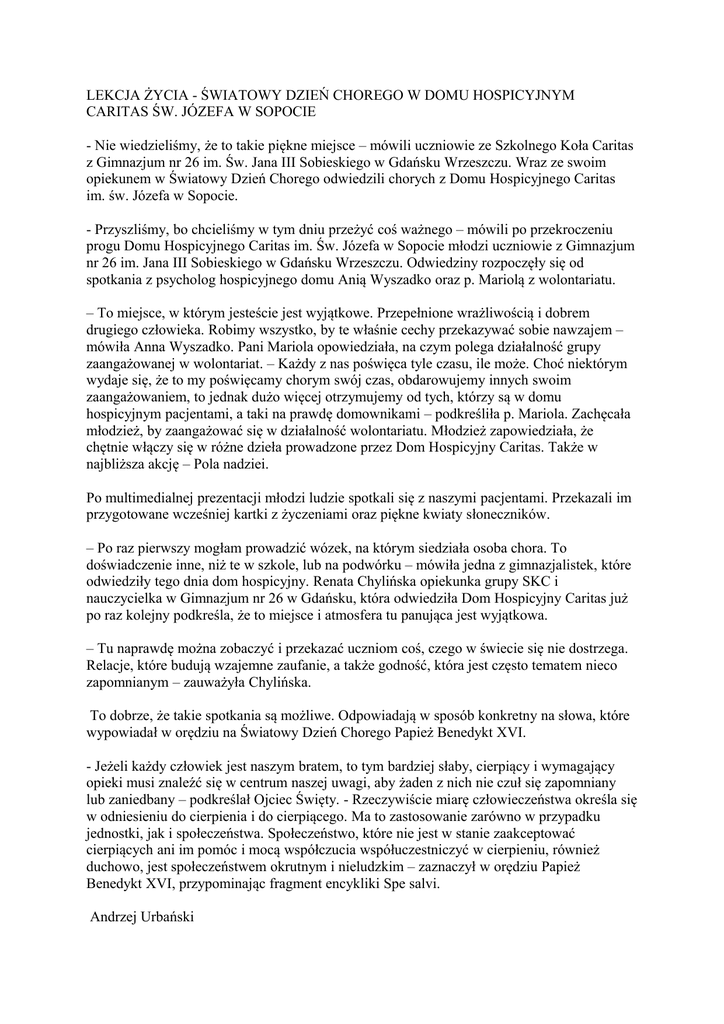 LEKCJA ŻYCIA - ŚWIATOWY DZIEŃ CHOREGO W DOMU HOSPICYJNYM CARITAS ŚW. JÓZEFA W SOPOCIE - Nie wiedzieliśmy, że to takie piękne miejsce – mówili uczniowie ze Szkolnego Koła Caritas z Gimnazjum nr 26 im. Św. Jana III Sobieskiego w Gdańsku Wrzeszczu. Wraz ze swoim opiekunem w Światowy Dzień Chorego odwiedzili chorych z Domu Hospicyjnego Caritas im. św. Józefa w Sopocie. - Przyszliśmy, bo chcieliśmy w tym dniu przeżyć coś ważnego – mówili po przekroczeniu progu Domu Hospicyjnego Caritas im. Św. Józefa w Sopocie młodzi uczniowie z Gimnazjum nr 26 im. Jana III Sobieskiego w Gdańsku Wrzeszczu. Odwiedziny rozpoczęły się od spotkania z psycholog hospicyjnego domu Anią Wyszadko oraz p. Mariolą z wolontariatu. – To miejsce, w którym jesteście jest wyjątkowe. Przepełnione wrażliwością i dobrem drugiego człowieka. Robimy wszystko, by te właśnie cechy przekazywać sobie nawzajem – mówiła Anna Wyszadko. Pani Mariola opowiedziała, na czym polega działalność grupy zaangażowanej w wolontariat. – Każdy z nas poświęca tyle czasu, ile może. Choć niektórym wydaje się, że to my poświęcamy chorym swój czas, obdarowujemy innych swoim zaangażowaniem, to jednak dużo więcej otrzymujemy od tych, którzy są w domu hospicyjnym pacjentami, a taki na prawdę domownikami – podkreśliła p. Mariola. Zachęcała młodzież, by zaangażować się w działalność wolontariatu. Młodzież zapowiedziała, że chętnie włączy się w różne dzieła prowadzone przez Dom Hospicyjny Caritas. Także w najbliższa akcję – Pola nadziei. Po multimedialnej prezentacji młodzi ludzie spotkali się z naszymi pacjentami. Przekazali im przygotowane wcześniej kartki z życzeniami oraz piękne kwiaty słoneczników. – Po raz pierwszy mogłam prowadzić wózek, na którym siedziała osoba chora. To doświadczenie inne, niż te w szkole, lub na podwórku – mówiła jedna z gimnazjalistek, które odwiedziły tego dnia dom hospicyjny. Renata Chylińska opiekunka grupy SKC i nauczycielka w Gimnazjum nr 26 w Gdańsku, która odwiedziła Dom Hospicyjny Caritas już po raz kolejny podkreśla, że to miejsce i atmosfera tu panująca jest wyjątkowa. – Tu naprawdę można zobaczyć i przekazać uczniom coś, czego w świecie się nie dostrzega. Relacje, które budują wzajemne zaufanie, a także godność, która jest często tematem nieco zapomnianym – zauważyła Chylińska. To dobrze, że takie spotkania są możliwe. Odpowiadają w sposób konkretny na słowa, które wypowiadał w orędziu na Światowy Dzień Chorego Papież Benedykt XVI. - Jeżeli każdy człowiek jest naszym bratem, to tym bardziej słaby, cierpiący i wymagający opieki musi znaleźć się w centrum naszej uwagi, aby żaden z nich nie czuł się zapomniany lub zaniedbany – podkreślał Ojciec Święty. - Rzeczywiście miarę człowieczeństwa określa się w odniesieniu do cierpienia i do cierpiącego. Ma to zastosowanie zarówno w przypadku jednostki, jak i społeczeństwa. Społeczeństwo, które nie jest w stanie zaakceptować cierpiących ani im pomóc i mocą współczucia współuczestniczyć w cierpieniu, również duchowo, jest społeczeństwem okrutnym i nieludzkim – zaznaczył w orędziu Papież Benedykt XVI, przypominając fragment encykliki Spe salvi. Andrzej Urbański