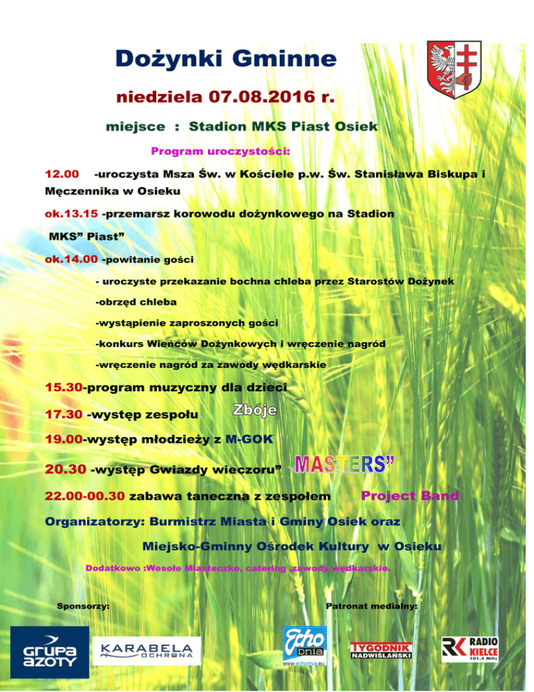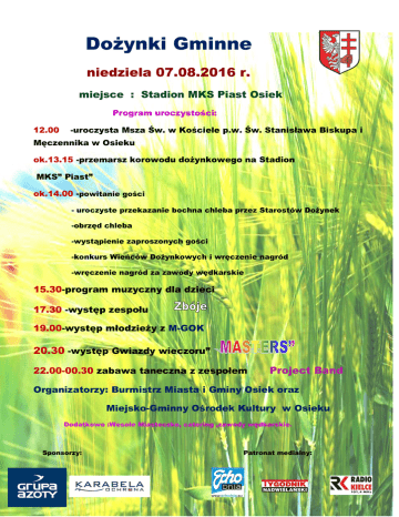 Dożynki Gminne niedziela 07.08.2016 r. miejsce : Stadion MKS Piast Osiek Program uroczystości: 12.00 -uroczysta Msza Św. w Kościele p.w. Św. Stanisława Biskupa i Męczennika w Osieku ok.13.15 -przemarsz korowodu dożynkowego na Stadion MKS” Piast” ok.14.00 -powitanie gości - uroczyste przekazanie bochna chleba przez Starostów Dożynek -obrzęd chleba -wystąpienie zaproszonych gości -konkurs Wieńców Dożynkowych i wręczenie nagród -wręczenie nagród za zawody wędkarskie 15.30-program muzyczny dla dzieci 17.30 -występ zespołu 19.00-występ młodzieży z M-GOK 20.30 -występ Gwiazdy wieczoru” 22.00-00.30 zabawa taneczna z zespołem Project Band Organizatorzy: Burmistrz Miasta i Gminy Osiek oraz Miejsko-Gminny Ośrodek Kultury w Osieku Dodatkowo :Wesołe Miasteczko, catering ,zawody wędkarskie. Sponsorzy: Patronat medialny:
