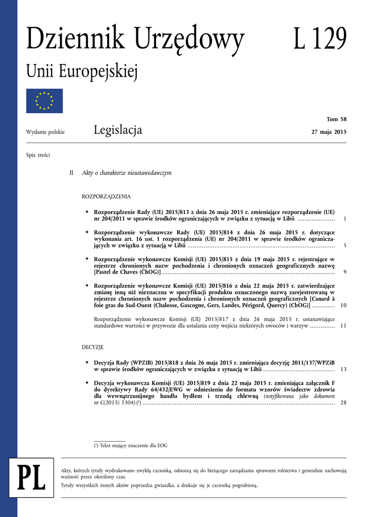 Dziennik Urzędowy L 129 Unii Europejskiej ★ ★ ★ ★ ★ ★ ★ ★ ★ ★ ★ ★ Tom 58 Legislacja Wydanie polskie 27 maja 2015 Spis treści II Akty o charakterze nieustawodawczym ROZPORZĄDZENIA ★ ★ ★ ★ Rozporządzenie Rady (UE) 2015/813 z dnia 26 maja 2015 r. zmieniające rozporządzenie (UE) nr 204/2011 w sprawie środków ograniczających w związku z sytuacją w Libii ..................... 1 Rozporządzenie wykonawcze Rady (UE) 2015/814 z dnia 26 maja 2015 r. dotyczące wykonania art. 16 ust. 1 rozporządzenia (UE) nr 204/2011 w sprawie środków ograniczających w związku z sytuacją w Libii .................................................................................. 5 Rozporządzenie wykonawcze Komisji (UE) 2015/815 z dnia 19 maja 2015 r. rejestrujące w rejestrze chronionych nazw pochodzenia i chronionych oznaczeń geograficznych nazwę [Pastel de Chaves (ChOG)] ................................................................................................ 9 Rozporządzenie wykonawcze Komisji (UE) 2015/816 z dnia 22 maja 2015 r. zatwierdzające zmianę inną niż nieznaczna w specyfikacji produktu oznaczonego nazwą zarejestrowaną w rejestrze chronionych nazw pochodzenia i chronionych oznaczeń geograficznych [Canard à foie gras du Sud-Ouest (Chalosse, Gascogne, Gers, Landes, Périgord, Quercy) (ChOG)] ............. 10 Rozporządzenie wykonawcze Komisji (UE) 2015/817 z dnia 26 maja 2015 r. ustanawiające standardowe wartości w przywozie dla ustalania ceny wejścia niektórych owoców i warzyw .............. 11 DECYZJE ★ Decyzja Rady (WPZIB) 2015/818 z dnia 26 maja 2015 r. zmieniająca decyzję 2011/137/WPZiB w sprawie środków ograniczających w związku z sytuacją w Libii ........................................ 13 ★ Decyzja wykonawcza Komisji (UE) 2015/819 z dnia 22 maja 2015 r. zmieniająca załącznik F do dyrektywy Rady 64/432/EWG w odniesieniu do formatu wzorów świadectw zdrowia dla wewnątrzunijnego handlu bydłem i trzodą chlewną (notyfikowana jako dokument nr C(2015) 3304) (1) ........................................................................................................... 28 (1) Tekst mający znaczenie dla EOG PL (Ciąg dalszy na następnej stronie) Akty, których tytuły wydrukowano zwykłą czcionką, odnoszą się do bieżącego zarządzania sprawami rolnictwa i generalnie zachowują ważność przez określony czas. Tytuły wszystkich innych aktów poprzedza gwiazdka, a drukuje się je czcionką pogrubioną. ★ Decyzja wykonawcza Komisji (UE) 2015/820 z dnia 22 maja 2015 r. zmieniająca decyzję wykonawczą 2014/709/UE w sprawie środków kontroli w zakresie zdrowia zwierząt w odniesieniu do afrykańskiego pomoru świń w niektórych państwach członkowskich (notyfikowana jako dokument nr C(2015) 3373) (1) ...................................................................... 41 AKTY PRZYJĘTE PRZEZ ORGANY UTWORZONE NA MOCY UMÓW MIĘDZYNARODOWYCH ★ Decyzja Rady Stabilizacji i Stowarzyszenia UE–Albania nr 1 z dnia 11 maja 2015 r. zastępująca Protokół 4 do Układu o stabilizacji i stowarzyszeniu między Wspólnotami Europejskimi i ich państwami członkowskimi, z jednej strony, a Republiką Albanii, z drugiej strony, w sprawie definicji pojęcia „produkty pochodzące” oraz metod współpracy administracyjnej [2015/821] ...................................................................................................... 50 Sprostowania ★ Sprostowanie do dyrektywy Rady (UE) 2015/652 z dnia 20 kwietnia 2015 r. ustanawiającej metody obliczania i wymogi w zakresie sprawozdawczości zgodnie z dyrektywą 98/70/WE Parlamentu Europejskiego i Rady odnoszącą się do jakości benzyny i olejów napędowych (Dz.U. L 107 z 25.4.2015) ................................................................................................. 53 (1) Tekst mający znaczenie dla EOG 27.5.2015 Dziennik Urzędowy Unii Europejskiej PL L 129/1 II (Akty o charakterze nieustawodawczym) ROZPORZĄDZENIA ROZPORZĄDZENIE RADY (UE) 2015/813 z dnia 26 maja 2015 r. zmieniające rozporządzenie (UE) nr 204/2011 w sprawie środków ograniczających w związku z sytuacją w Libii RADA UNII EUROPEJSKIEJ, uwzględniając Traktat o funkcjonowaniu Unii Europejskiej, w szczególności jego art. 215, uwzględniając decyzję Rady 2011/137/WPZiB z dnia 28 lutego 2011 r. w sprawie środków ograniczających w związku z sytuacją w Libii (1), uwzględniając wspólny wniosek Wysokiego Przedstawiciela Unii do Spraw Zagranicznych i Polityki Bezpieczeństwa oraz Komisji Europejskiej, a także mając na uwadze, co następuje: (1) Rozporządzenie Rady (UE) nr 204/2011 (2) nadaje skuteczność środkom przewidzianym w decyzji 2011/137/WPZiB. (2) Dnia 27 marca 2015 r. Rada Bezpieczeństwa Organizacji Narodów Zjednoczonych (RB ONZ) przyjęła rezolucję nr 2213 (2015) przewidującą między innymi wprowadzenie pewnych zmian do kryteriów w zakresie stosowania środków dotyczących ograniczenia podróżowania oraz zamrażania aktywów. (3) Komitet Rady Bezpieczeństwa ustanowiony na mocy rezolucji RB ONZ nr 1970 (2011) uaktualnił wykaz osób i podmiotów objętych ograniczeniem podróżowania i zamrożeniem aktywów, między innymi poprzez podanie informacji o podmiotach, których środki finansowe zamrożone dnia 16 września 2011 r. mają pozostać zamrożone. (4) Dnia 26 maja 2015 r. decyzja Rady 2011/137/WPZiB została zmieniona decyzją Rady (WPZiB) 2015/818 (3), aby nadać skuteczność środkom przyjętym w rezolucji RB ONZ nr 2213 (2015) oraz aby przewidzieć zastosowanie zamrażania aktywów, jak określono w rezolucji RB ONZ nr 2213 (2015), w odniesieniu do innych osób i podmiotów niewymienionych w załączniku I, III lub VII do decyzji 2011/137/WPZiB. Rada zmieniła również kryteria zastosowania środków dotyczących ograniczenia podróżowania i zamrażania aktywów w odniesieniu do osób, podmiotów i organów wymienionych w załącznikach