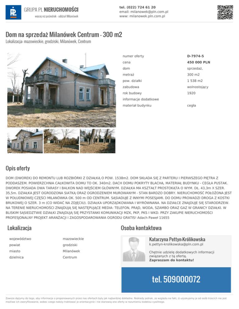 tel. (022) 724 61 20 email: [email protected] www: milanowek.pln.com.pl Dom na sprzedaż Milanówek Centrum - 300 m2 Lokalizacja: mazowieckie, grodziski, Milanówek, Centrum numer oferty D-7974-5 cena 450 000 PLN dom sprzedaż, metraż 300 m2 pow. działki 1 538 m2 zabudowa wolnostojący rok budowy 1920 informacje dodatkowe materiał budynku cegła Opis oferty DOM (DWOREK) DO REMONTU LUB ROZBIÓRKI Z DZIAŁKĄ O POW. 1538m2. DOM SKŁADA SIĘ Z PARTERU I PIERWSZEGO PIĘTRA Z PODDASZEM. POWIERZCHNIA CAŁKOWITA DOMU TO OK. 340m2. DACH DOMU POKRYTY BLACHĄ. MATERIAŁ BUDYNKU - CEGŁA PUSTAK. DWOREK POSIADA DWA TARASY I BALKON NAD WEJŚCIEM GŁÓWNYM. DZIAŁKA MA KSZTAŁT PROSTOKĄTA O WYM. DŁ. 43,3m X SZER. 35,5m. DZIAŁKA JEST OGRODZONA SIATKĄ ORAZ OGRODZENIEM MUROWANYM - STAN BARDZO DOBRY. NIERUCHOMOŚĆ POŁOŻONA JEST W POŁUDNIOWEJ CZĘŚCI MILANÓWKA OK. 500 m OD CENTRUM. SĄSIADUJE Z INNYMI POSESJAMI. DO DOMU PROWADZI DROGA Z KOSTKI BRUKOWEJ O SZER. 3 m (CO WIDAĆ NA ZDJĘCIU). DZIAŁKA UPORZĄDKOWANA I WYRÓWNANA. NA DZIAŁCE ZNAJDUJE SIĘ STARODRZEW. NA TERENIE NIERUCHOMOŚCI ZNAJDUJĄ SIĘ NASTĘPUJĄCE MEDIA: TELEFON, PRĄD, WODA, SZAMBO ORAZ GAZ W GRANICY DZIAŁKI. W BLISKIM SĄSIEDZTWIE DZIAŁKI ZNAJDUJĄ SIĘ PRZYSTANKI KOMUNIKACJI MZK, PKP, PKS I WKD. PRZY ZAKUPIE NIERUCHOMOŚCI PROFESJONALNY PROJEKT ARANŻACJI I ZAGOSPODAROWANIA OGRODU GRATIS! Adach Paweł 11655 Lokalizacja Osoba kontaktowa Katarzyna Pettyn-Królikowska województwo mazowieckie powiat grodziski [email protected] miasto Milanówek dzielnica Centrum Chętnie udzielę dodatkowych informacji związanych z tą ofertą. Zapraszam do kontaktu! tel. 509000072 Zawsze dążymy do tego, aby informacje o proponowanych przez nas ofertach były jak najbardziej dokładne. Niekiedy jednak, ze względu na fakt, iż uzyskujemy je od osób trzecich nie jest możliwe ich zweryfikowanie, wobec czego należy traktować je orientacyjnie i nie stanowią one oferty w rozumieniu kodeksu cywilnego.